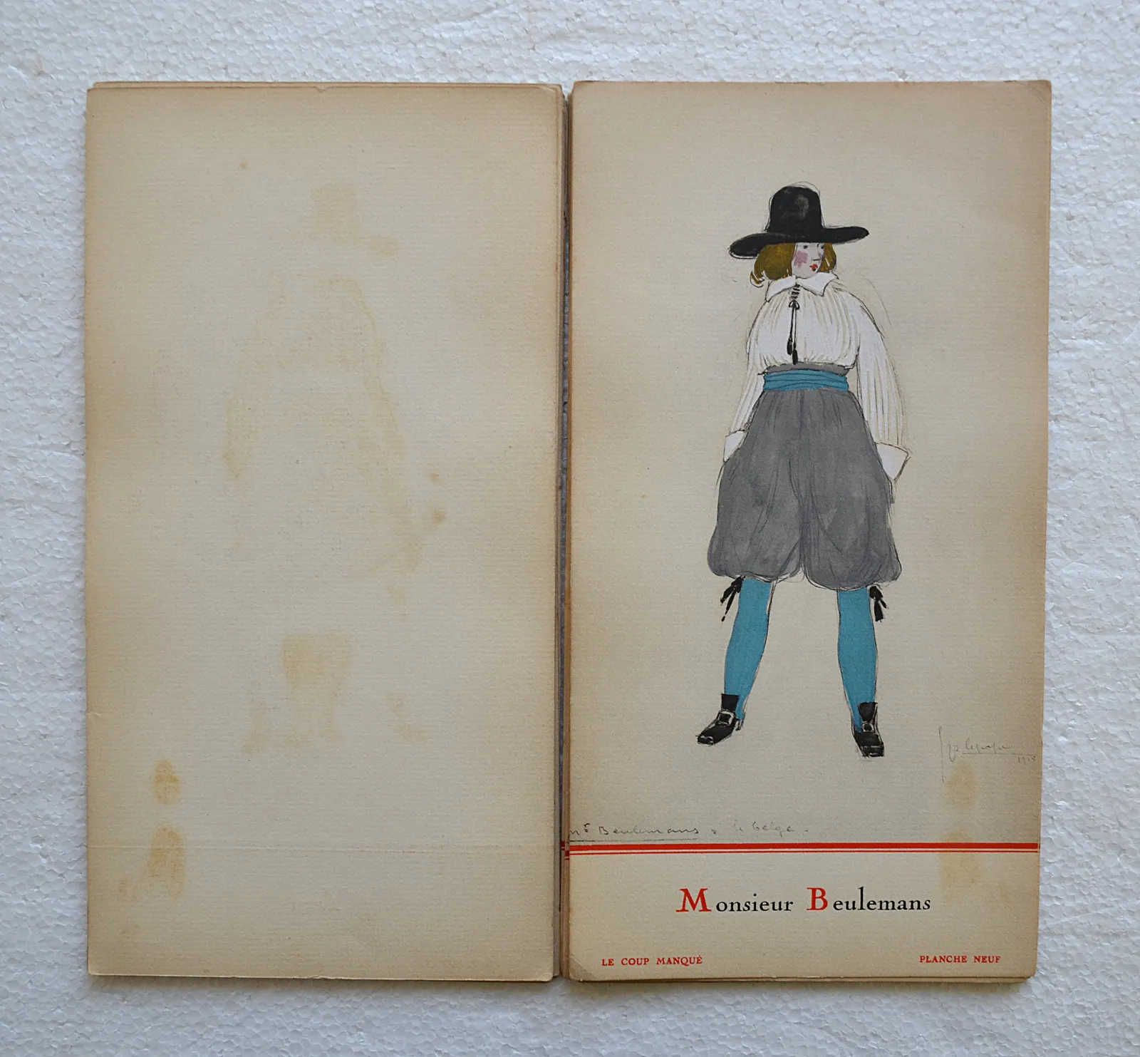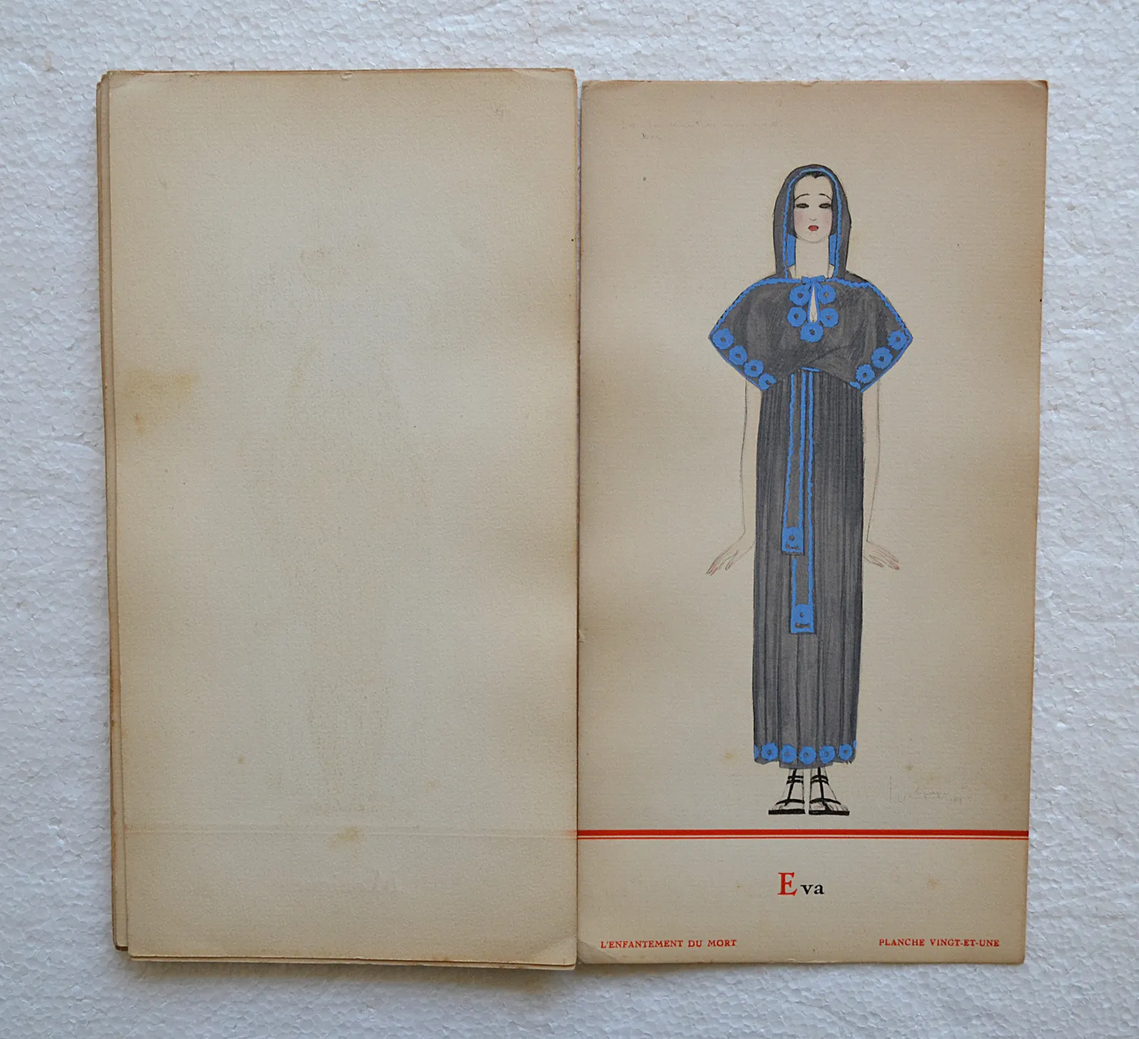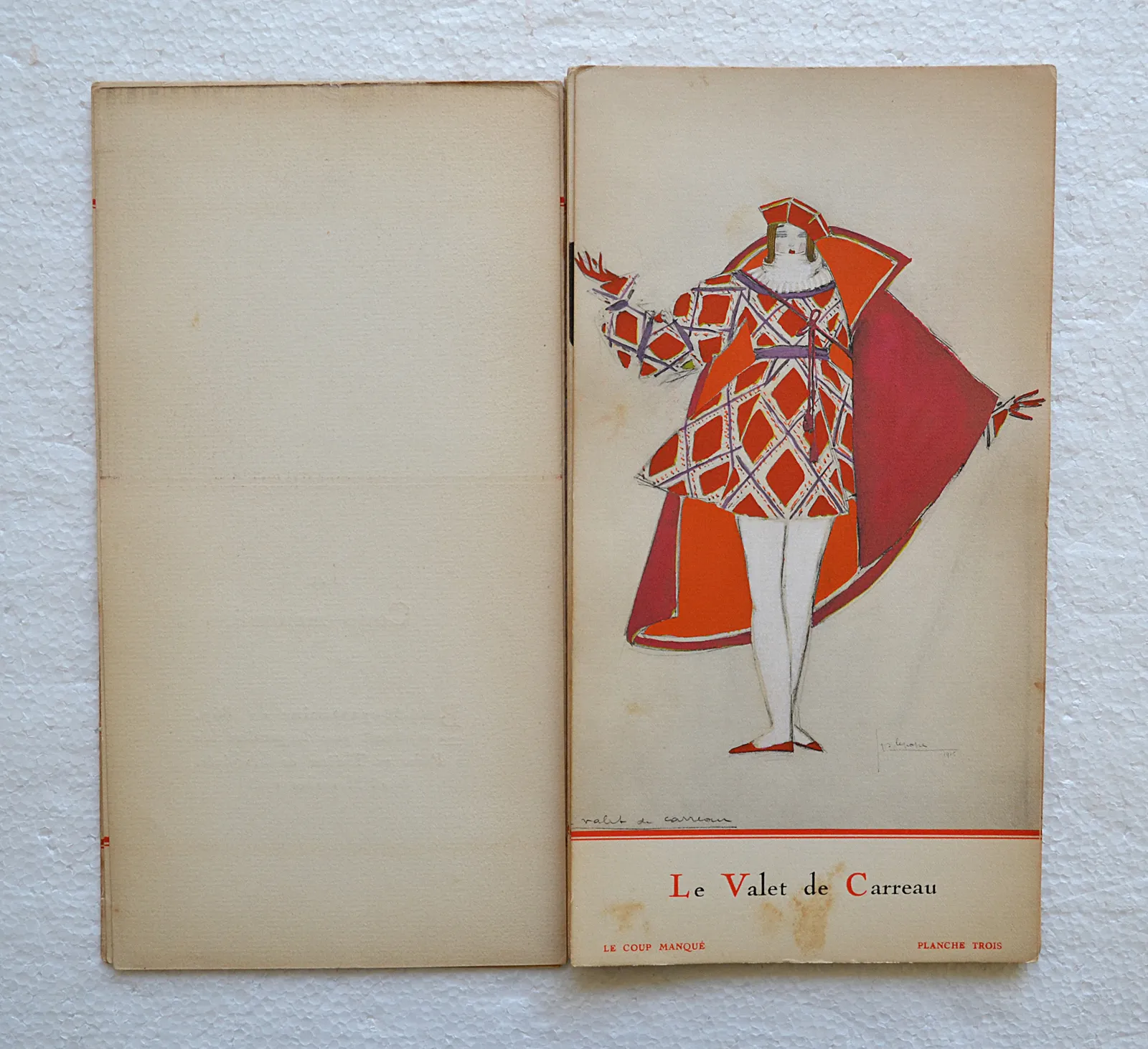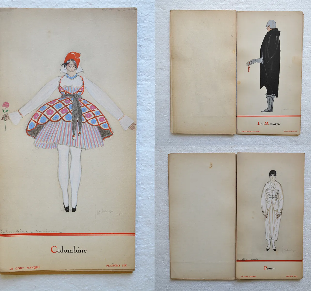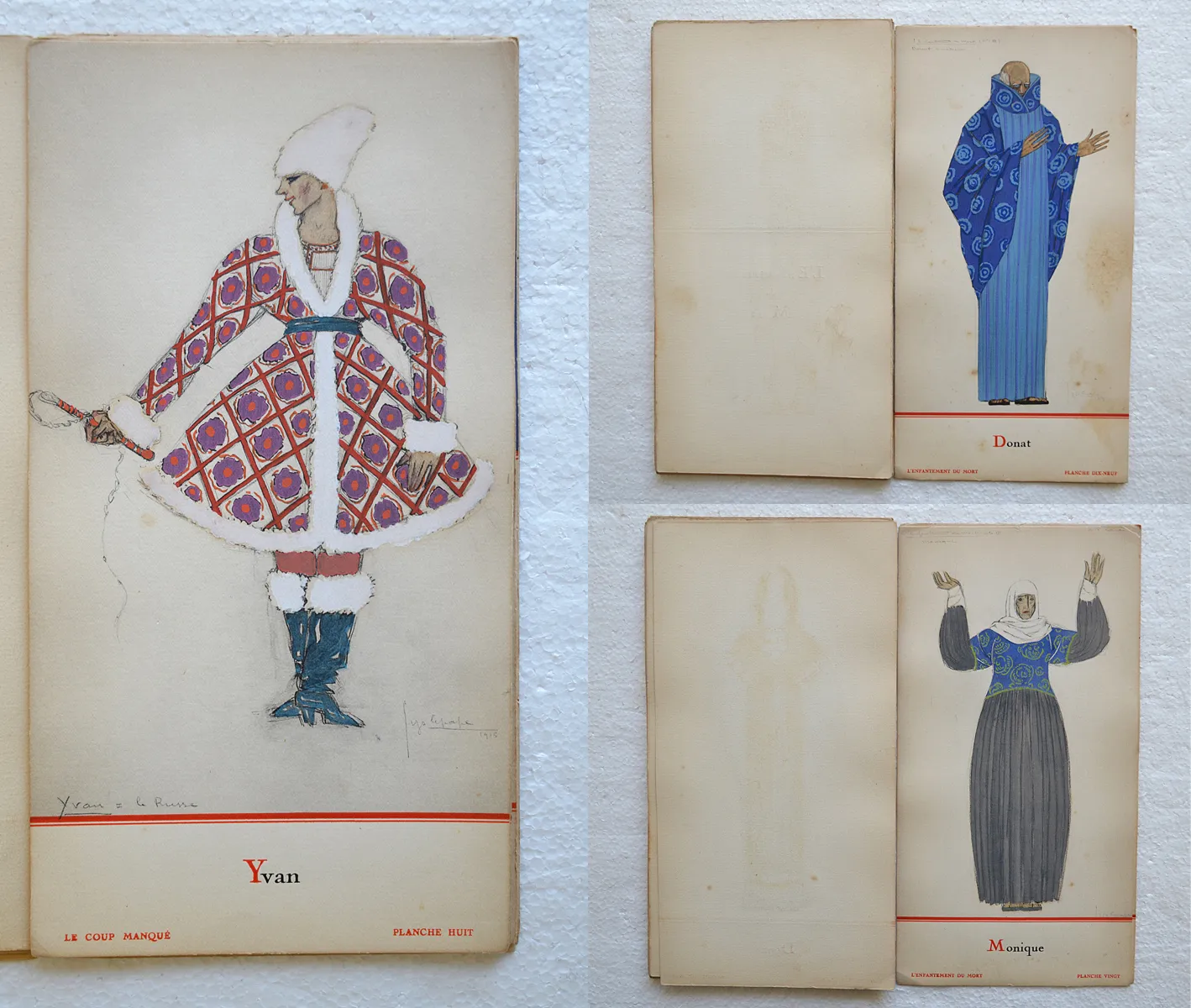 Très rare recueil préfacé sur deux feuillets par Henry Bidou, comprenant 21 compositions de Georges Lepape, reproduites en phototypie par L. Deley et coloriées au pochoir par J. Saudé, soit un titre, un décor et 9 costumes pour Le Coup manqué, ballet-pantomime de Rip, représenté pour la première fois au Théâtre de l’Athénée le 25 novembre 1915, et 2 décors et 8 costumes pour L’Enfantement du Mort, miracle composé par Marcel L’Herbier, représenté pour la première fois au Théâtre Édouard VII le 11 avril 1919.