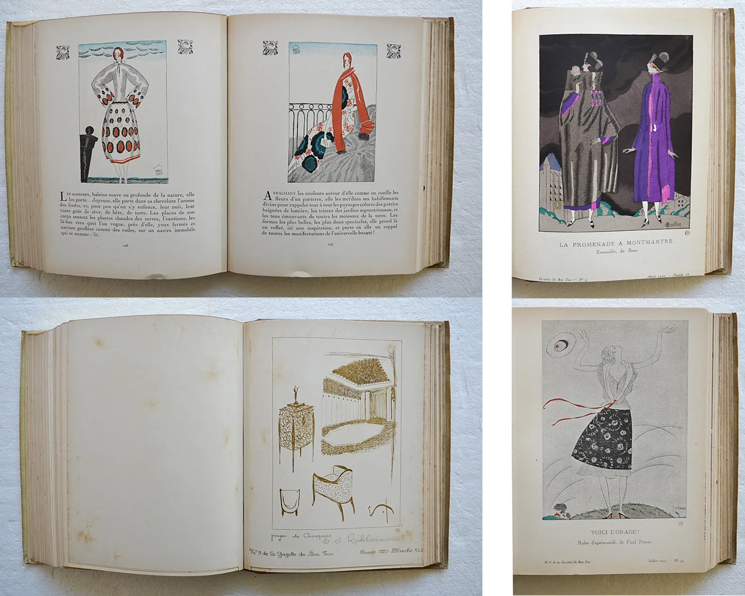 Ces cinq premiers numéros de l’année 1920 contiennent 39 planches hors-texte rehaussées au pochoir, dessinées par les meilleurs illustrateurs (Lepape, Brissaud, Bénito, Marty, Barjansky, etc.), et 24 croquis hors-texte (sur 28). On trouve également dans les articles de nombreuses illustrations in-texte rehaussées au pochoir ainsi que des publicités pour des maisons de qualité. Le fascicule d’avril contient un article illustré de 7 croquis in-texte de Kees Van Dongen.