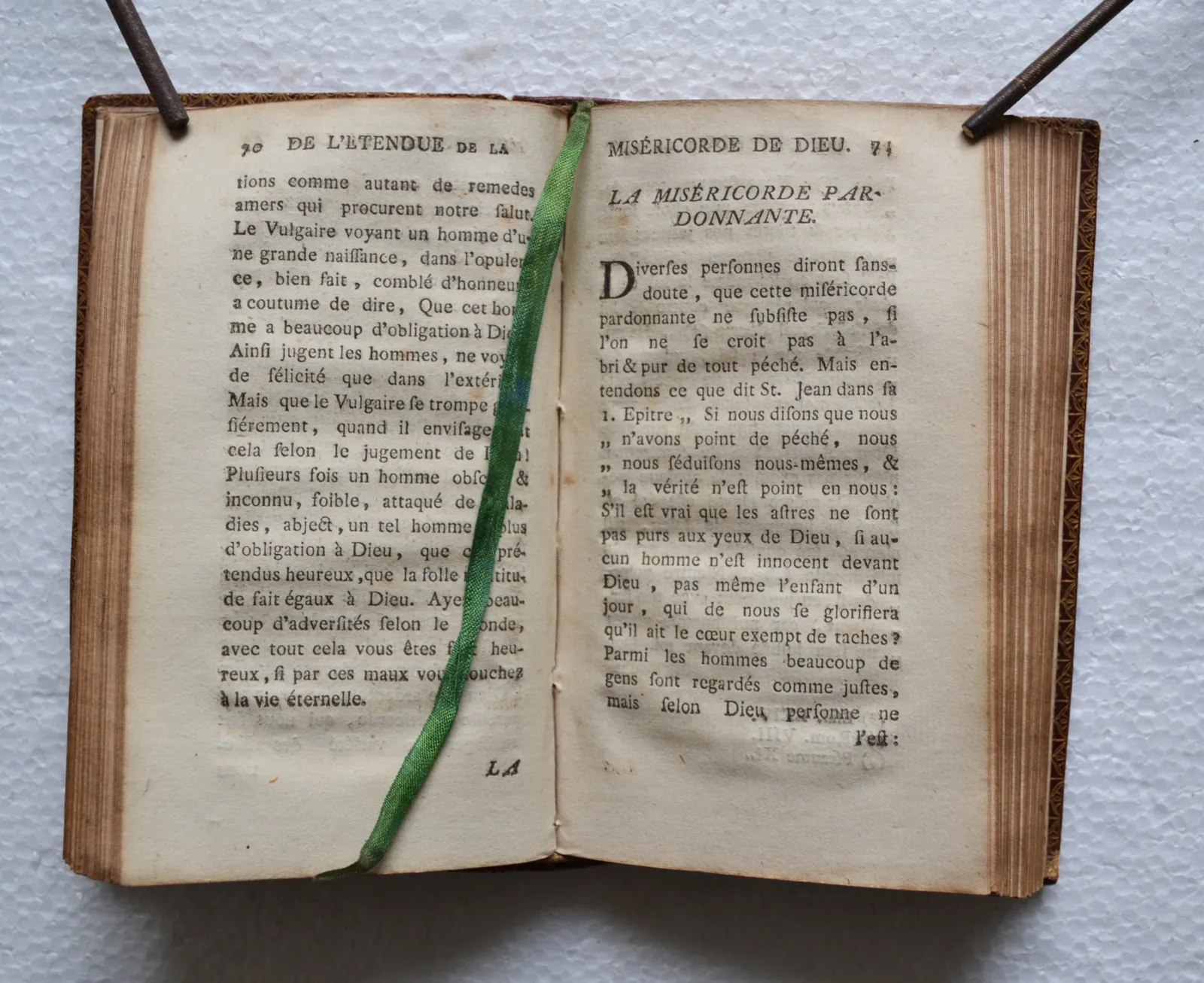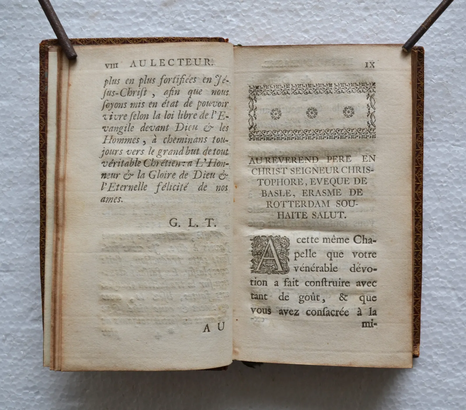 Un volume in-12 (8,3 x 13,5 cm.) de XII – 220 pp. – (1f.) ; maroquin rouge, large roulette dorée dans un encadrement de filets dorés, dos à nerfs richement orné de fleurons à motif floral, roulette dorée sur les coupes et à l’intérieur, tranches dorées (reliure de l’époque).