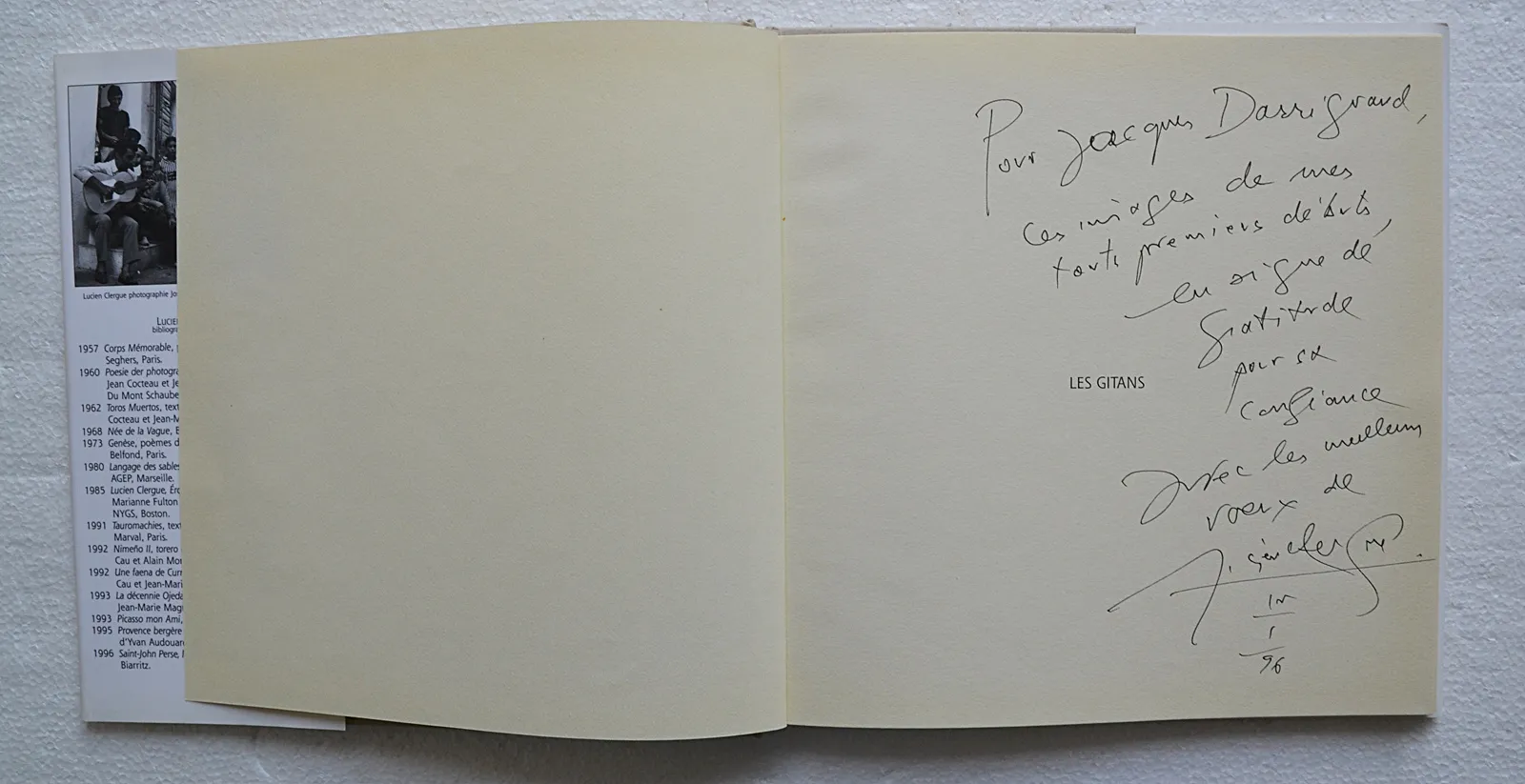 Important envoi autographe de Lucien Clergue à Jacques Darrigrand, préface de Jean Cocteau, introduction de Tony Gatlif.