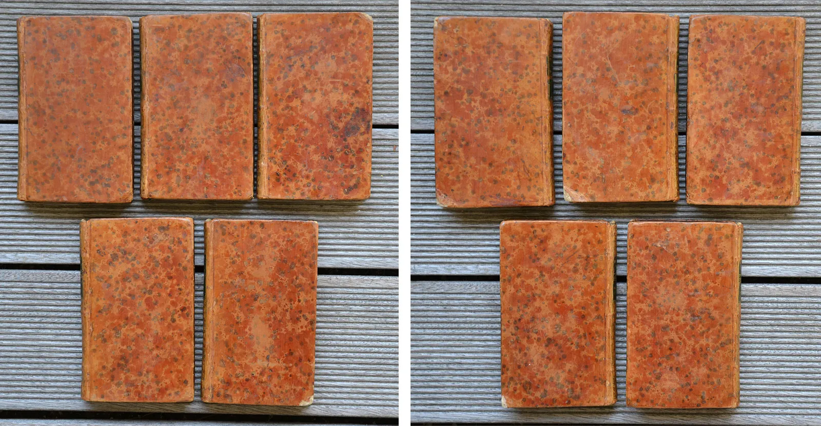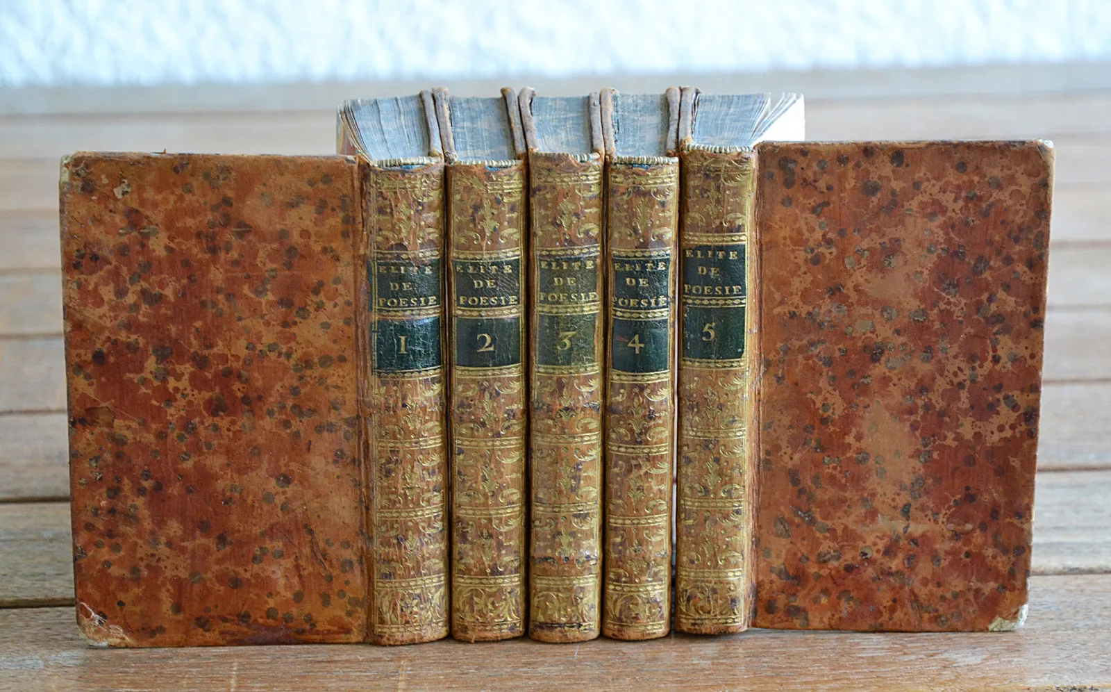 Cinq volumes in-12 (9,3 x 15,3 cm.) de (2ff.) – LXIV – 271 pp. + (2ff.) – 321 pp. + (2ff.) – 325 pp. + (2ff.) – 262 pp. – XXXIX + (2ff.) – 310 pp. ; veau fauve moucheté, dos lisses ornés, pièces de titre & de tomaison en veau vert, tranches marbrées (reliure de l’époque).