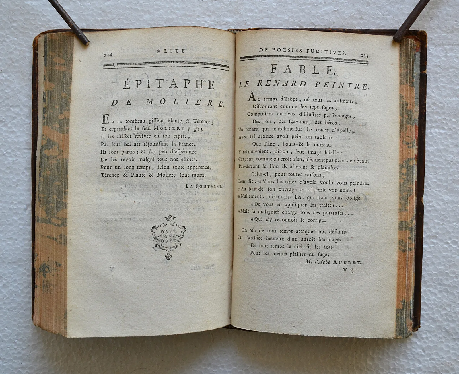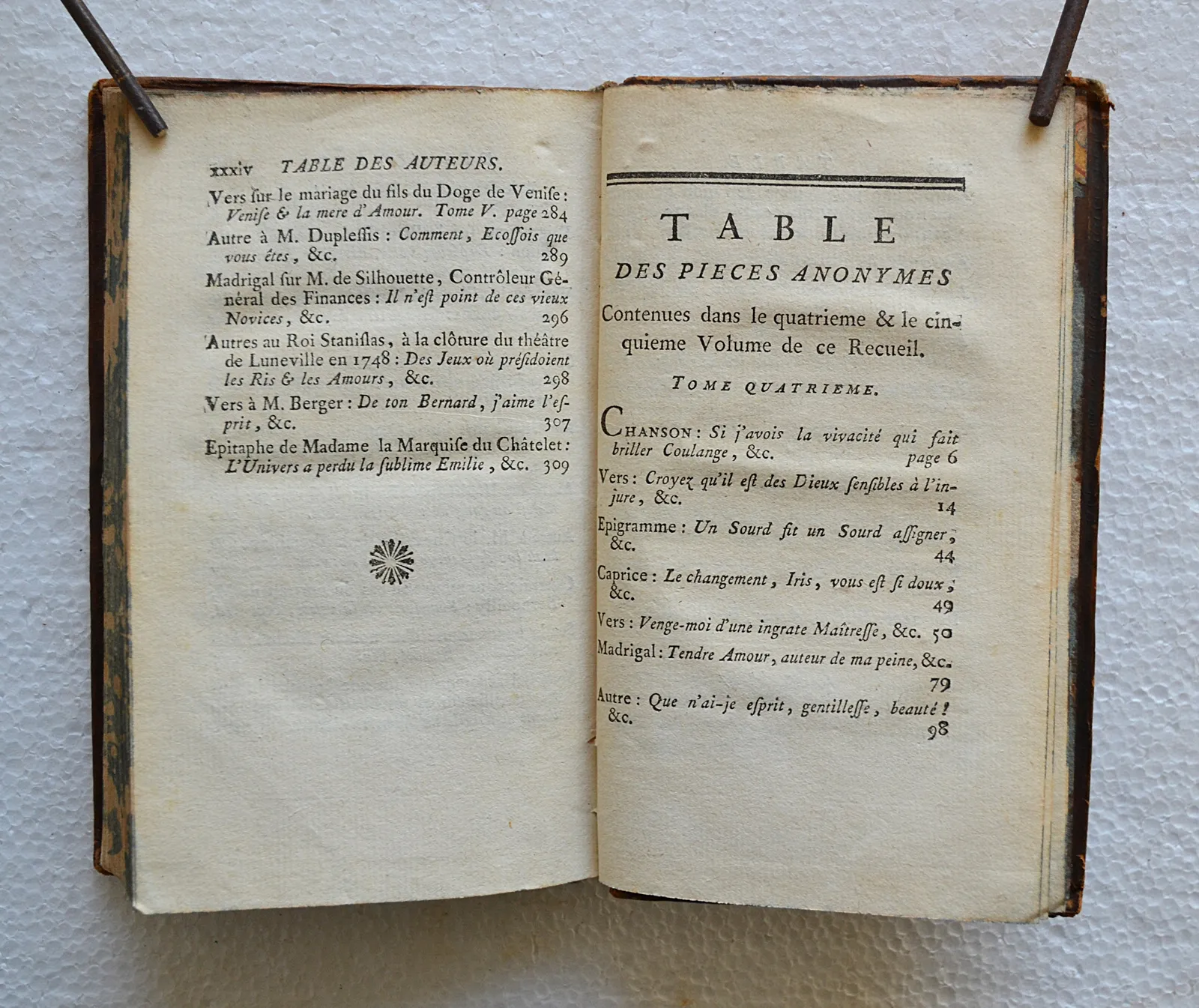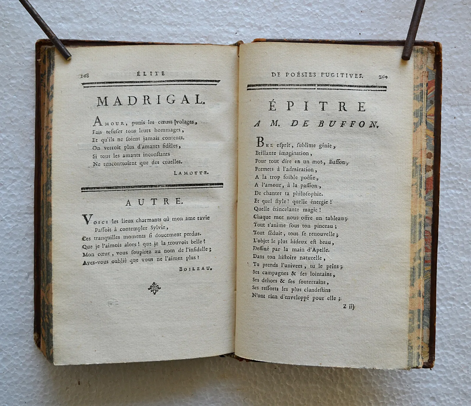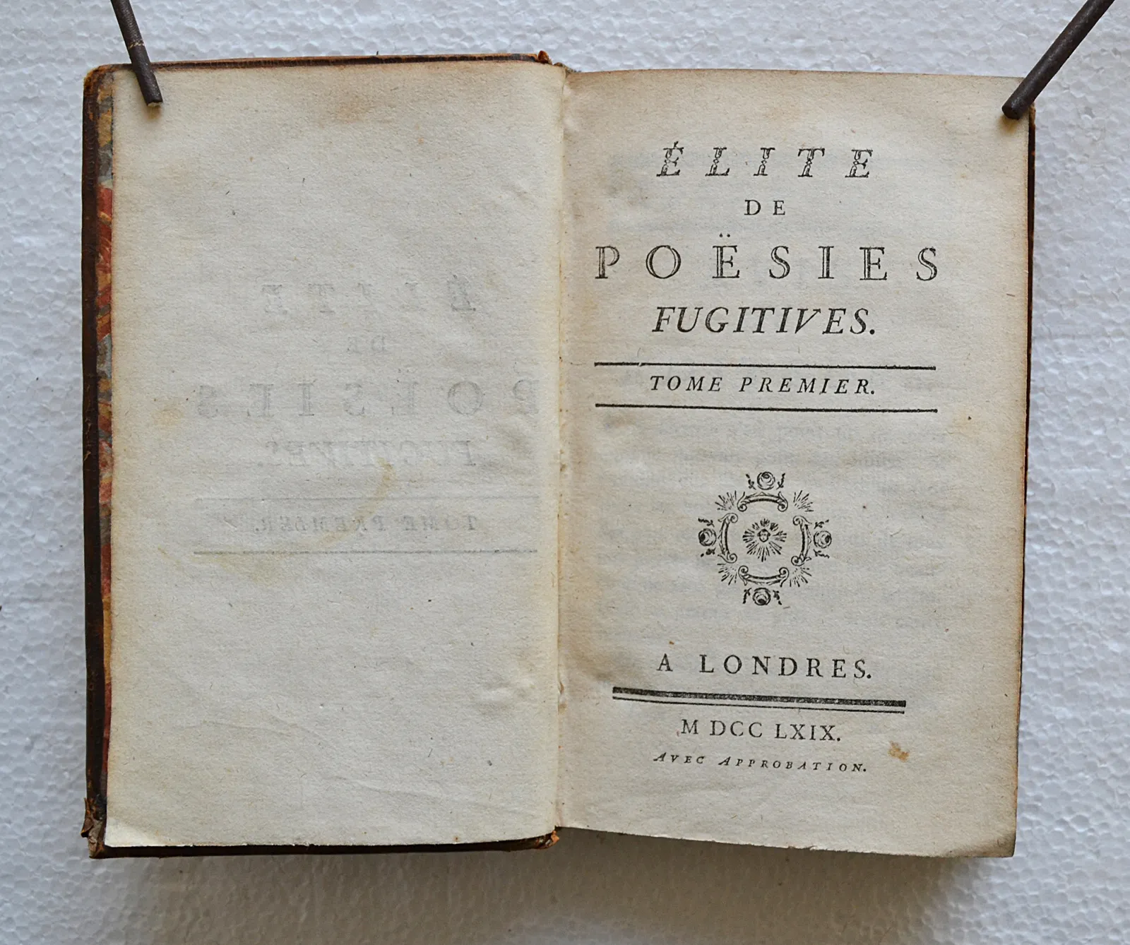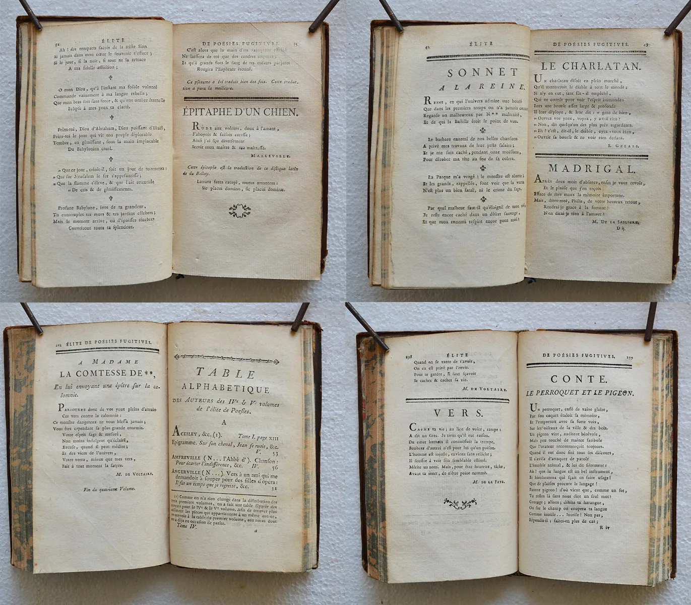 Belle et rare édition de cette anthologie des poètes de la fin du XVIIe et de la première moitié du XVIIIe siècle, établie par Blin de Saintmore pour les trois premiers volumes et par Luneau de Boisjermain pour les deux derniers. On y trouve des pièces inédites de Boileau, Fontenelle et Voltaire, des pièces de poètes inattendus comme Montesquieu, Diderot, d’Alembert, Jean-Jacques Rousseau, et plusieurs autres poésies d’auteurs anonymes.