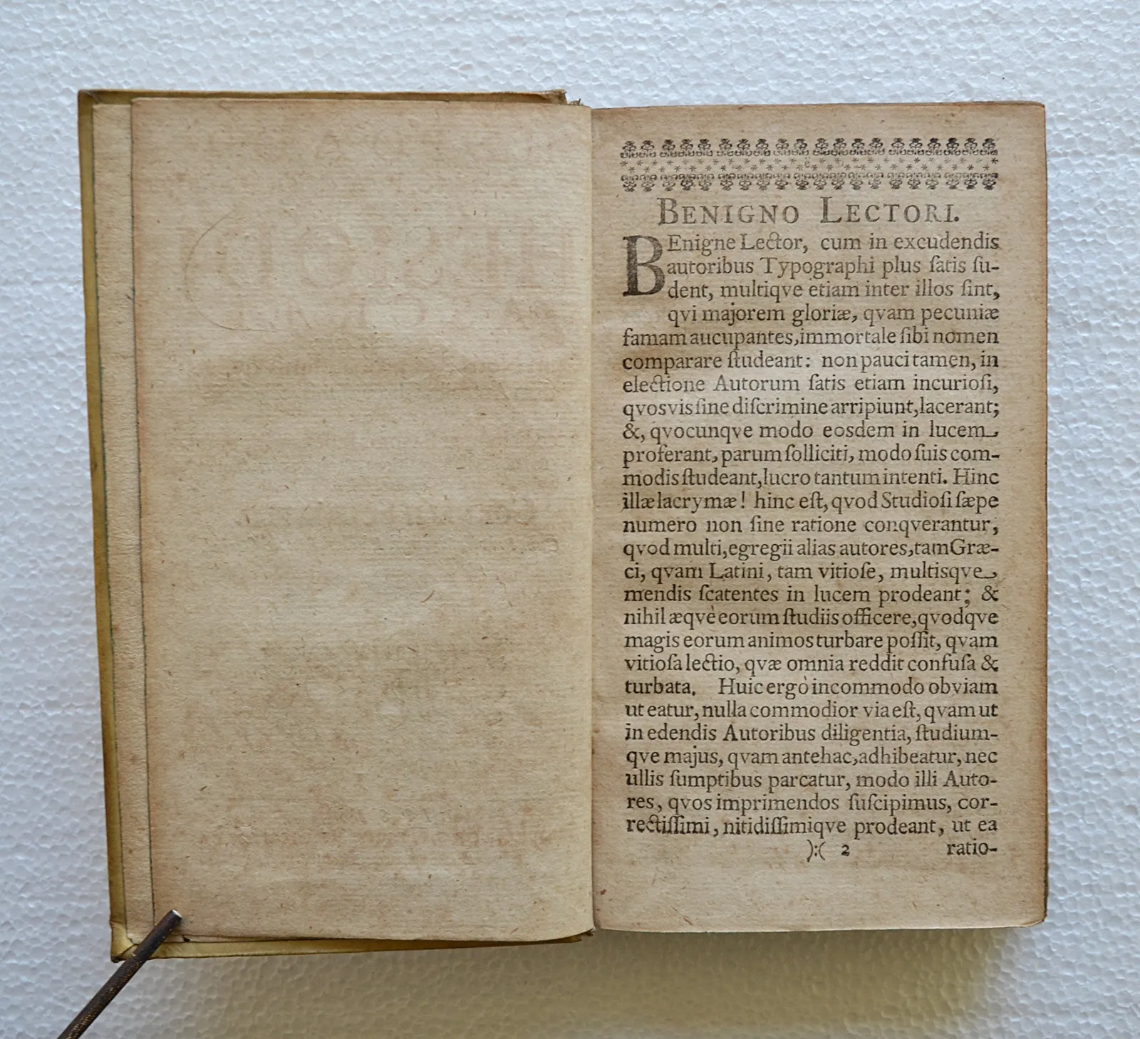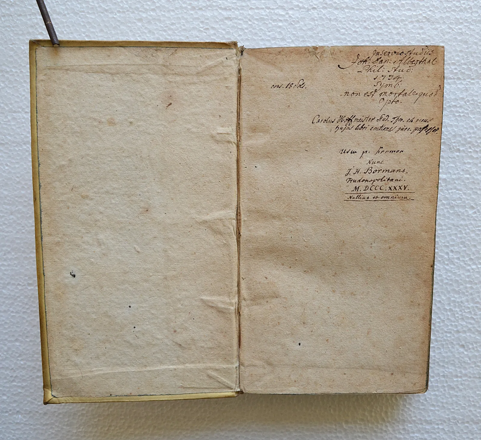 Deux ex-libris, l’un daté de 1734, le second 1835, et une note manuscrite ancienne sur le premier feuillet blanc.