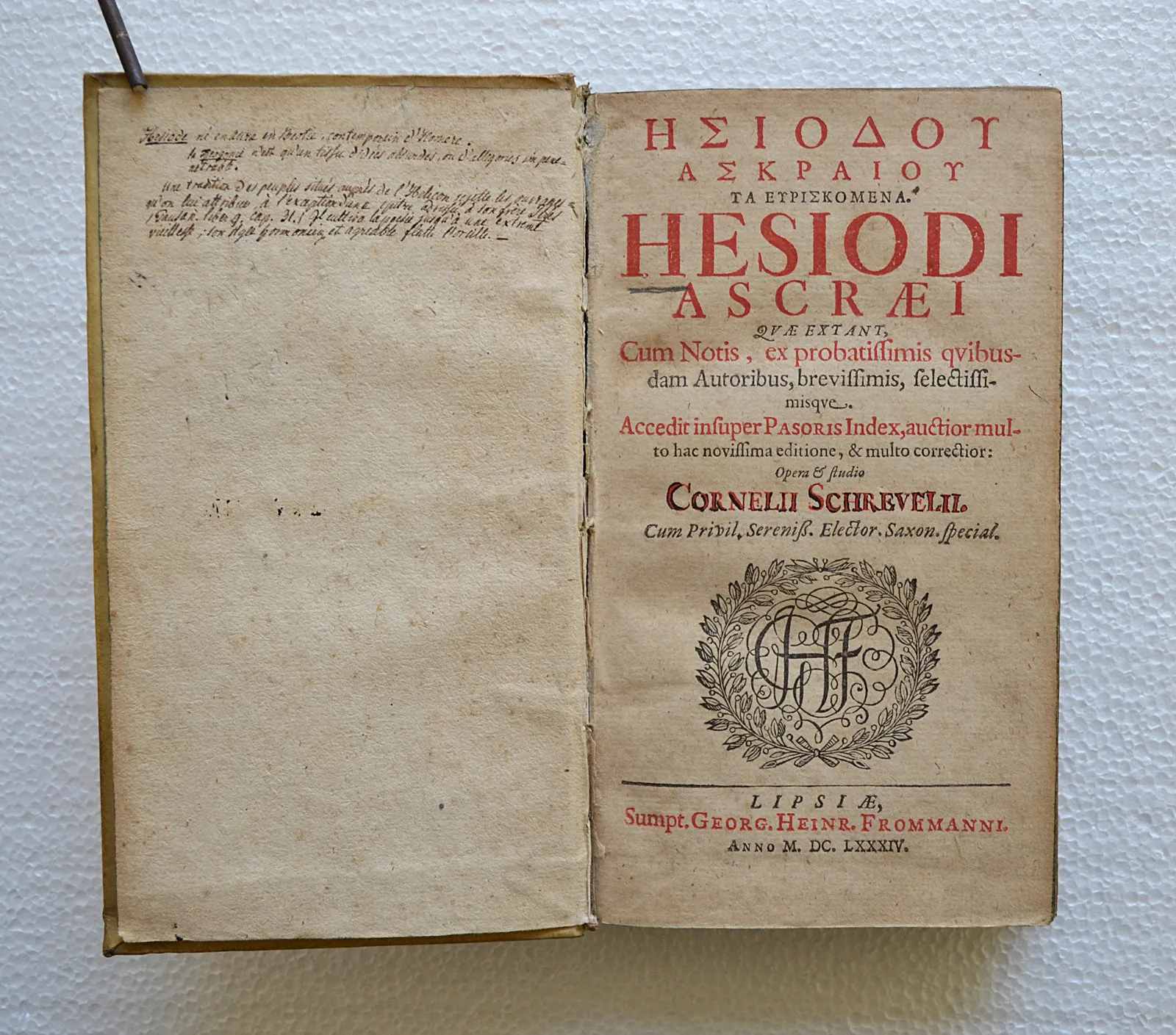 Très rare édition de Leipzig de 1684, en vélin ivoire rigide d'origine, tranches bleutées. Deux ex-libris anciens datés de 1734 et 1835. Poésie didactique du VIIIe siècle avant J.-C.