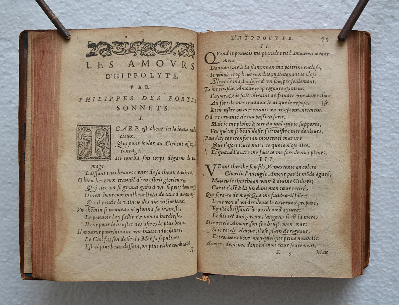 Rare impression lyonnaise du XVIe siècle des oeuvres du Tibulle français, poète officiel d'Henri III, dont les sonnets influencèrent les poètes anglais.
