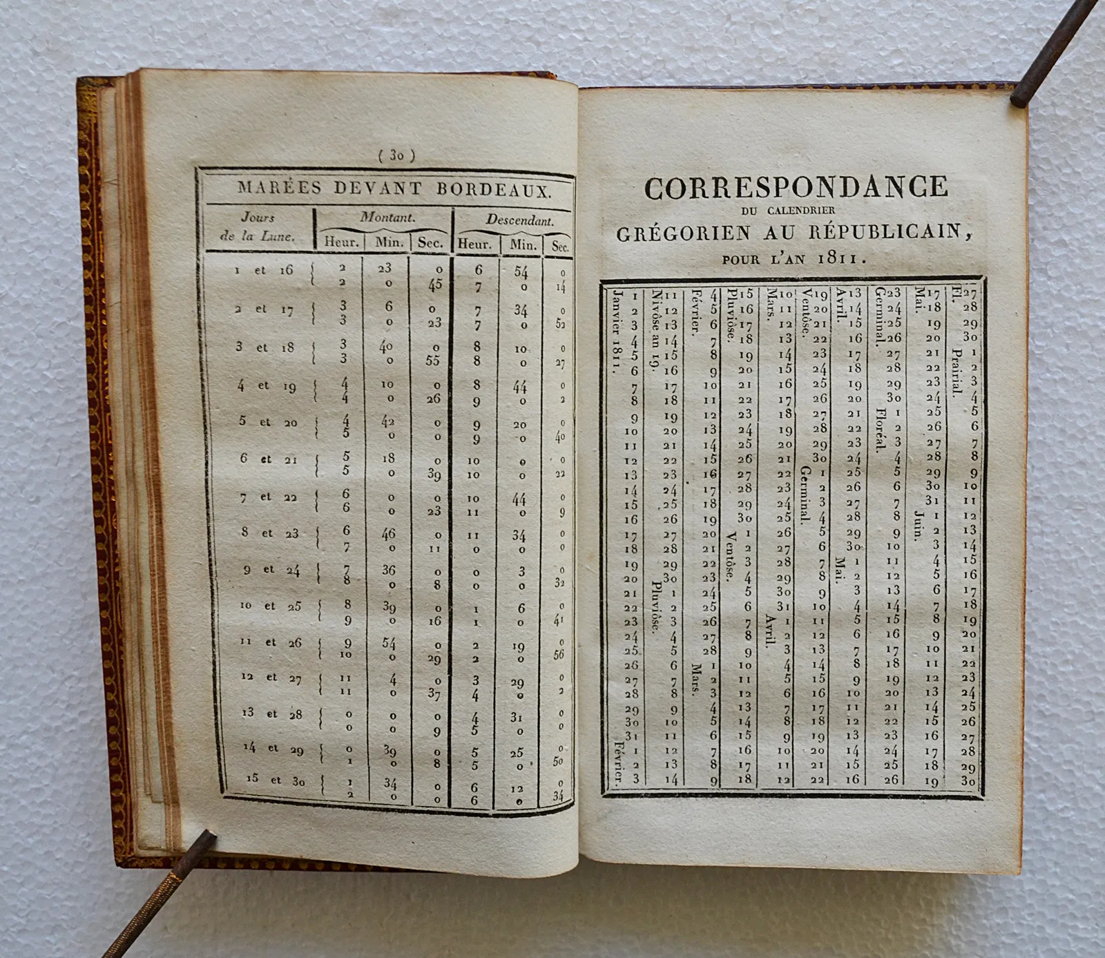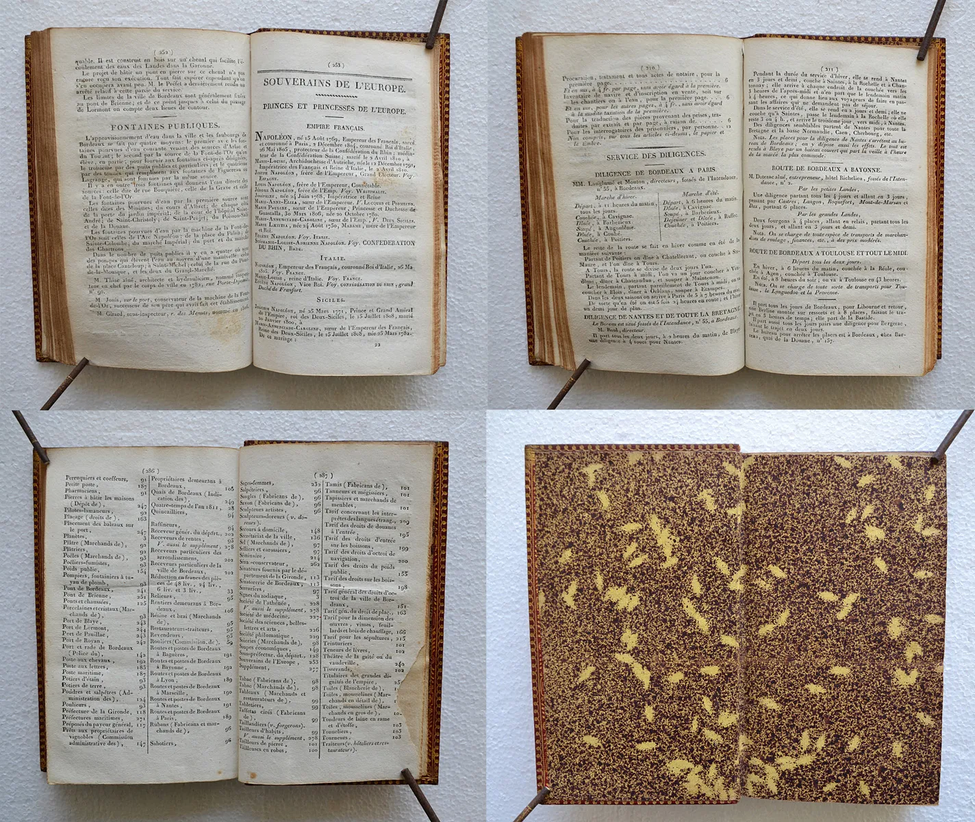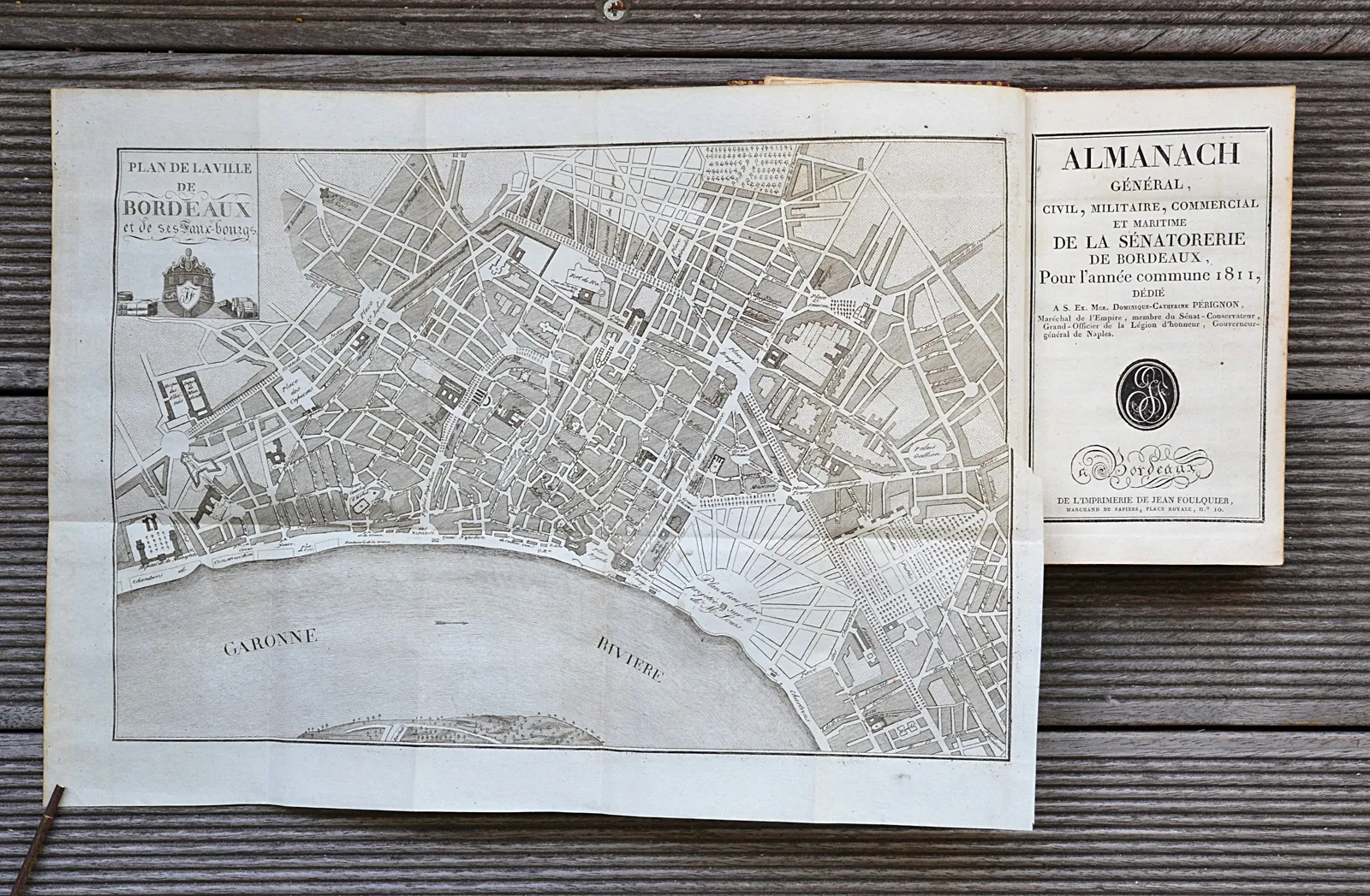 Fine reliure en maroquin rouge d'époque de ce rarissime almanach bordelais de 1811, avec un grand plan de la ville et un tableau des rues.