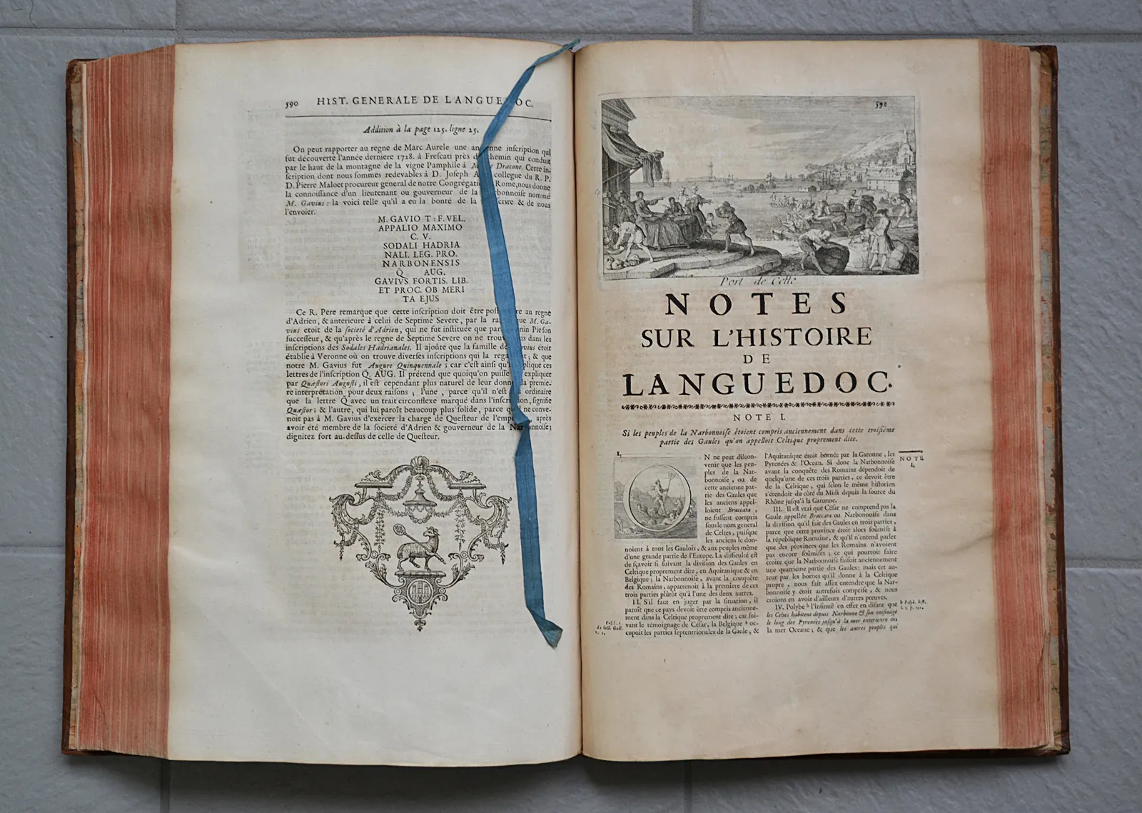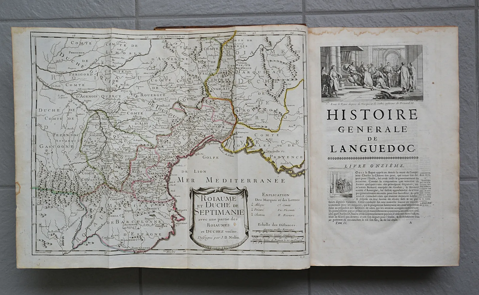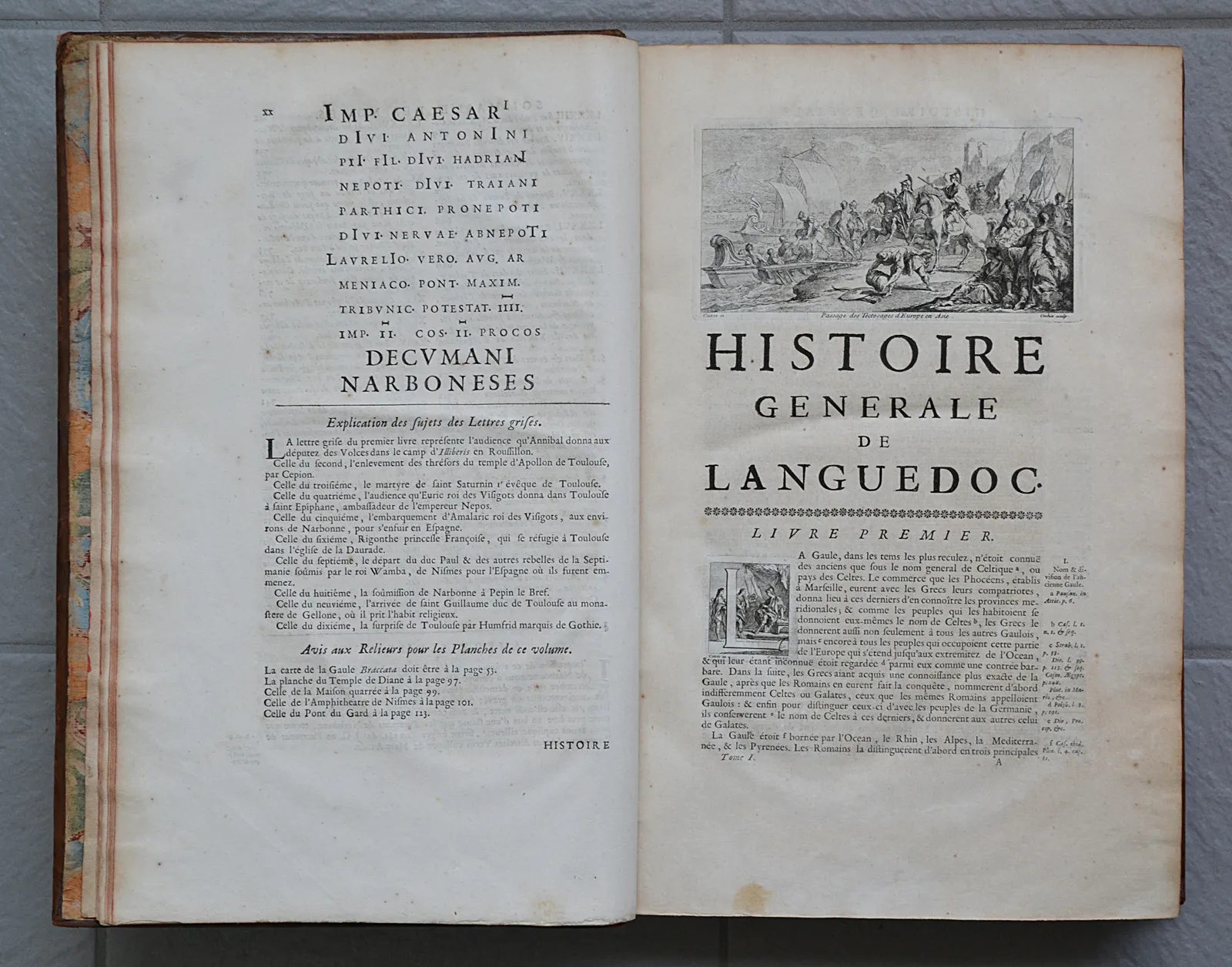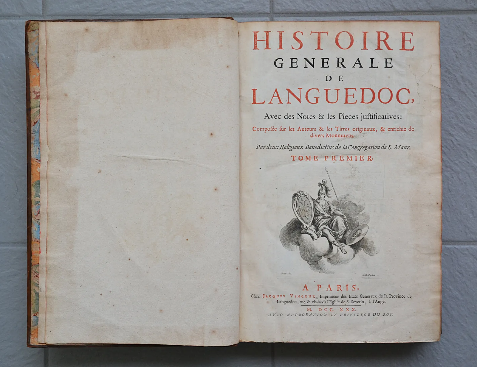 Première synthèse historiographique consacrée au Languedoc, cinq volumes in-folio, 4 cartes coloriées et 35 planches gravées par Cochin et de Poilly.