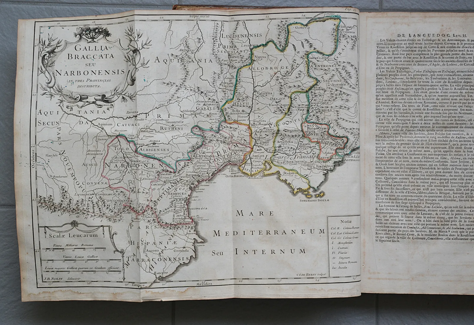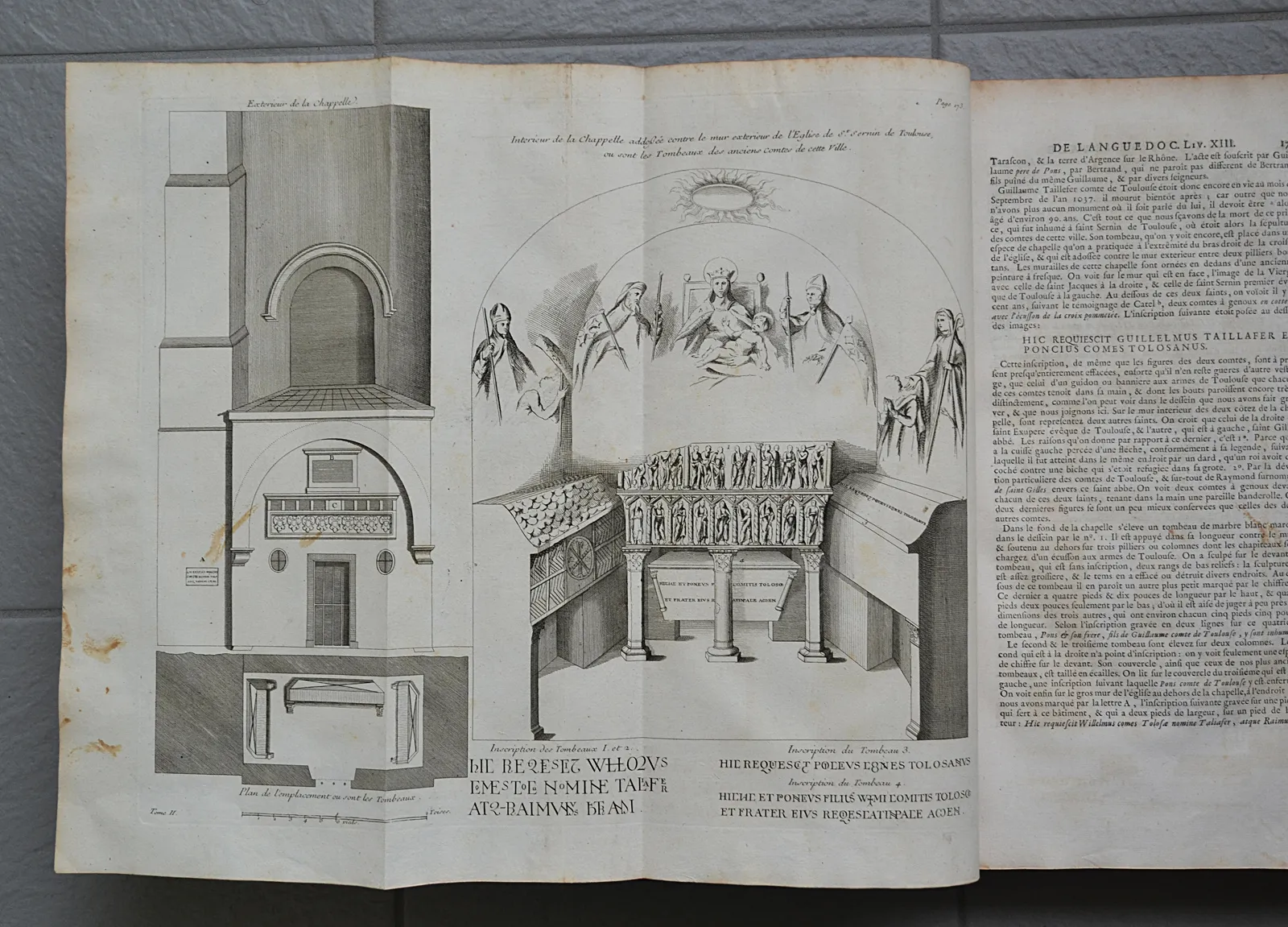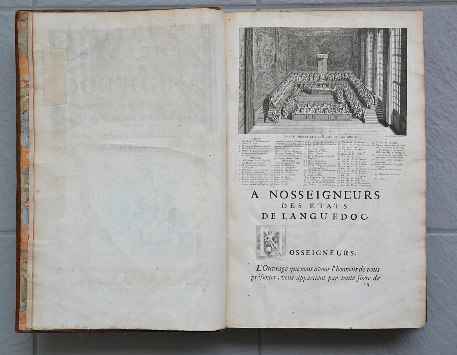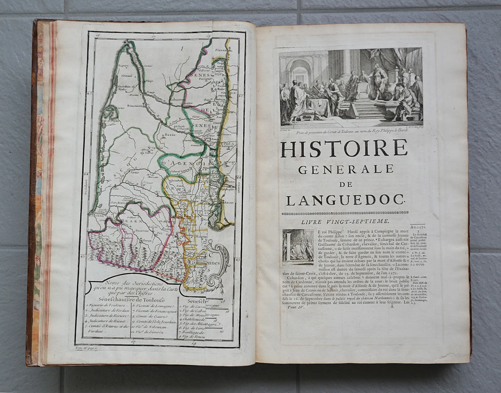 Première synthèse historiographique consacrée au Languedoc, cinq volumes in-folio, 4 cartes coloriées et 35 planches gravées par Cochin et de Poilly.