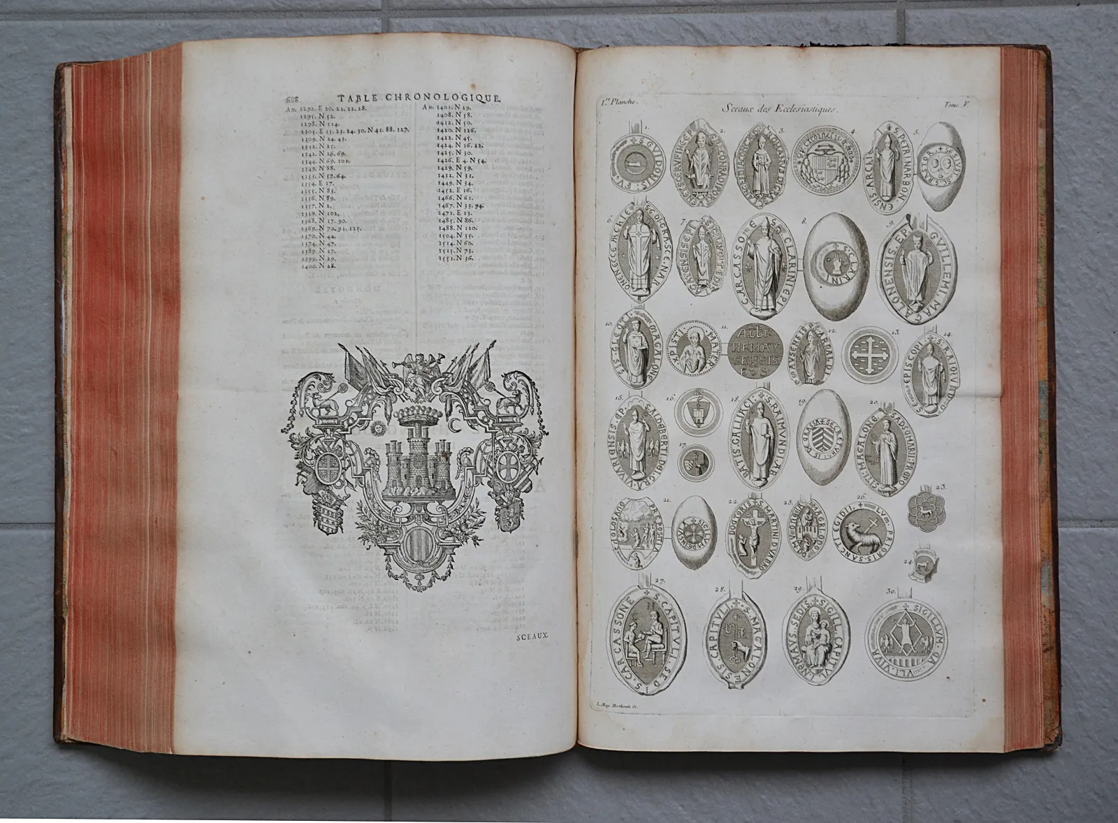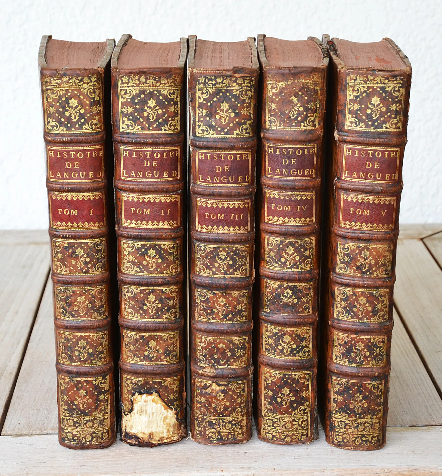 A Paris, chez Jacques Vincent, Imprimeur des Etats Généraux de la Province de Languedoc, rue vis-à-vis l’Eglise de S. Séverin, à l’ange, 1730 – 1745. Cinq volumes in-folio (26,5 x 40 cm.) de : XX – 758 pp. – 214 (1) pp. – (1f.) + (3ff.) – 648 pp. – 699(1) pp. + X – 606 pp. – 706 pp. + XXII – (1f.) – 600 pp. – 570(1) + VII (3) – 688 pp. – 494 (1) pp. (pagination sur double colonne pour les Preuves) ; veau fauve marbré, triple filet à froid sur les plats, dos à nerfs ornés, pièces de titre et de tomaison en maroquin rouge, roulette dorée sur les coupes, tranches rouges (reliure de l’époque).