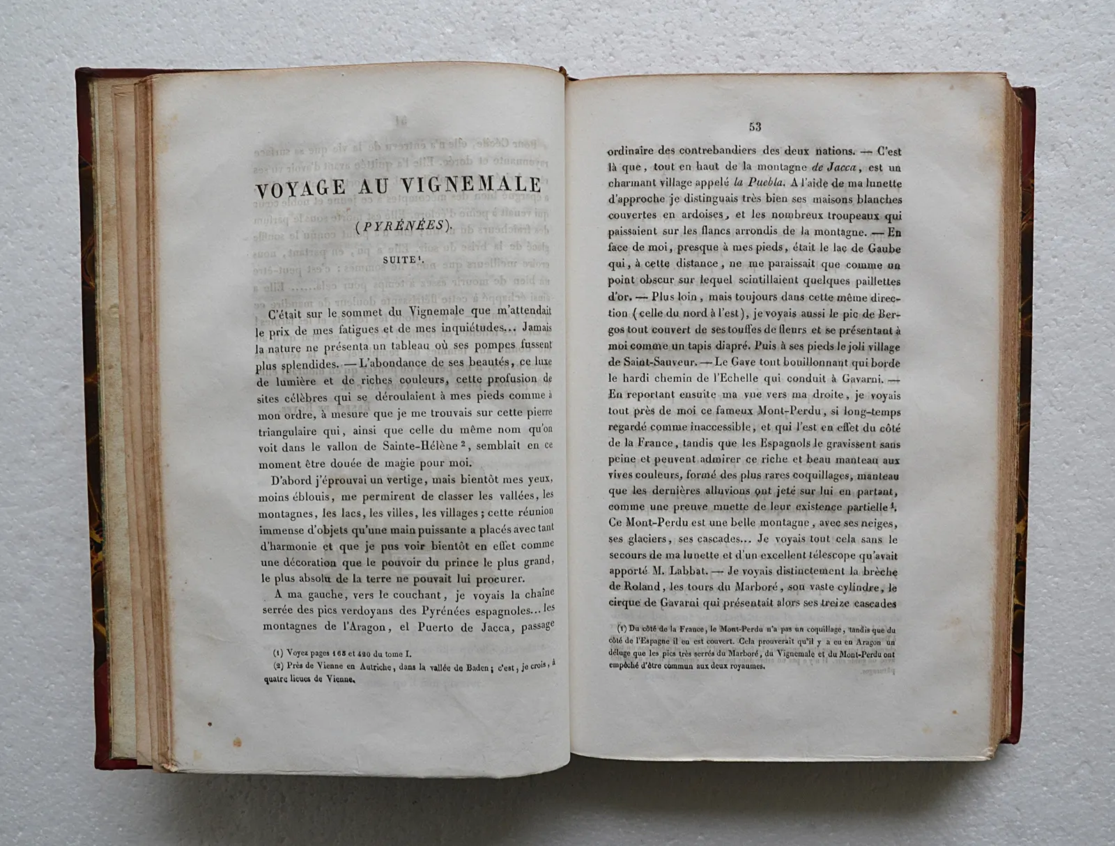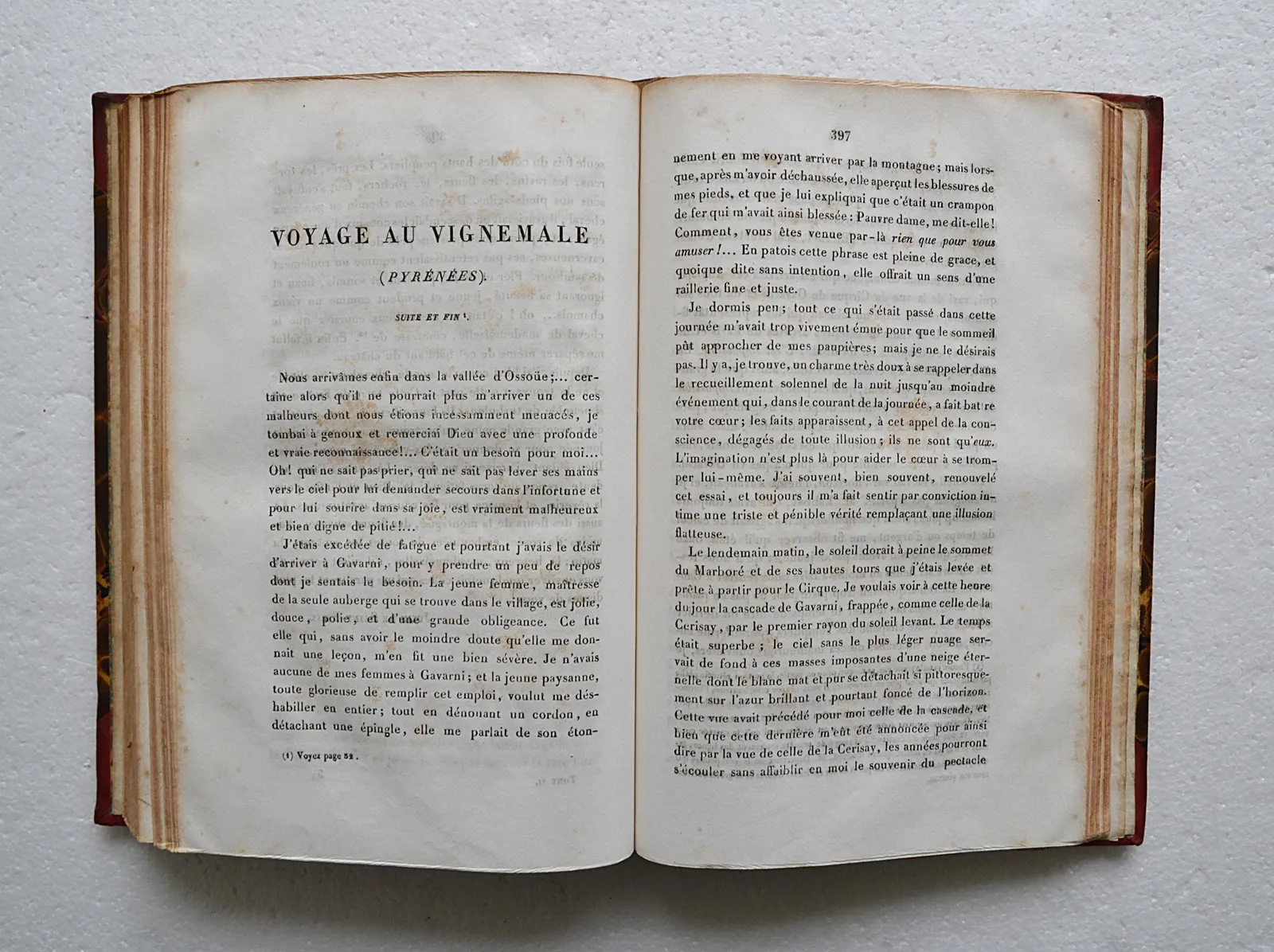 Deux mors fendillés avec un décollement de la partie supérieure du dos ; perte de papier de 4 cm. sur une coupe ; déchirure sur le faux-titre et le titre gravé du T1, cf. photo ; trace de mouillure dans la marge intérieure de plusieurs feuillets du T1, notamment sur 6 feuillets du Voyage au Vignemale ; fortes rousseurs.