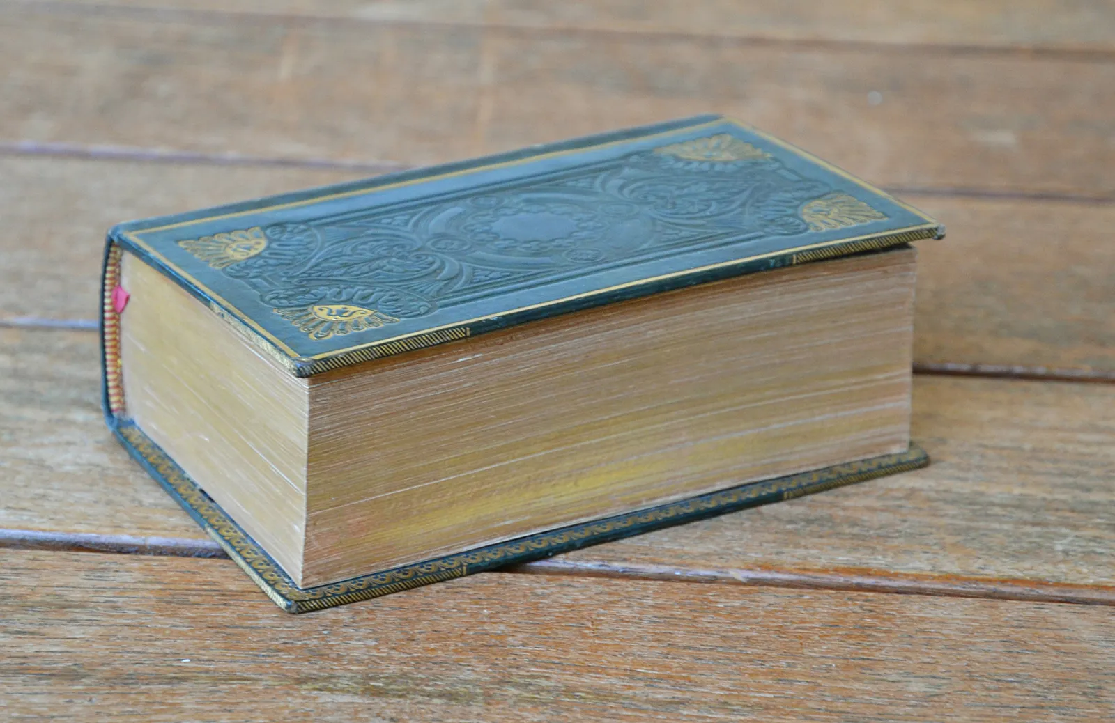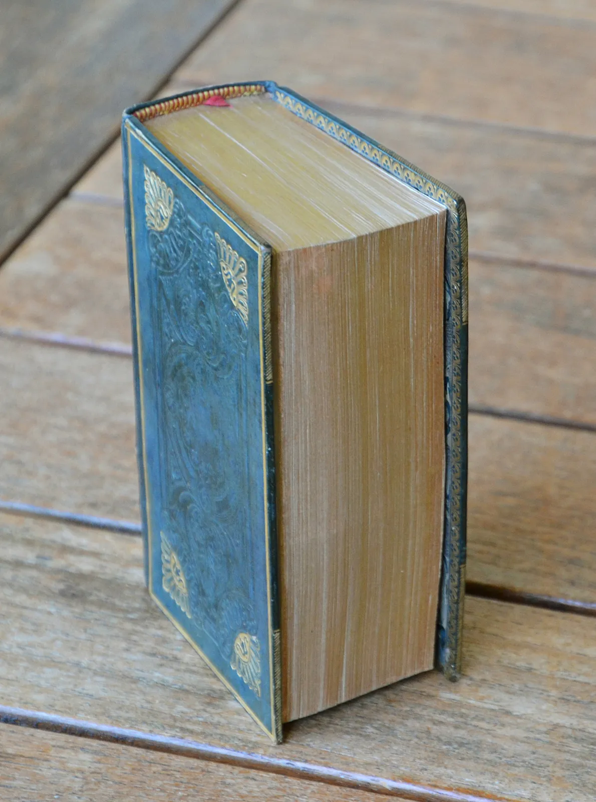 Un volume fort in-12 rectangulaire (9 x 15cm.) de : (8ff.) – 1179 pages ; veau vert glacé, plats et dos ornés d’un décor « à la cathédrale » estampé à froid dans un encadrement de roulette et filet dorés, roulette dorée sur les coupes et à l’intérieur, tranches dorées (reliure romantique de l’époque).