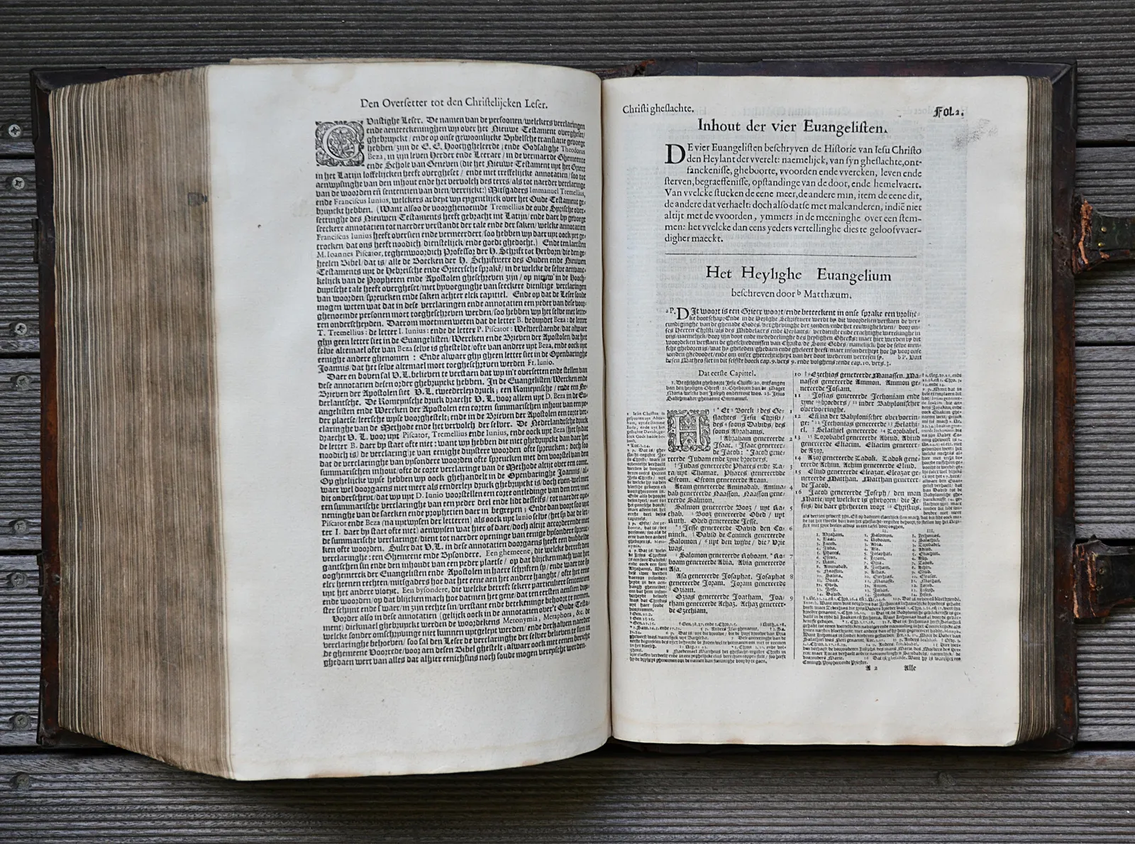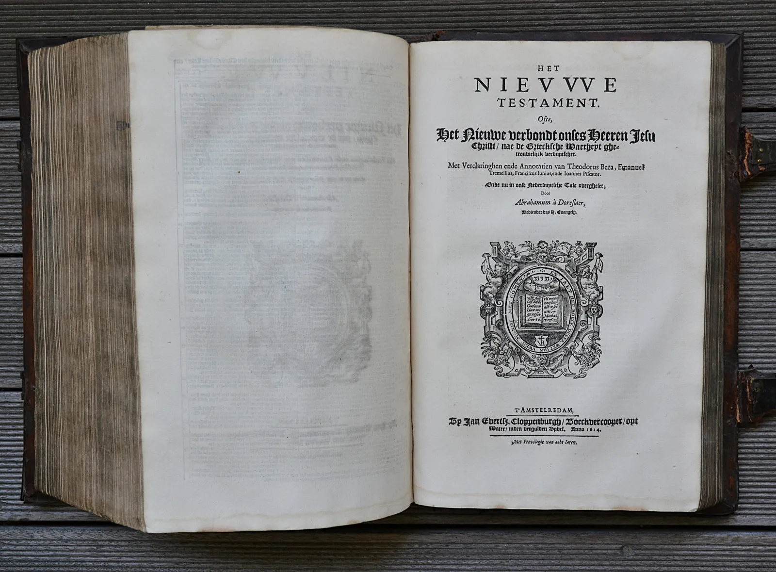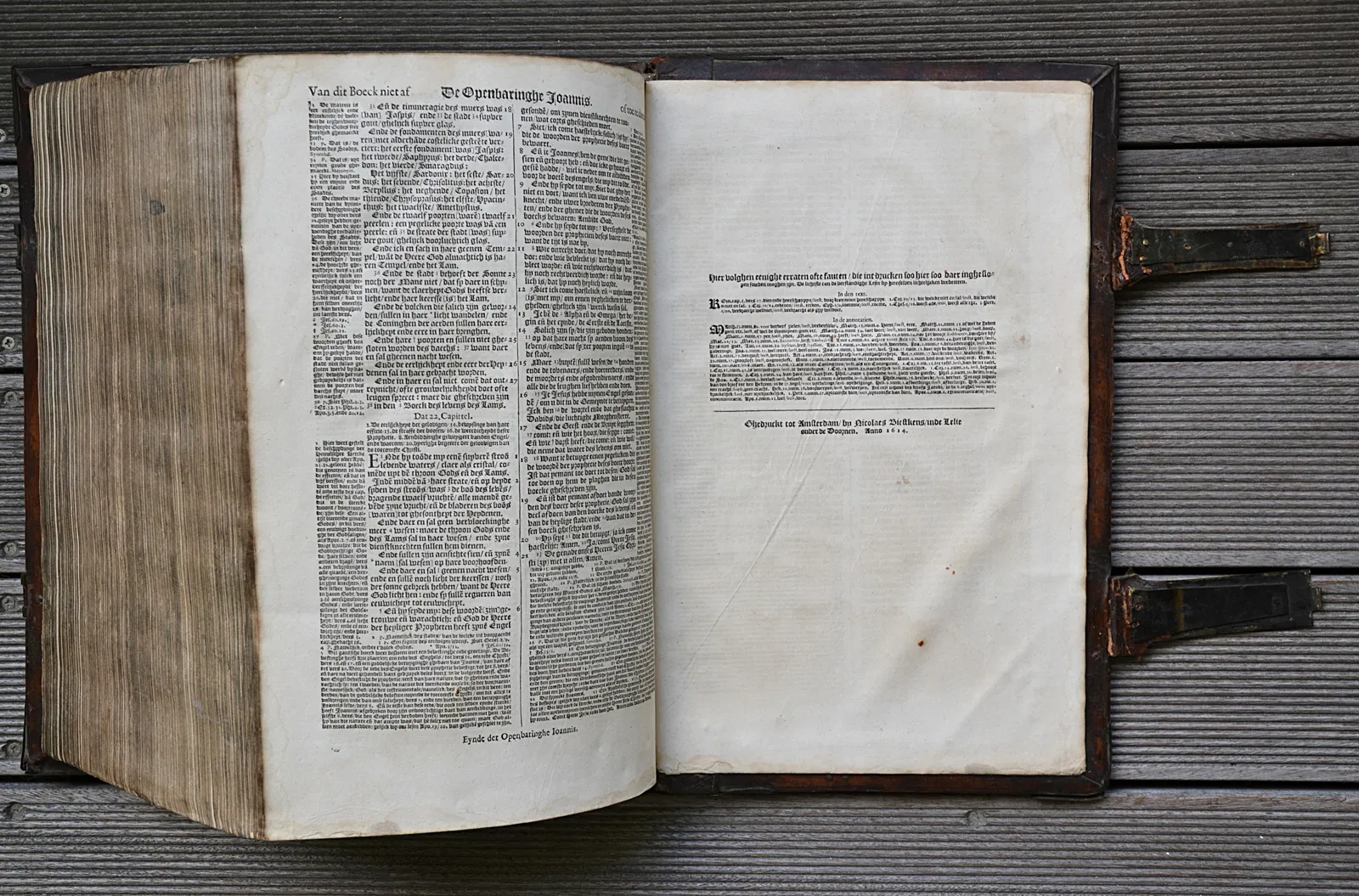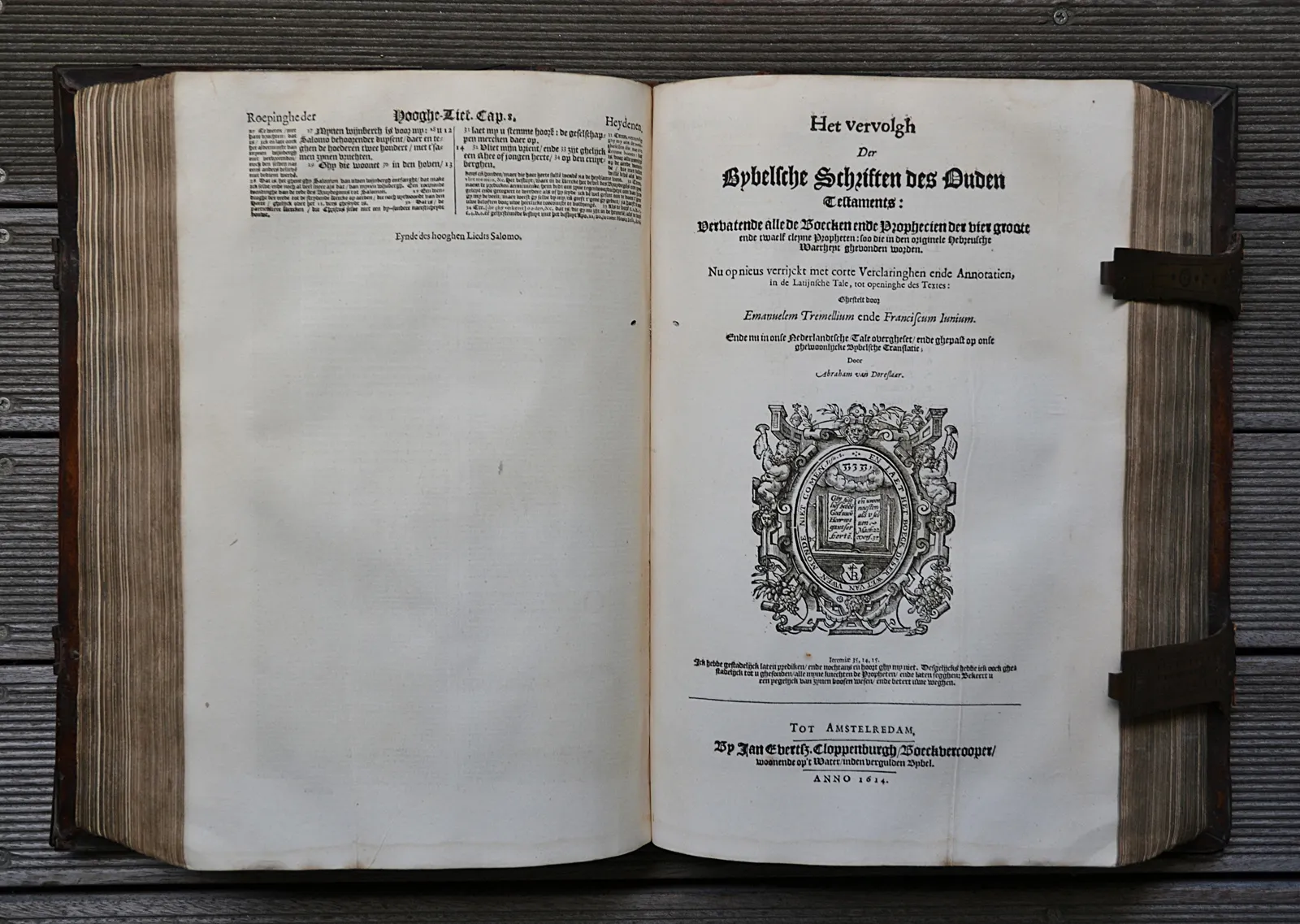 Spectaculaire Bible protestante hollandaise du début du XVII° siècle, remarquablement conservée dans sa reliure de l’époque sur ais de bois.