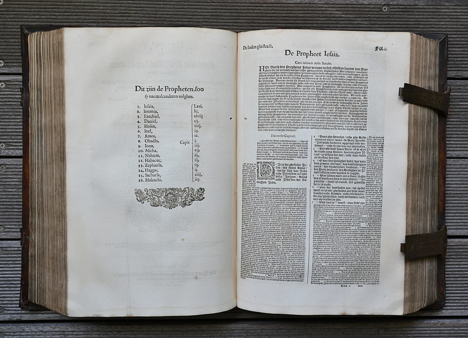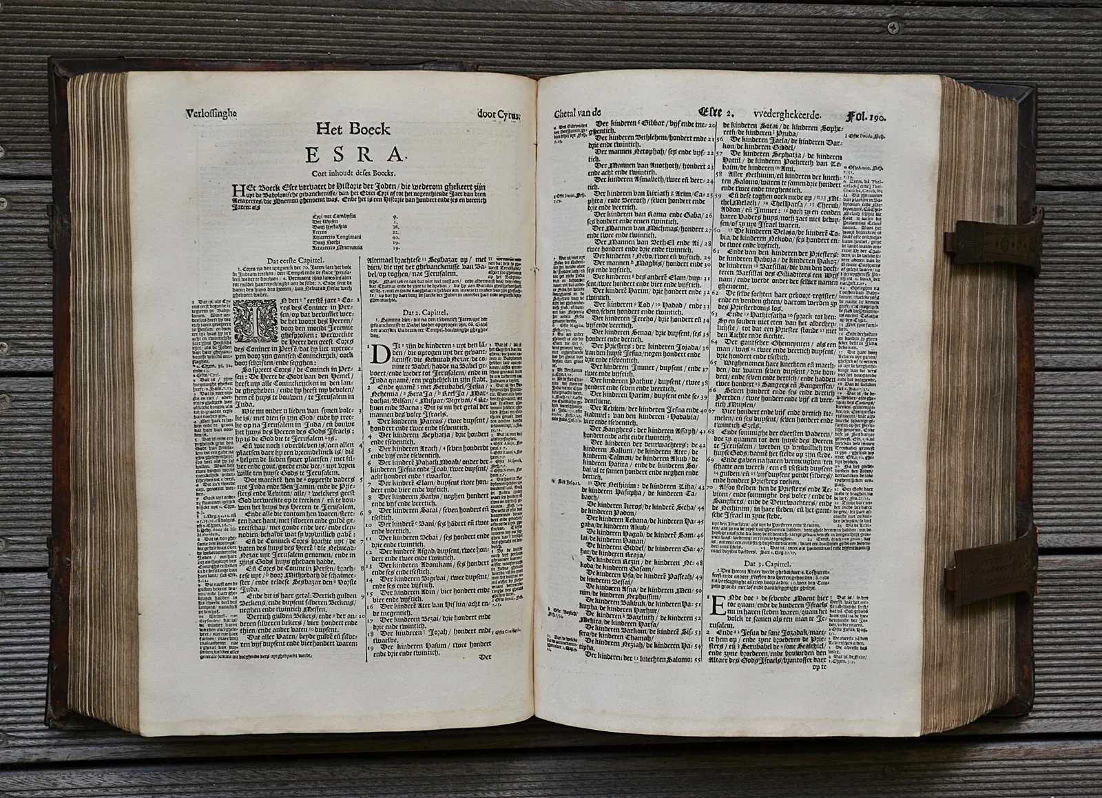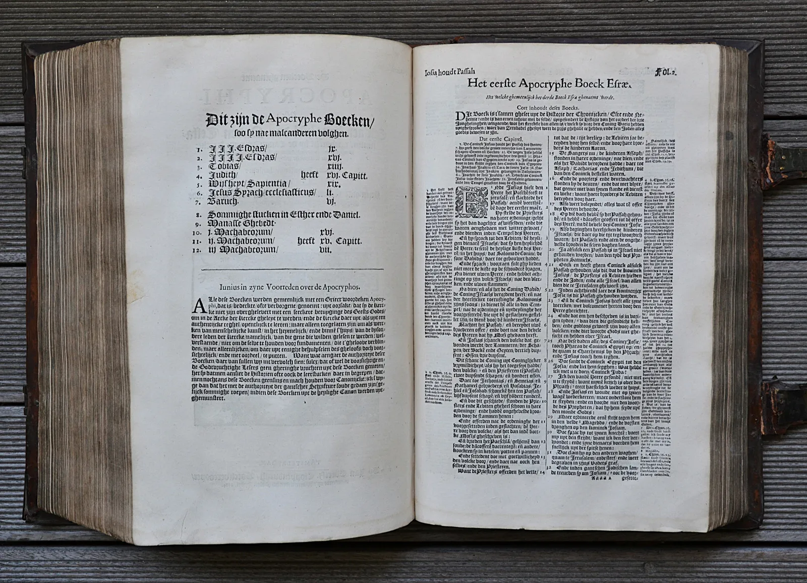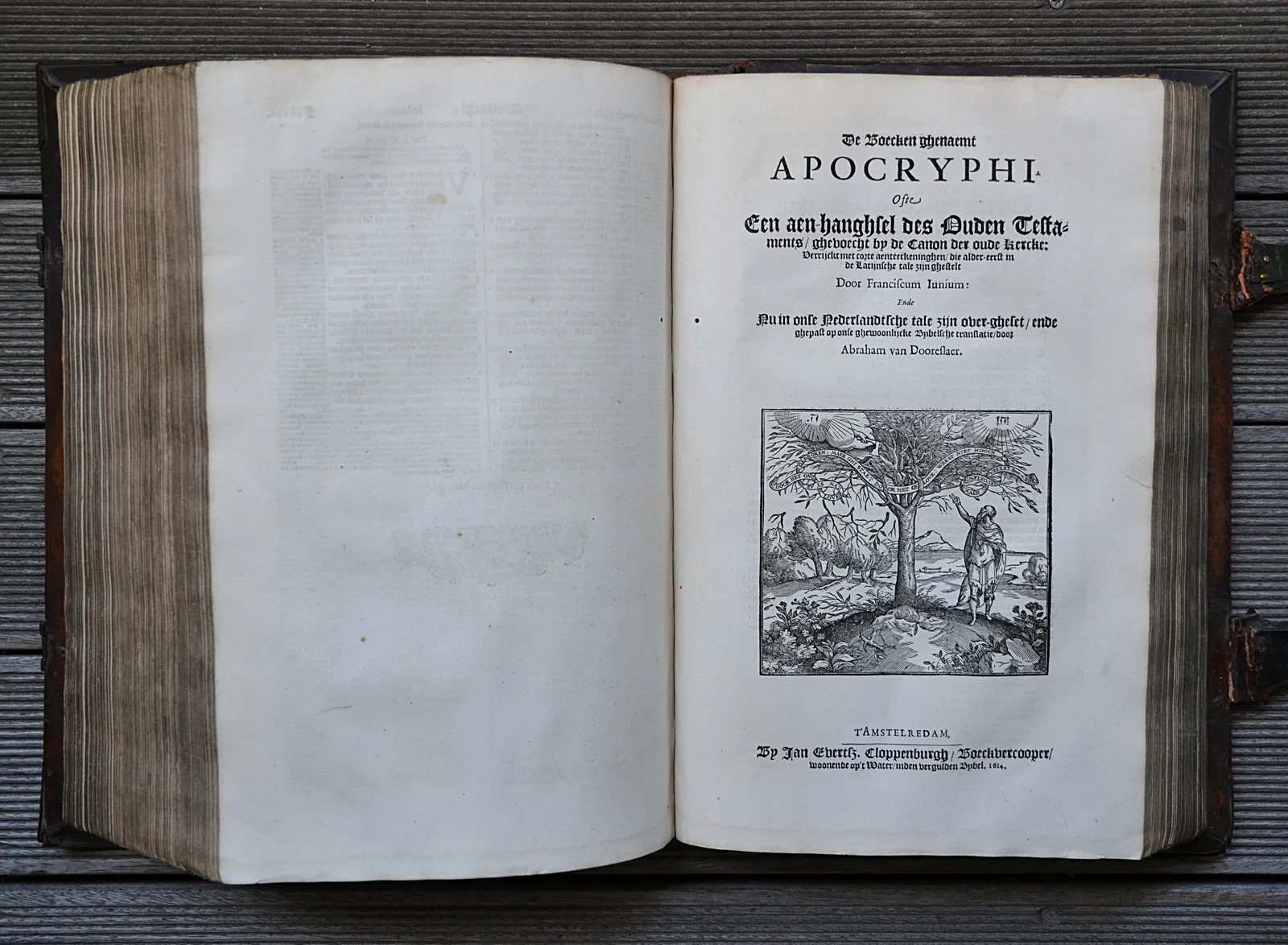Spectaculaire Bible protestante hollandaise du début du XVII° siècle, remarquablement conservée dans sa reliure de l’époque sur ais de bois.