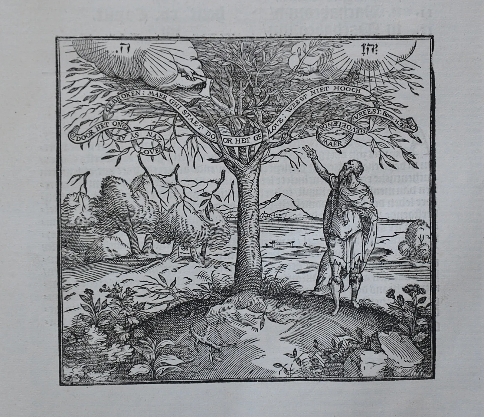 Quatre parties en un volume fort in-folio (41 x 26,5 cm.) de : (20ff.) – 274 folios + 120 folios + 81 folios – (1f.) + 143 folios – (1f.) ; plein veau brun estampé sur ais de bois, plats décorés de roulettes ornées, dont une avec 24 portraits en médaillon, cabochons en métal au centre des plats et dans les coins, fermoirs en métal (reliure hollandaise de l’époque).