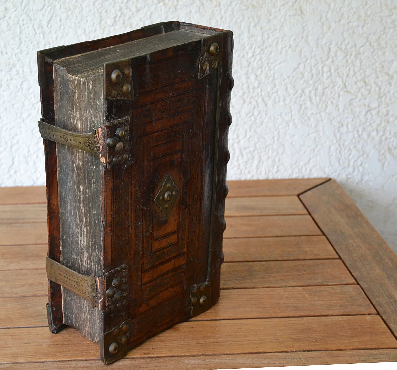 Spectaculaire Bible protestante hollandaise du début du XVIIe siècle en veau brun estampé sur ais de bois, avec cabochons et fermoirs en métal, remarquablement conservée.