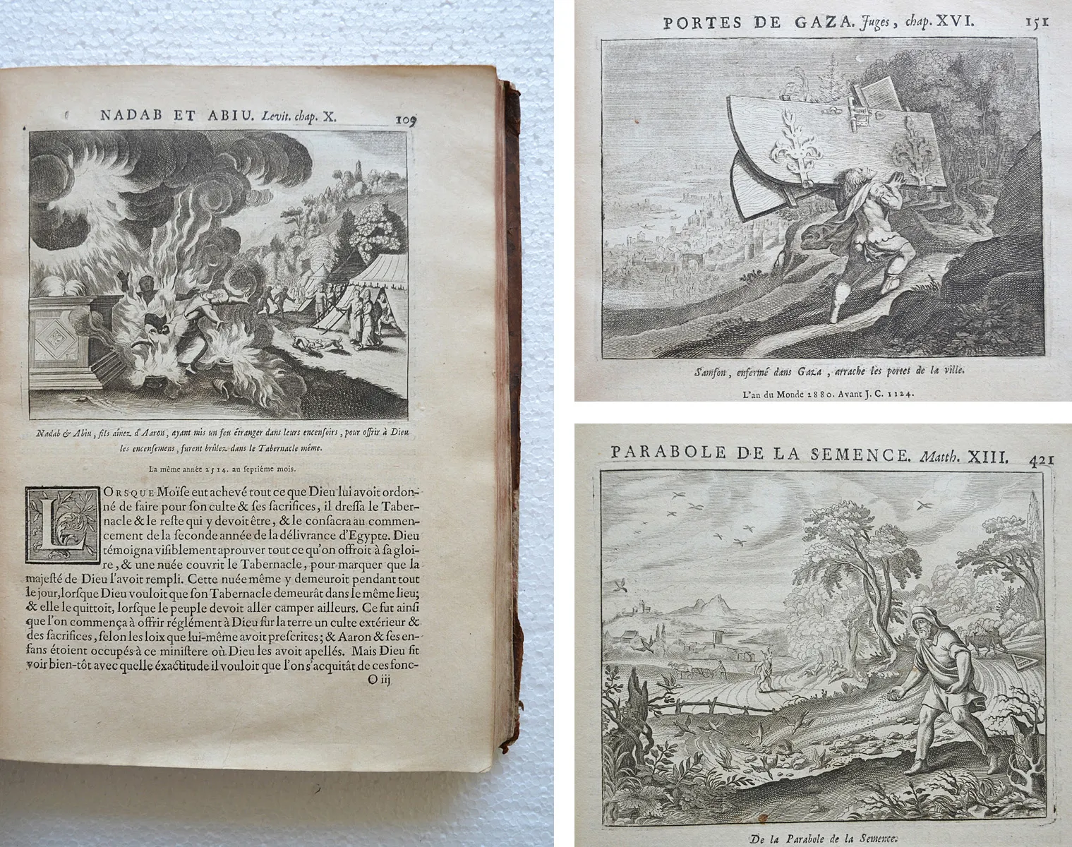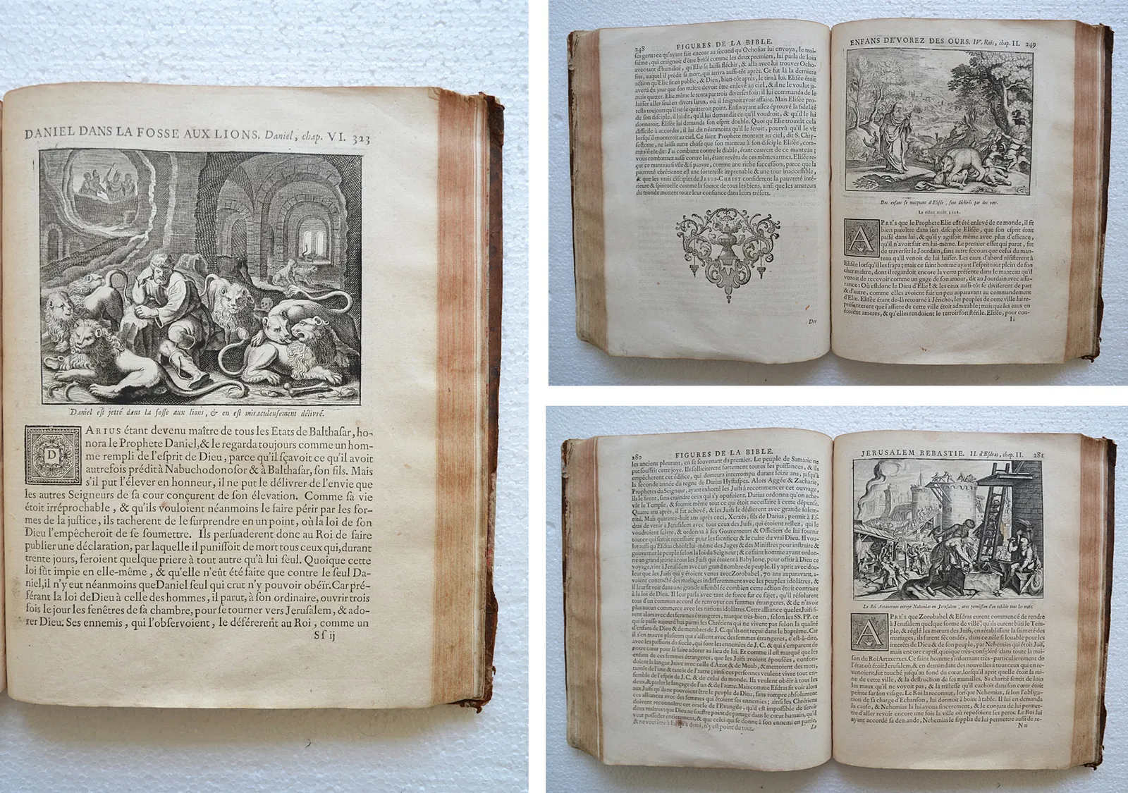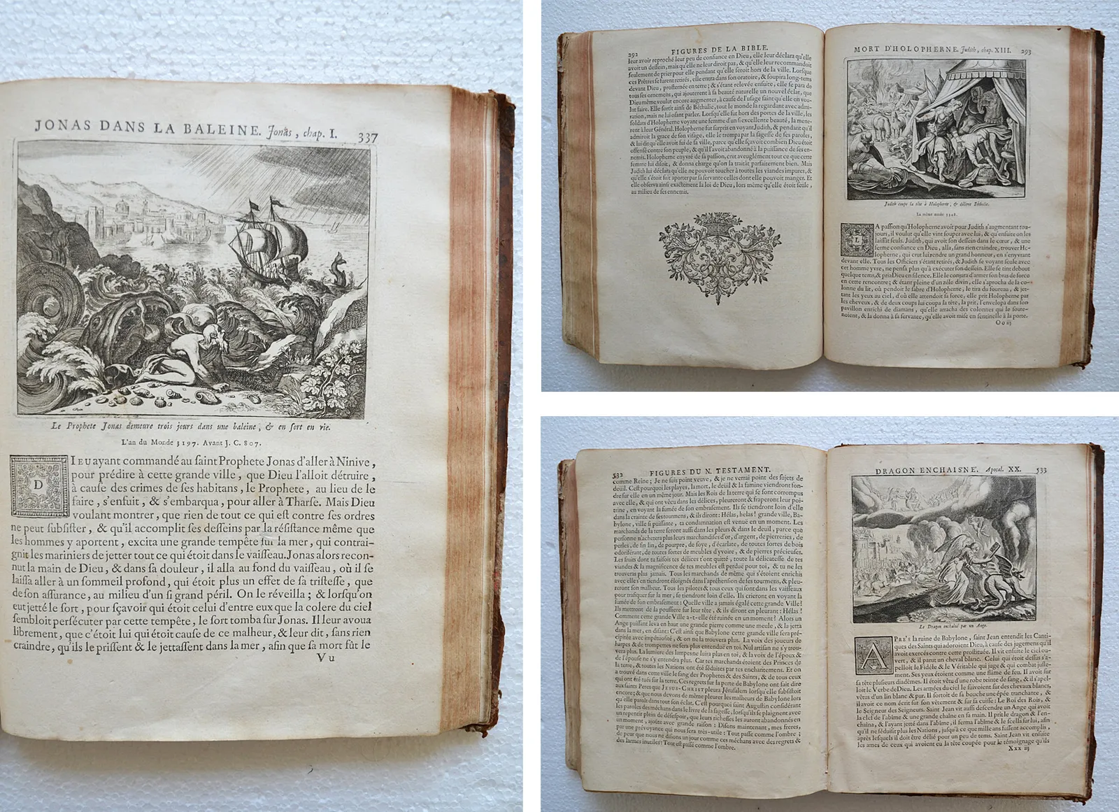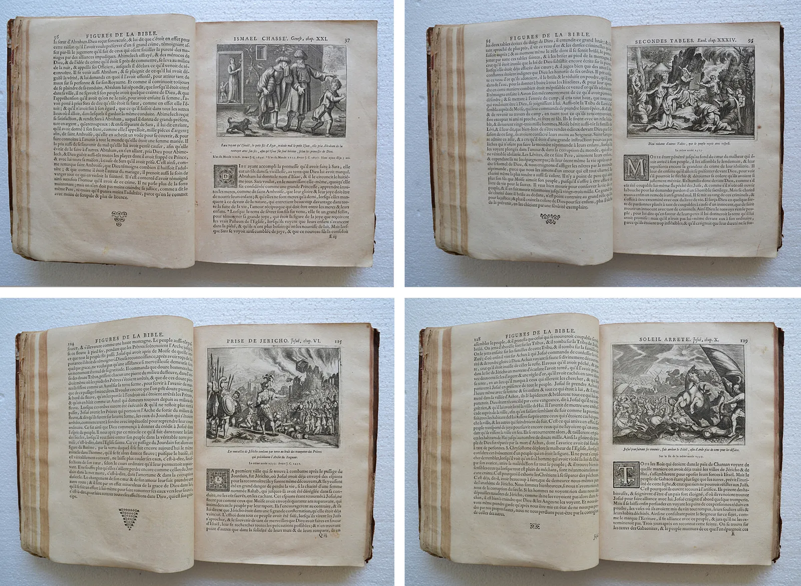 Cette rare édition de 1735, imprimée chez Théodore Hansy, est illustrée de deux vignettes en-têtes, de très nombreuses lettrines gravées, et de 267 gravures en taille douce à mi-page, dont la plupart sont issues des « Iconae Biblicae » de Mathieu Mérian pour la Bible de Luther.