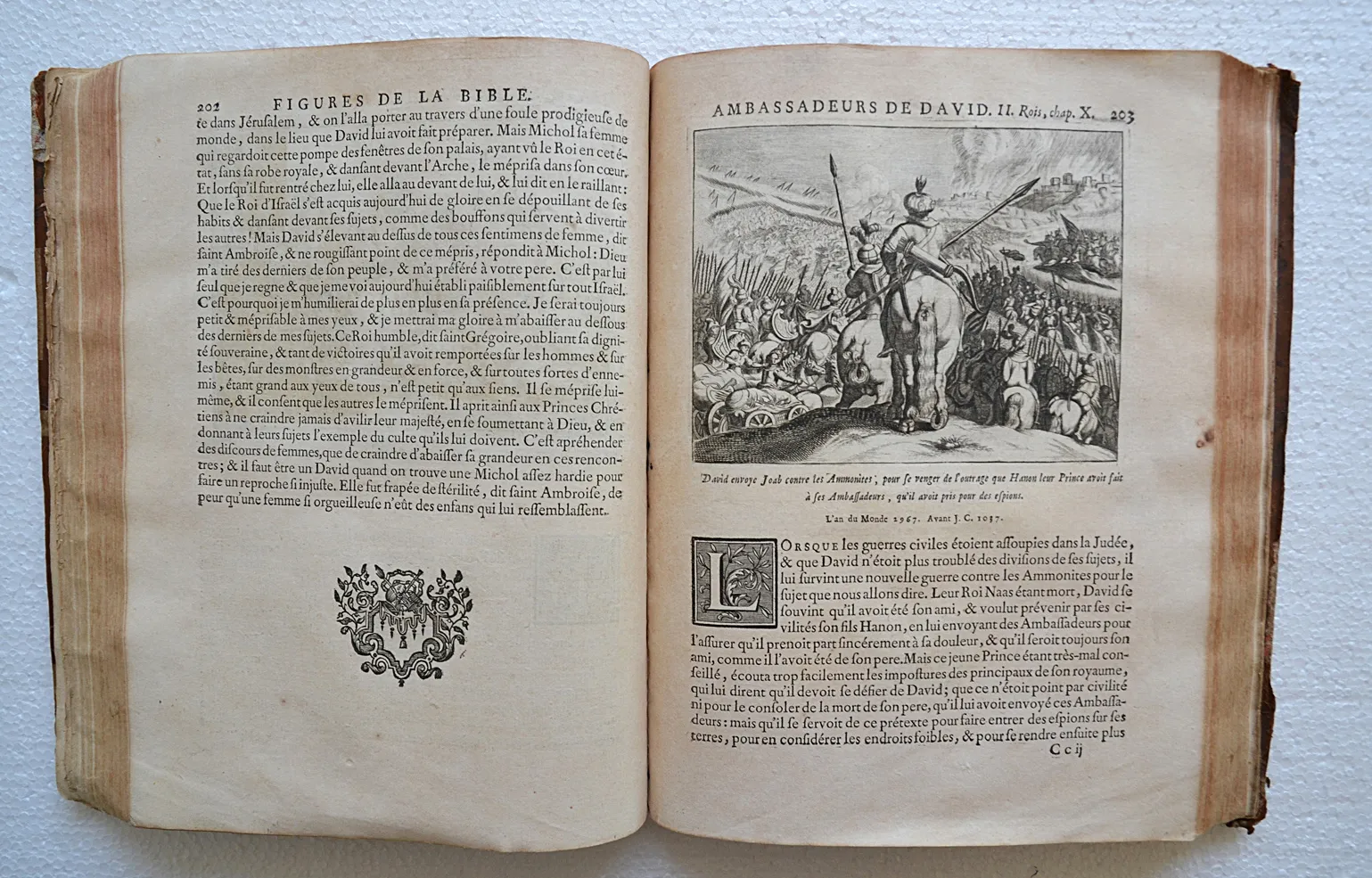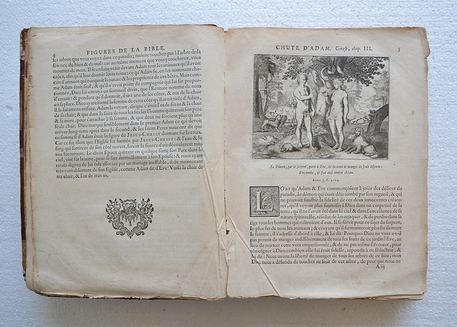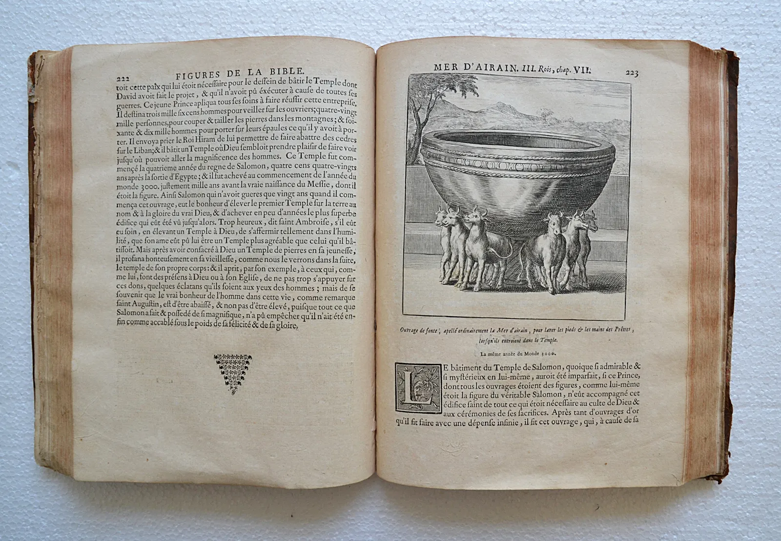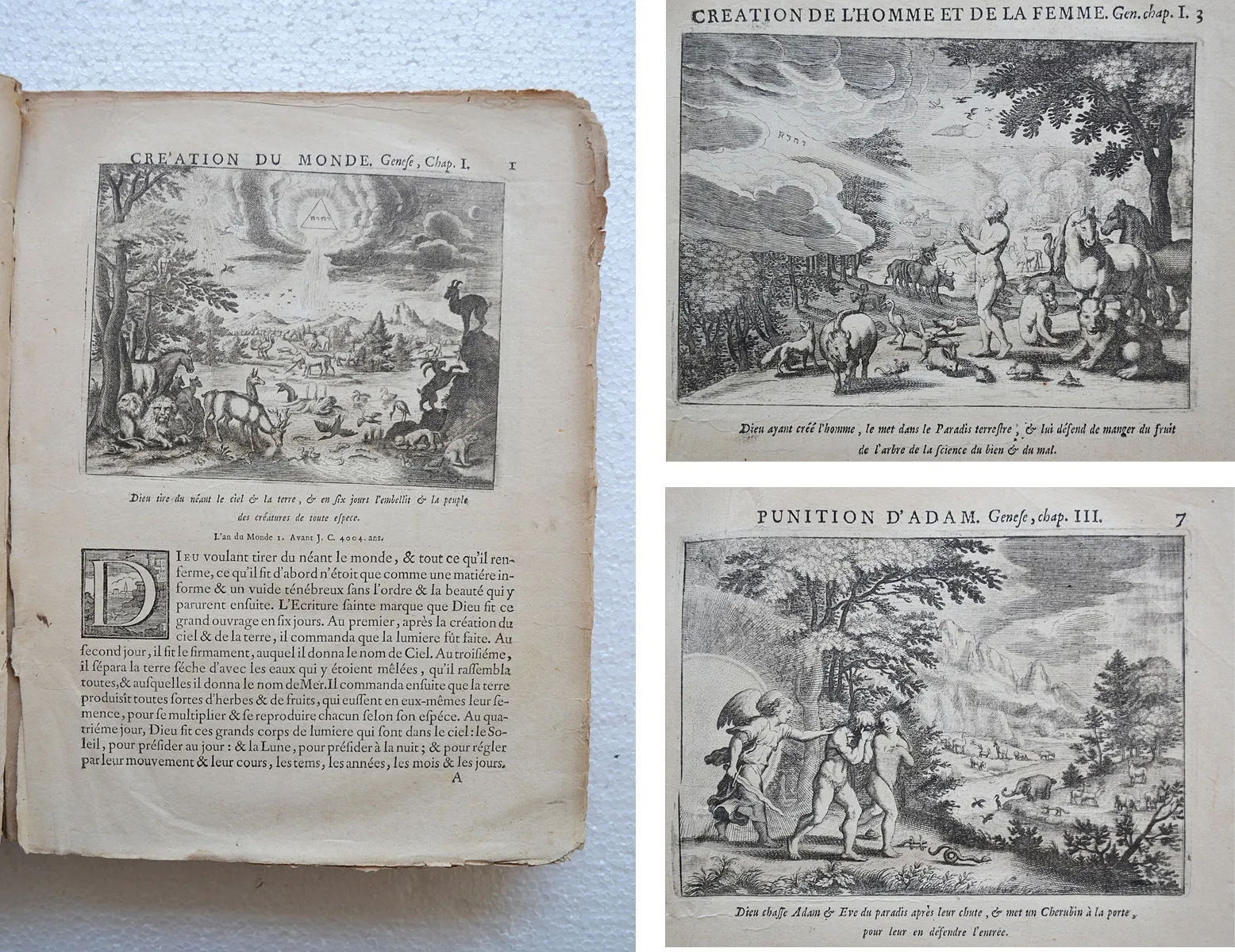 Cette rare édition de 1735, imprimée chez Théodore Hansy, est illustrée de deux vignettes en-têtes, de très nombreuses lettrines gravées, et de 267 gravures en taille douce à mi-page, dont la plupart sont issues des « Iconae Biblicae » de Mathieu Mérian pour la Bible de Luther.