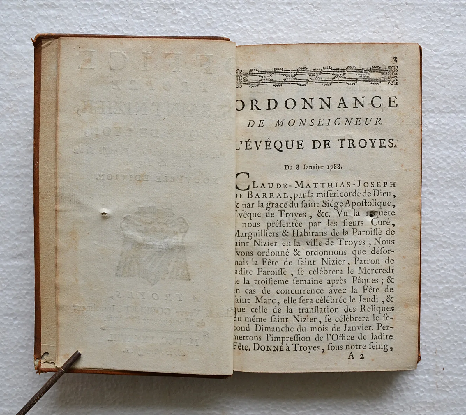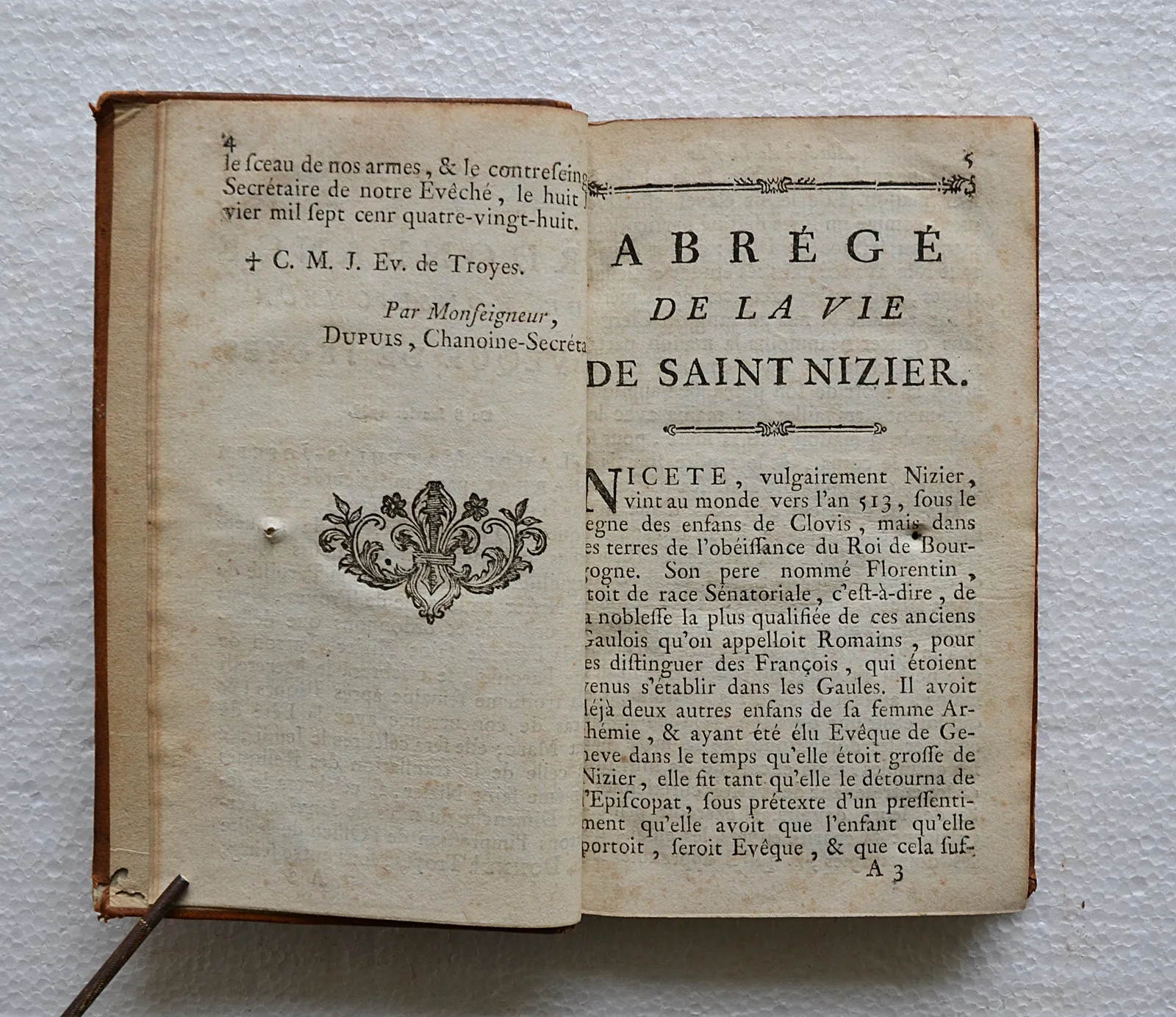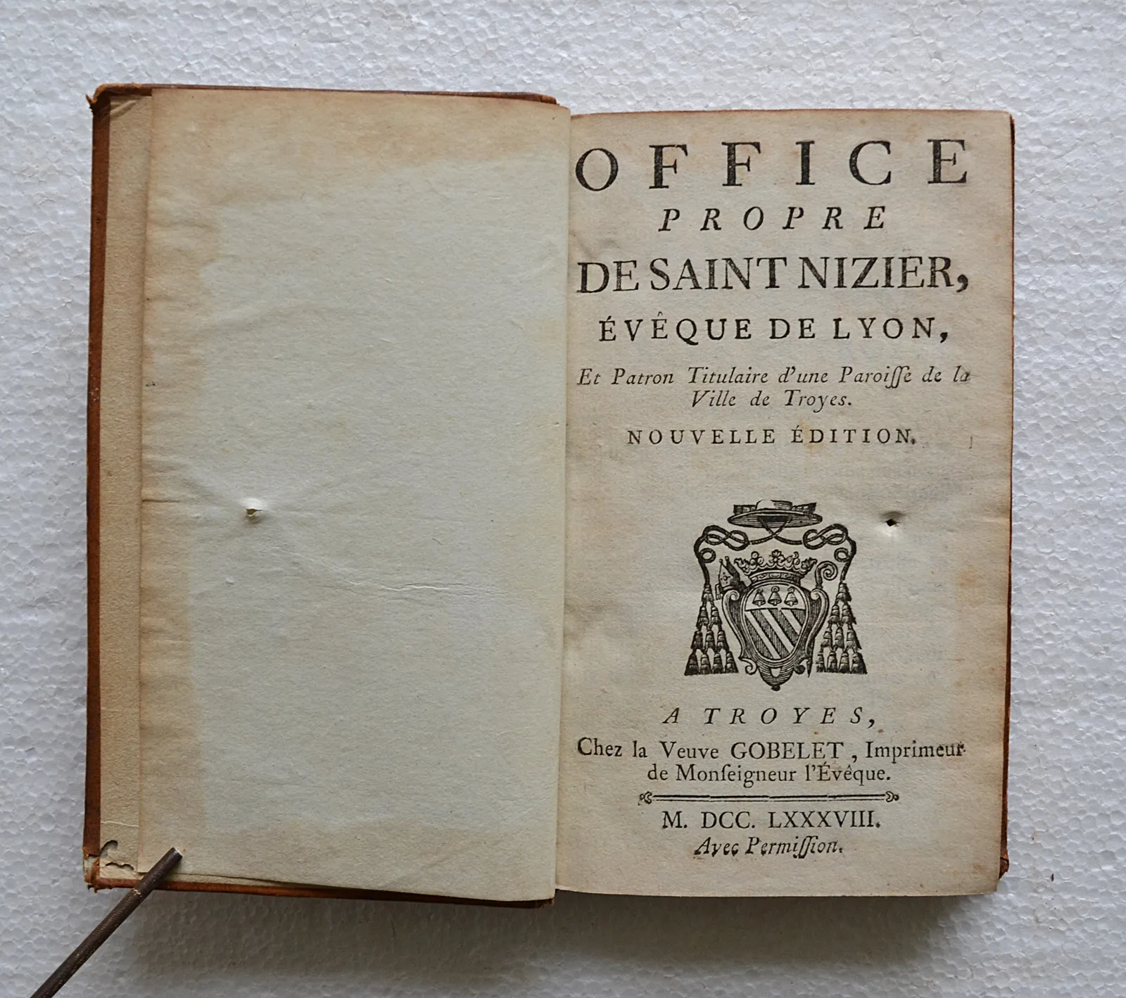Rarissime impression troyenne du XVIIIe siècle, ouvrage introuvable consacré à l'évêque Nizier de Lyon, dont la première édition demeure inconnue.
