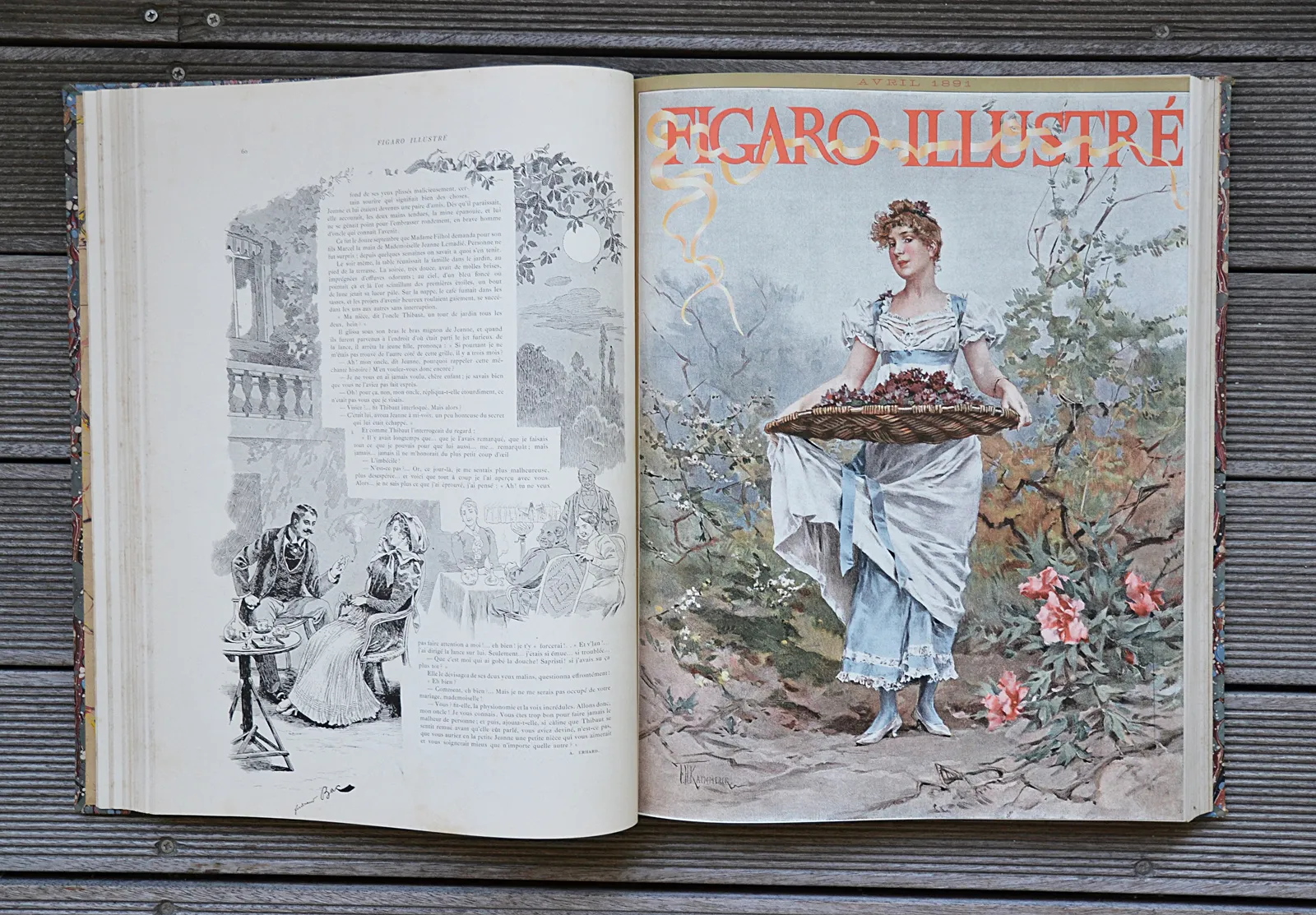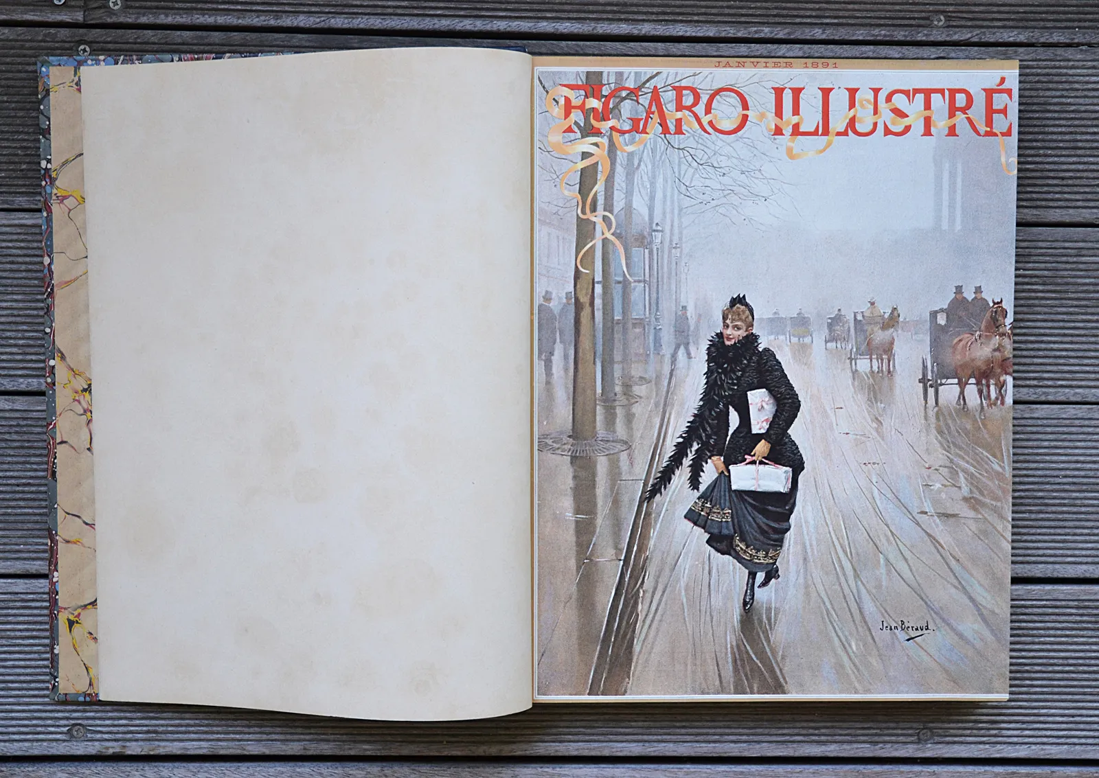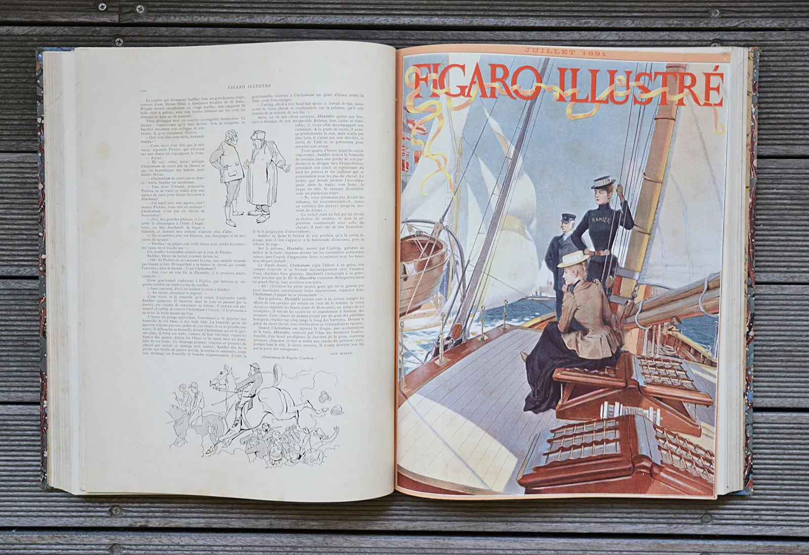 Douze numéros de 1891 en demi-basane bleue, illustrés de nombreux dessins en couleurs par Jean Béraud, Steinlen, Eugène Grasset, Caran d'Ache et Madeleine Lemaire.