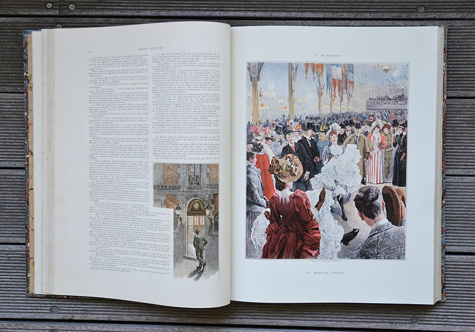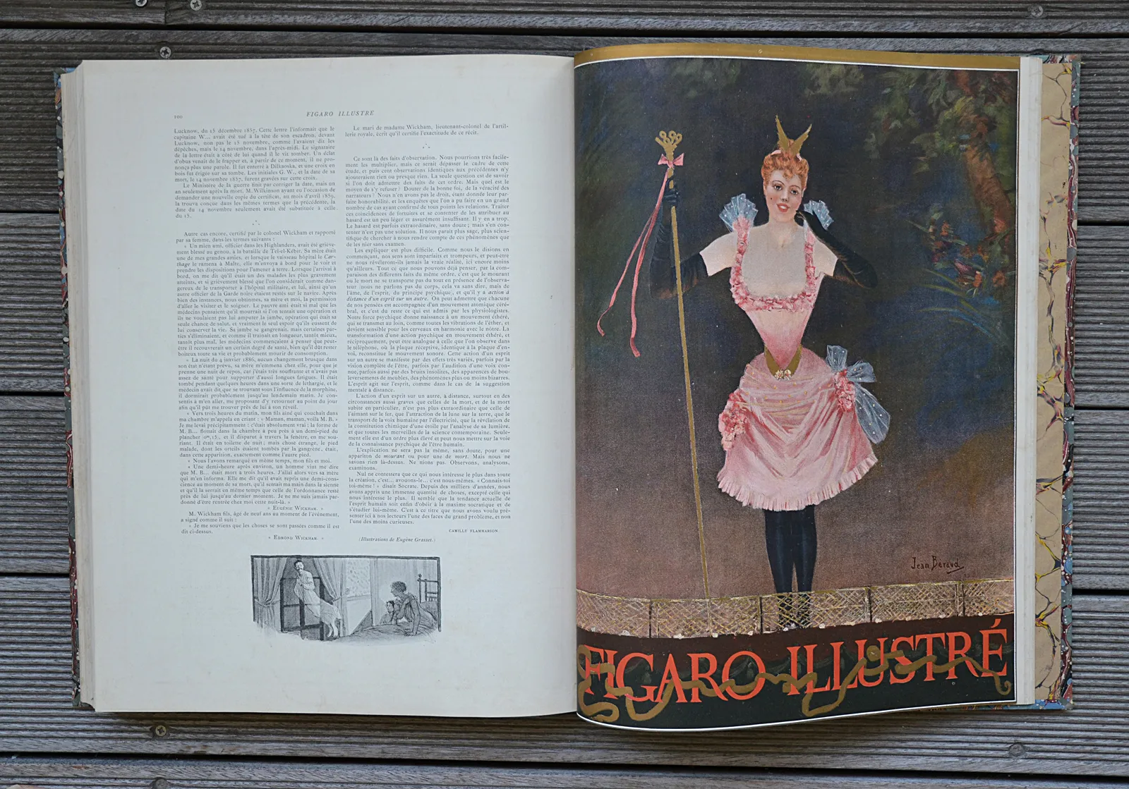 Bel exemplaire, illustré de nombreux dessins en couleurs et en noir (Jean Béraud ; Eugène Grasset ; Steinlen ; Seïki Korouda ; Madeleine Lemaire ; Crafty ; Maurice Leloir ; Fraipont ; F. de Myrbach, Caran d’Ache, etc.).