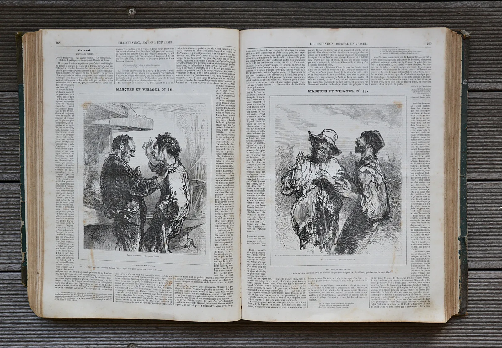 Très nombreuses gravures dans le texte : travestissements par Marcelin, petits métiers parisiens, faits de société, relations de voyages, etc. A noter 20 caricatures par Gavarni (Masques et visages).