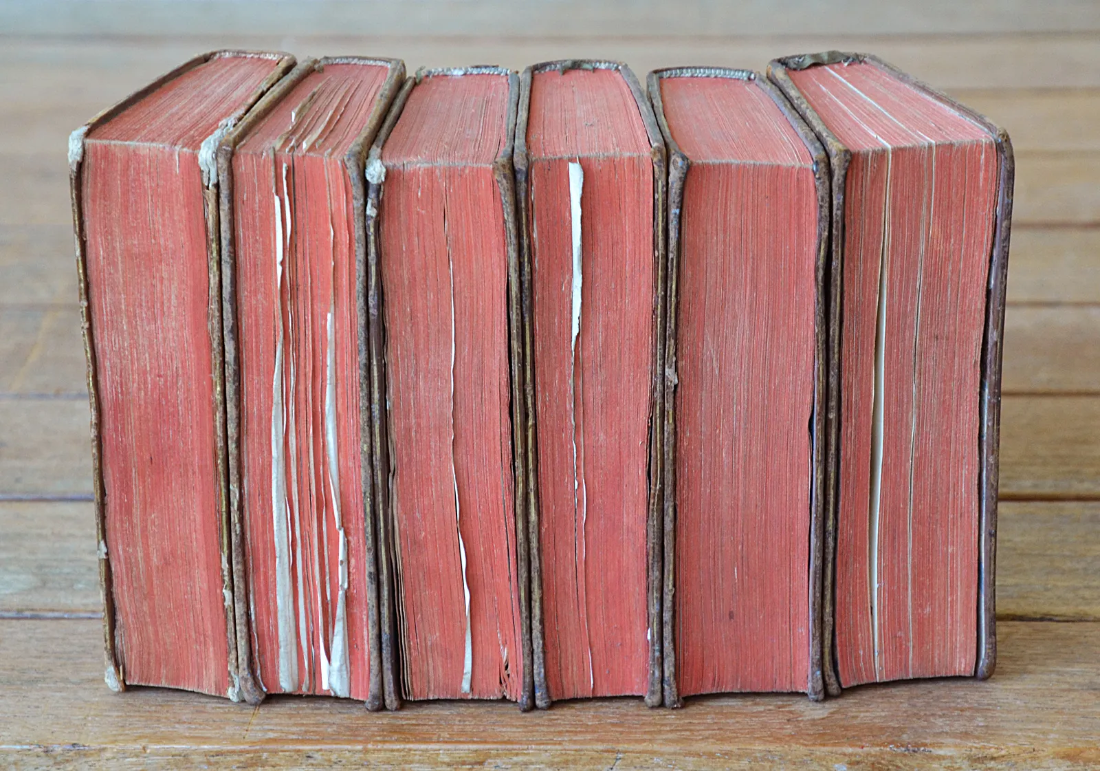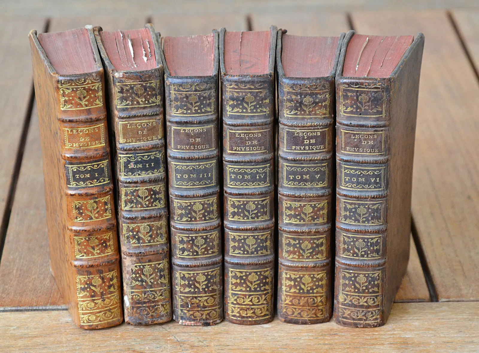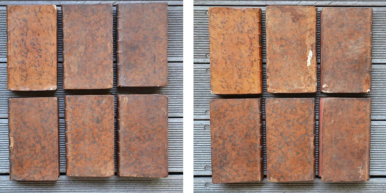 Quelques épidermures & accrocs, notamment sur les plats du T2 et 2 coiffes ; petits trous de ver sur les dos des T2 & T6 ; coupes et coins frottés ; une planche déchirée avec un morceau détaché dans le T6 (p. 250).