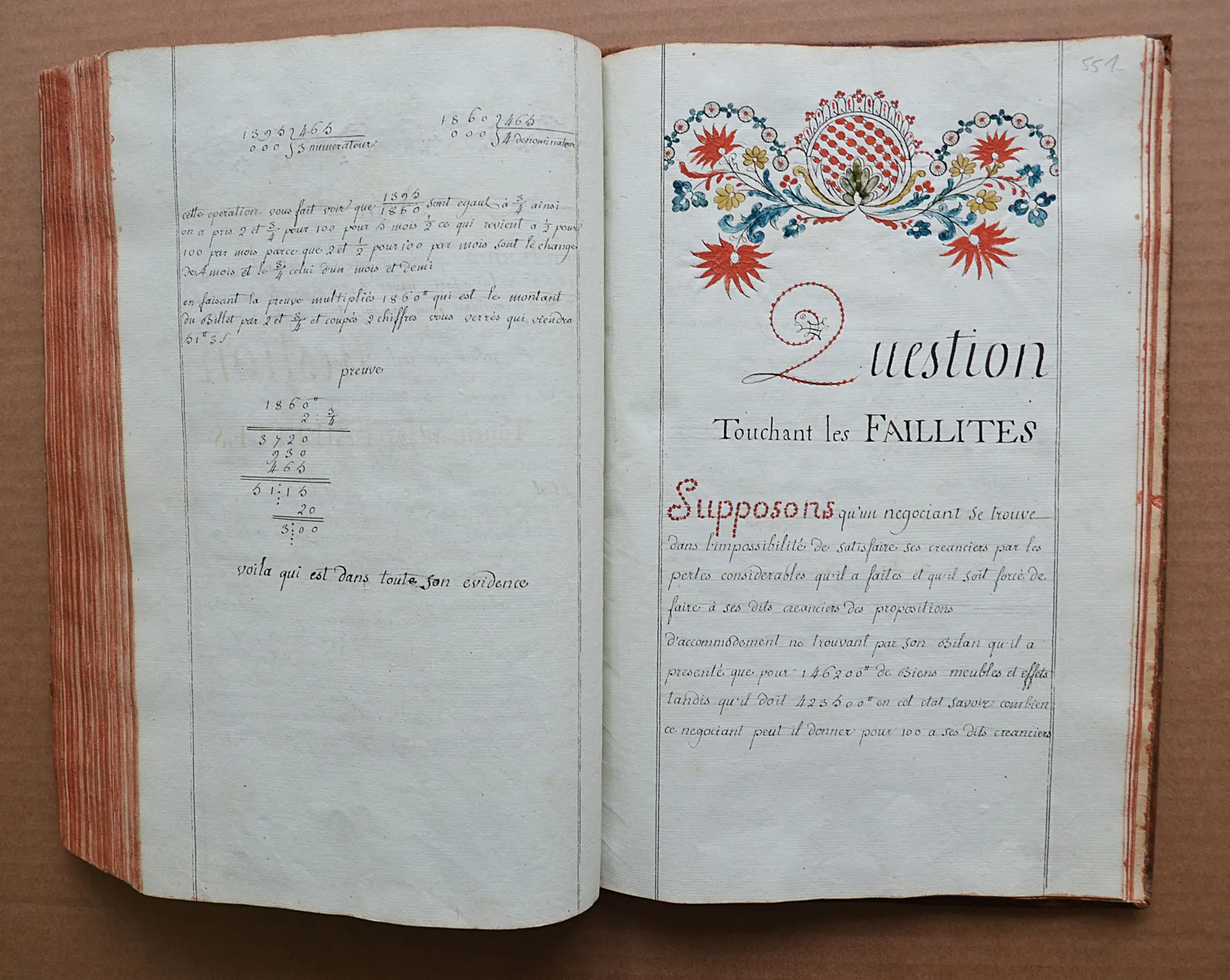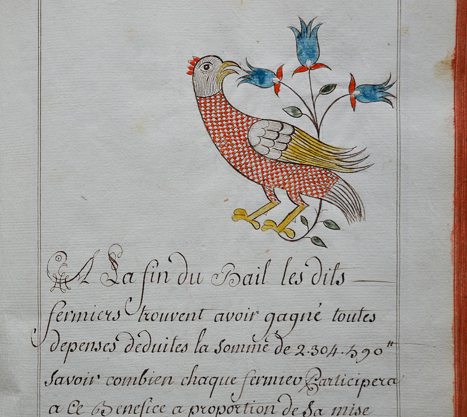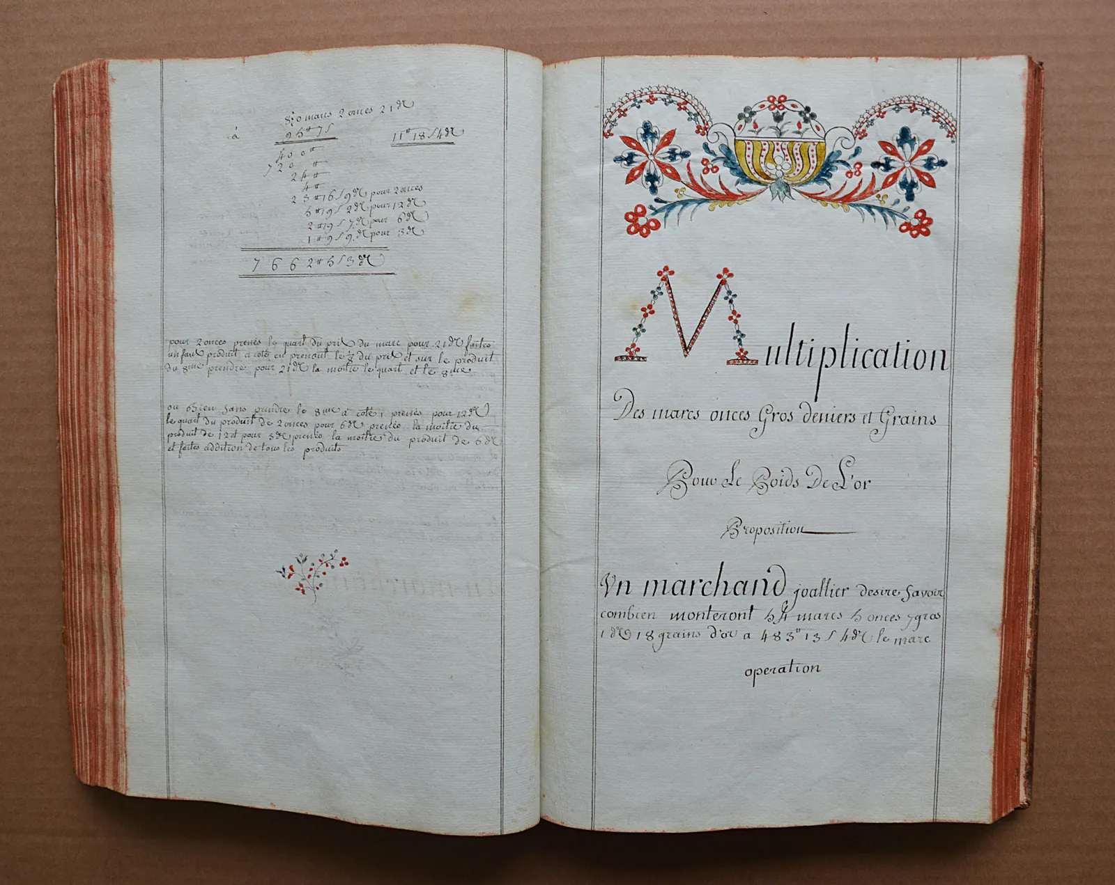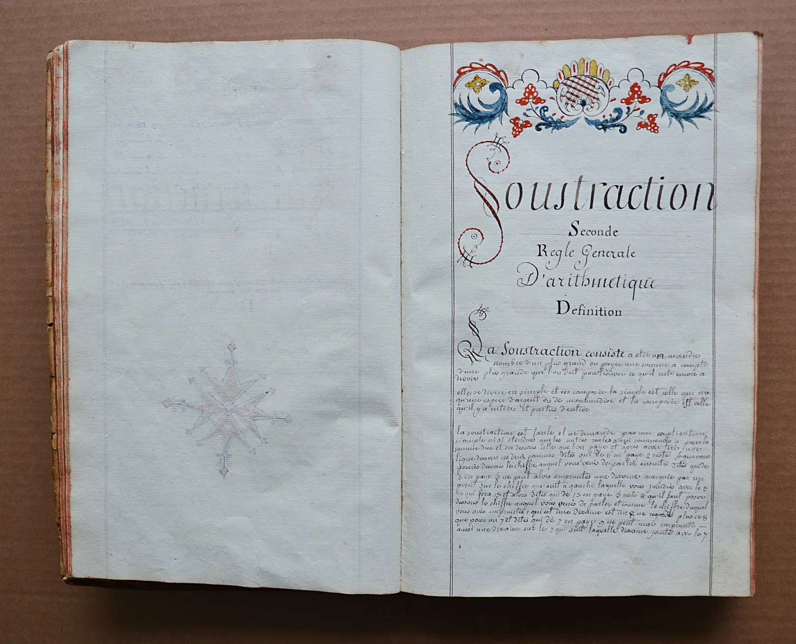 Manuscrit d’arithmétique, avec une écriture parfaitement lisible, et richement décoré de centaines de dessins à l’aquarelle par le jeune élève Jean-Antoine Bêch (portrait de Louis XVI sur le titre, décors floraux, oiseaux, animaux, scène de chasse, etc.).