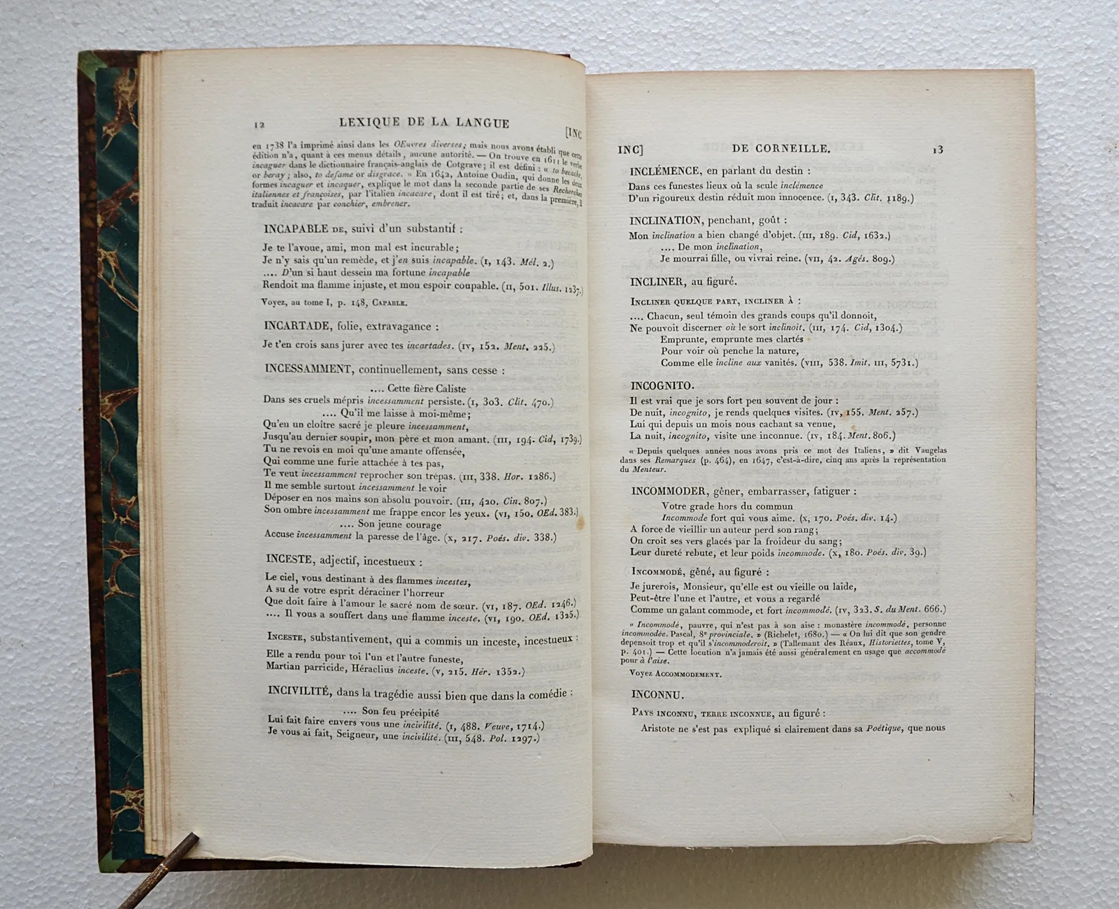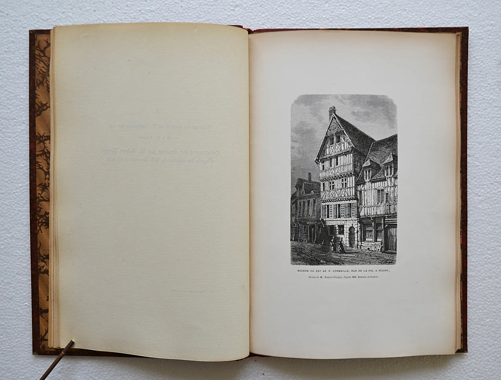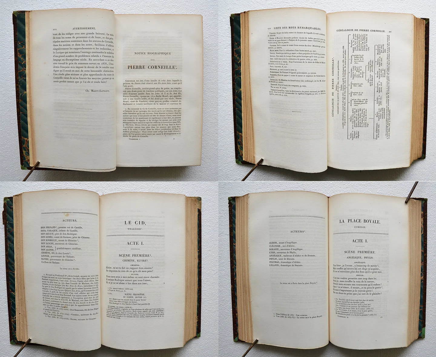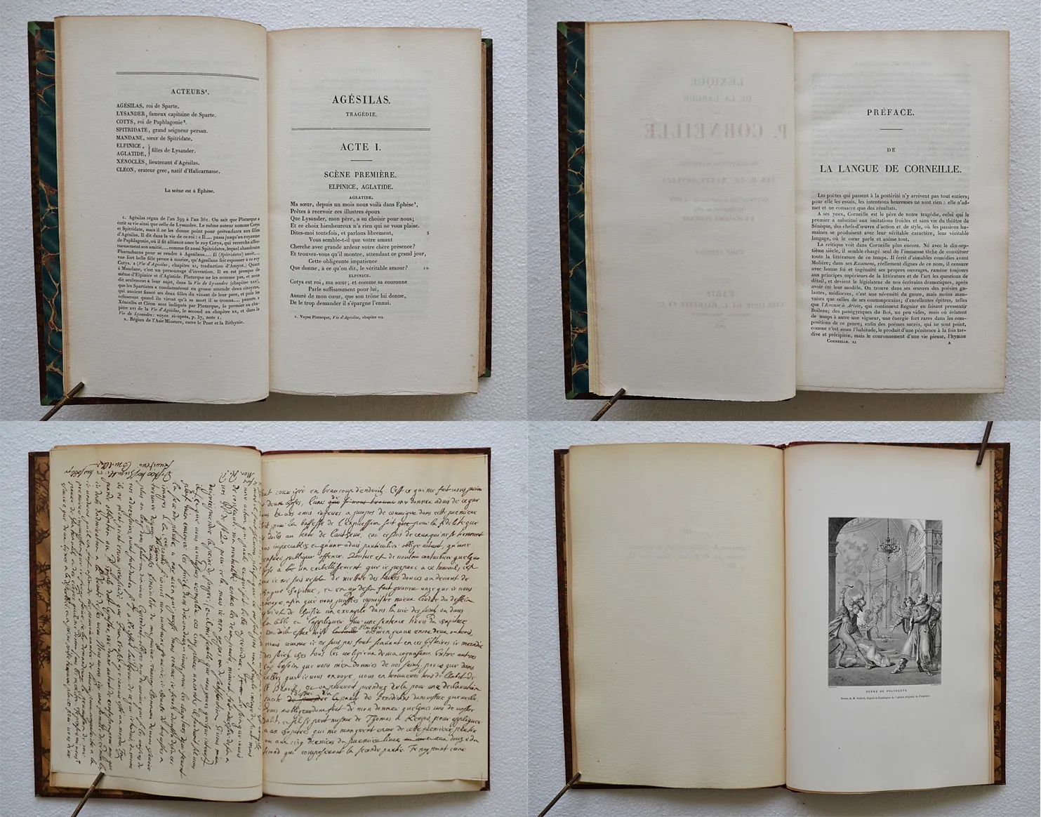 Nonobstant les défauts signalés ci-dessus, il s’agit d’un bon exemplaire sur papier vergé, bien complet du très rare album in-4 avec les serpentes légendées (un portrait et les armories de Pierre Corneille ; 2 lettres en fac-similés ; 3 planches d’habitations et les 5 dernières concernant les théâtres, les décorations et les costumes).