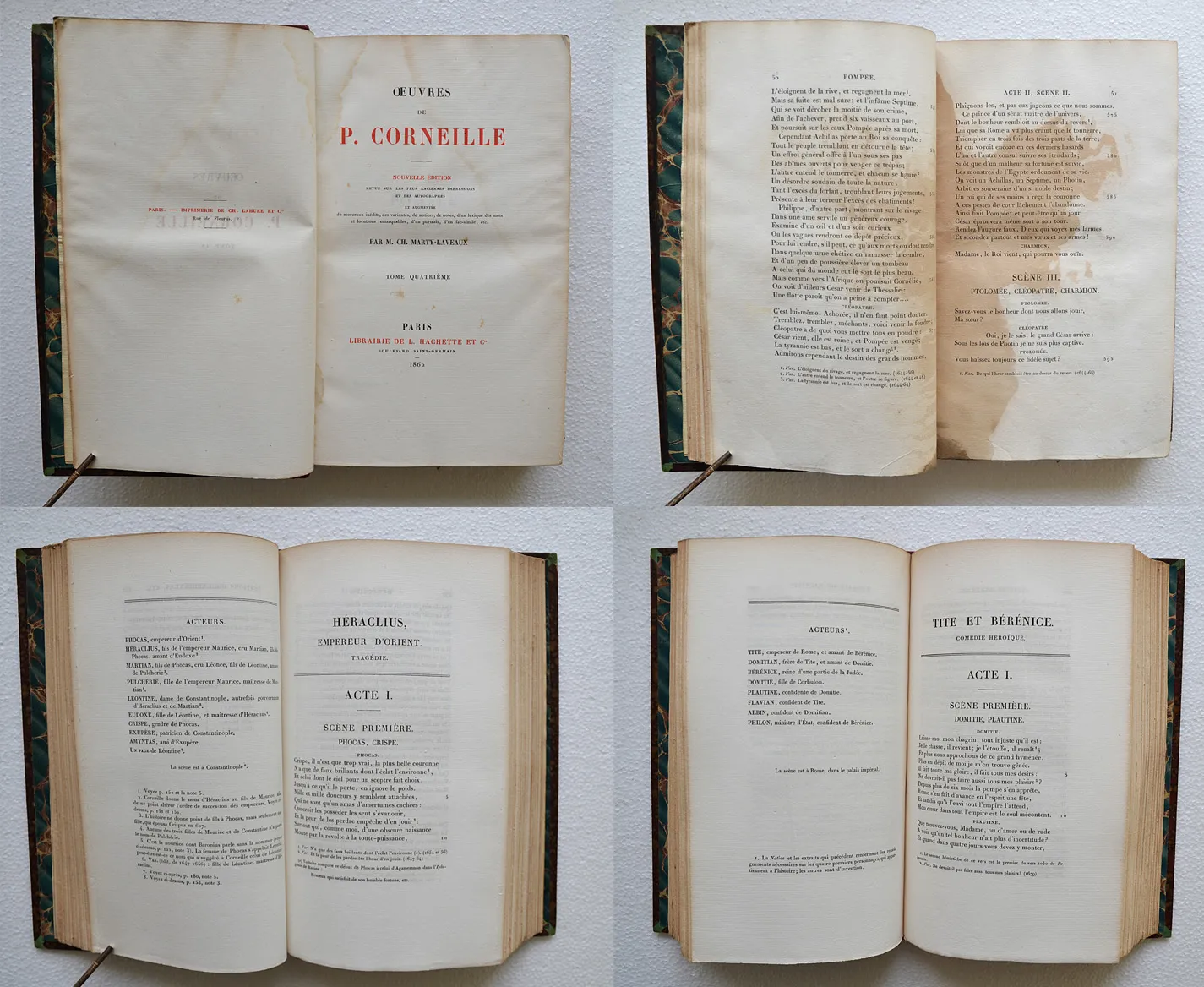 Accrocs sur trois coiffes ; des épidermures, notamment sur les charnières de l’album ; petite fente, sans gravité, sur plusieurs mors ; traces de mouillures dans le texte et taches brunes sur 5 feuillets dans le T4, cf. deux photos ; rousseurs éparses ; décoloration sur les dos (ancienne trace d’étiquette de bibliothèque).