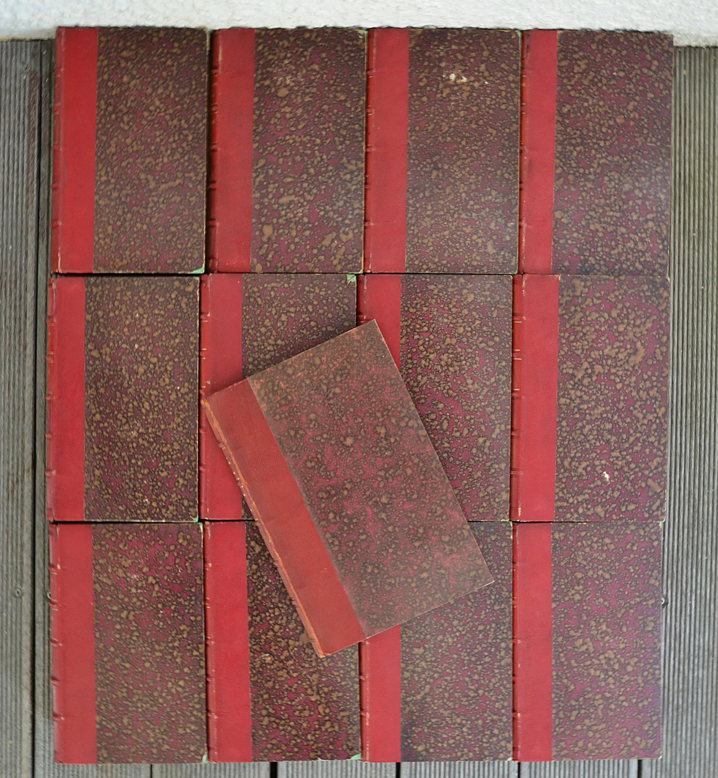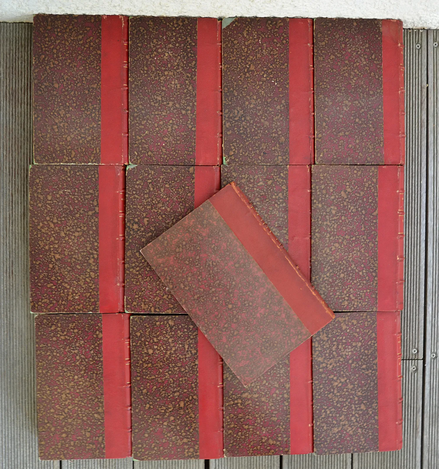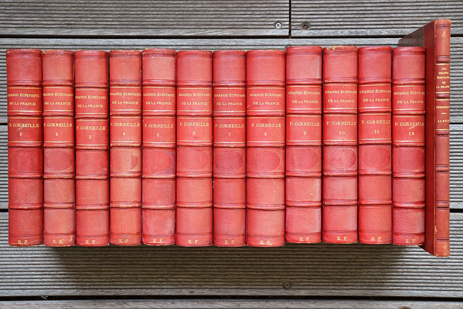 12 volumes in-8 (15 x 23 cm.) + 1 album in-4 (18 x 26,5 cm.), demi-chagrin rouge, dos à nerfs ornés de filet dorés et à froid, initiales « E.F. » en queue de dos (reliure de l’époque).