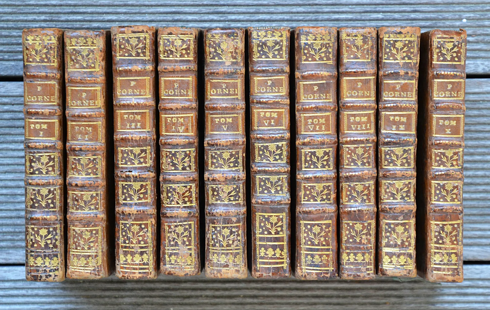 Dix volumes in-12 en veau fauve marbré d'époque, dos à nerfs ornés, tranches rouges, édition David de 1758 des oeuvres du Grand Corneille.