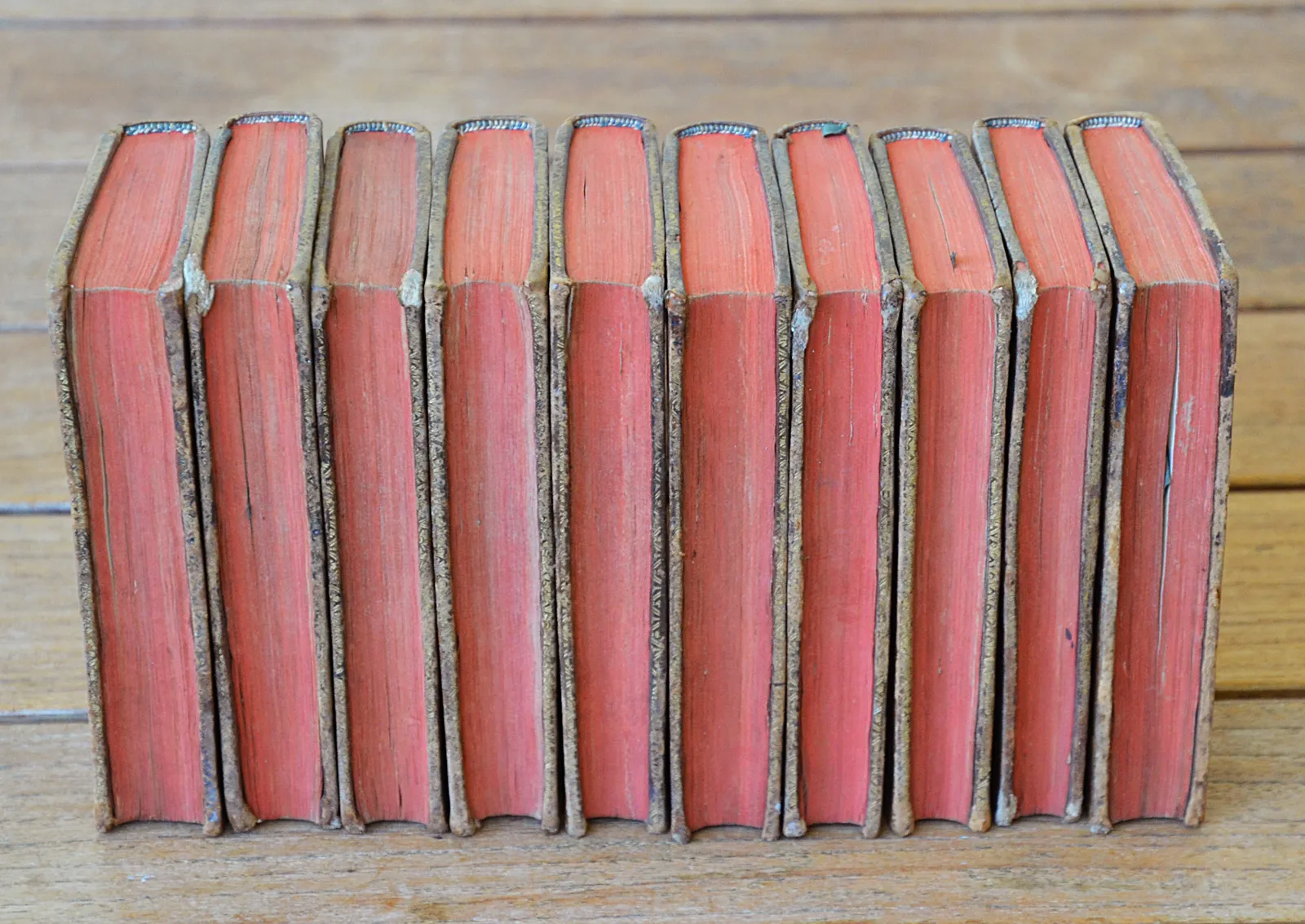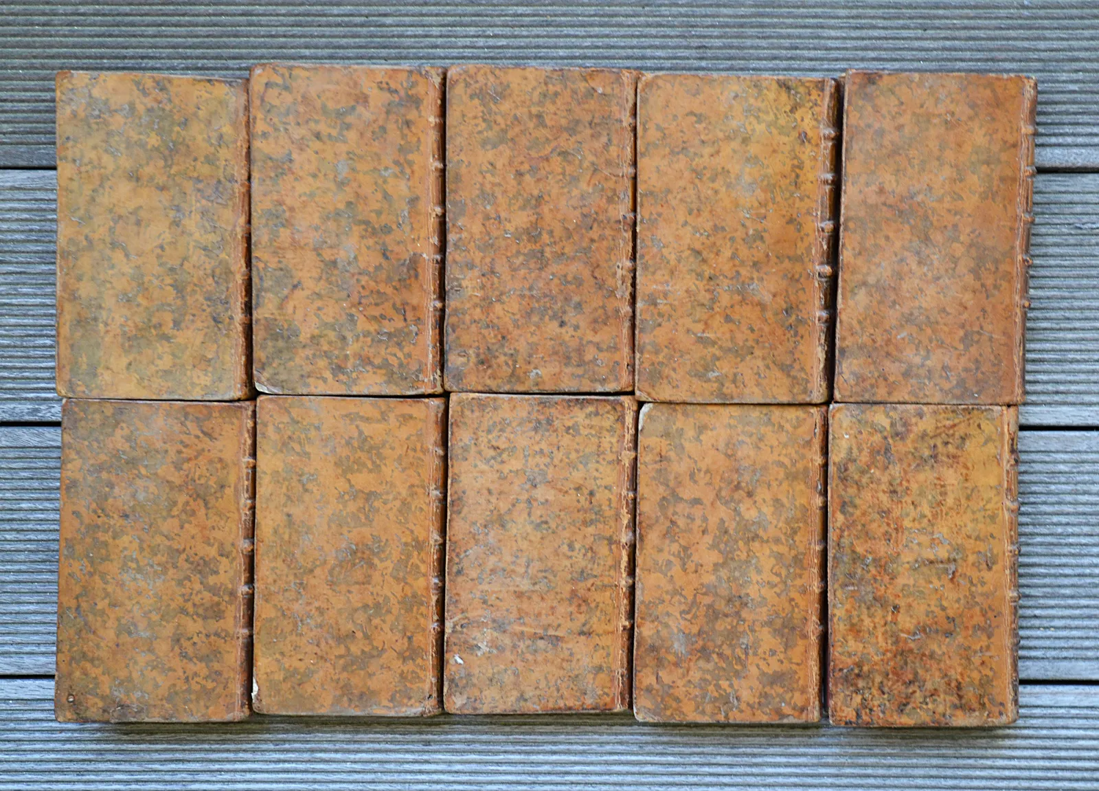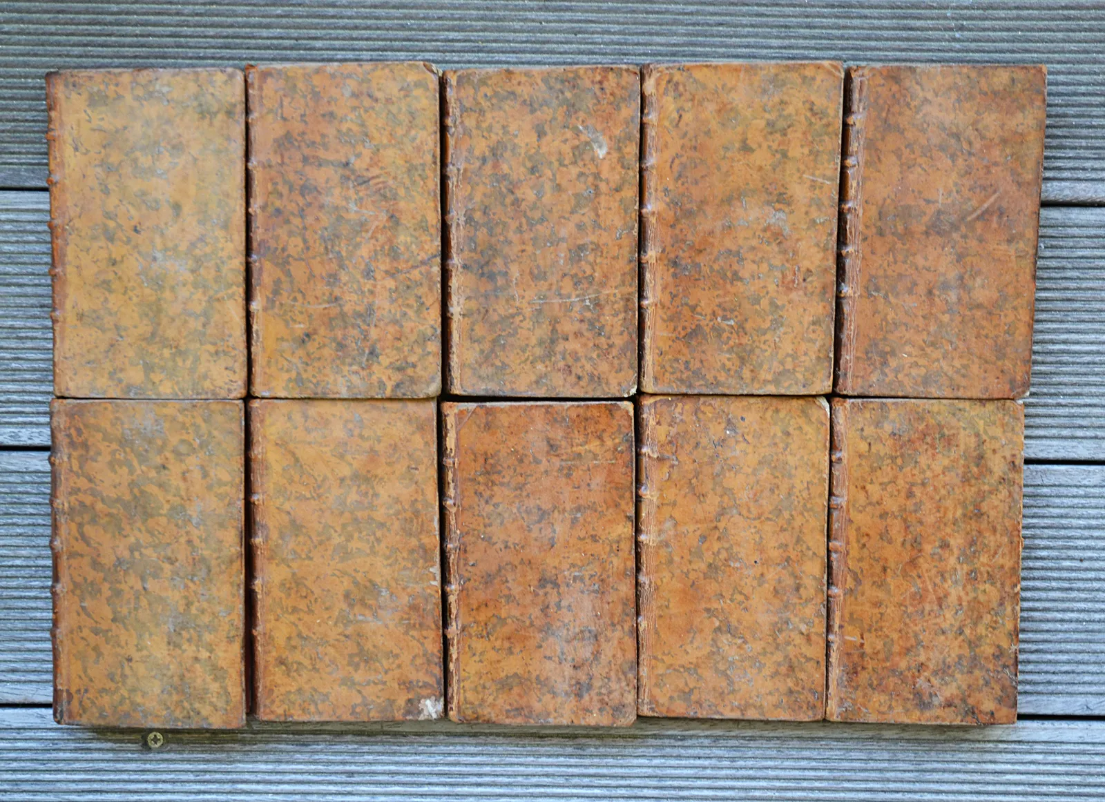 10 volumes in-12 (8,8 x 15 cm.), veau fauve marbré, dos à nerfs ornés, tranches rouges (reliure de l’époque).