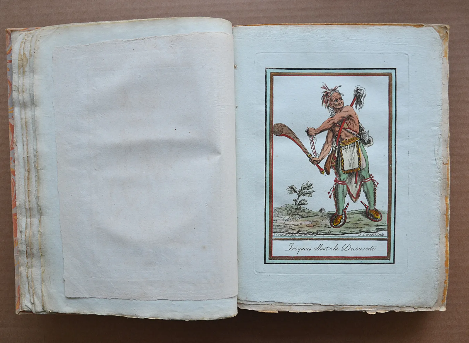 « L’ouvrage format grand in-4°, superbe papier, complet & terminé, formera 4 volumes en 48 livraisons. Chaque livraison aura six figures dessinées caractéristiquement représentant les costumes, gravées avec soin & peintes dans les couleurs adoptées par chaque nation, toutes ornées de filets d’or, accompagnées de l’histoire des mœurs, coutumes & usages de chaque peuple.