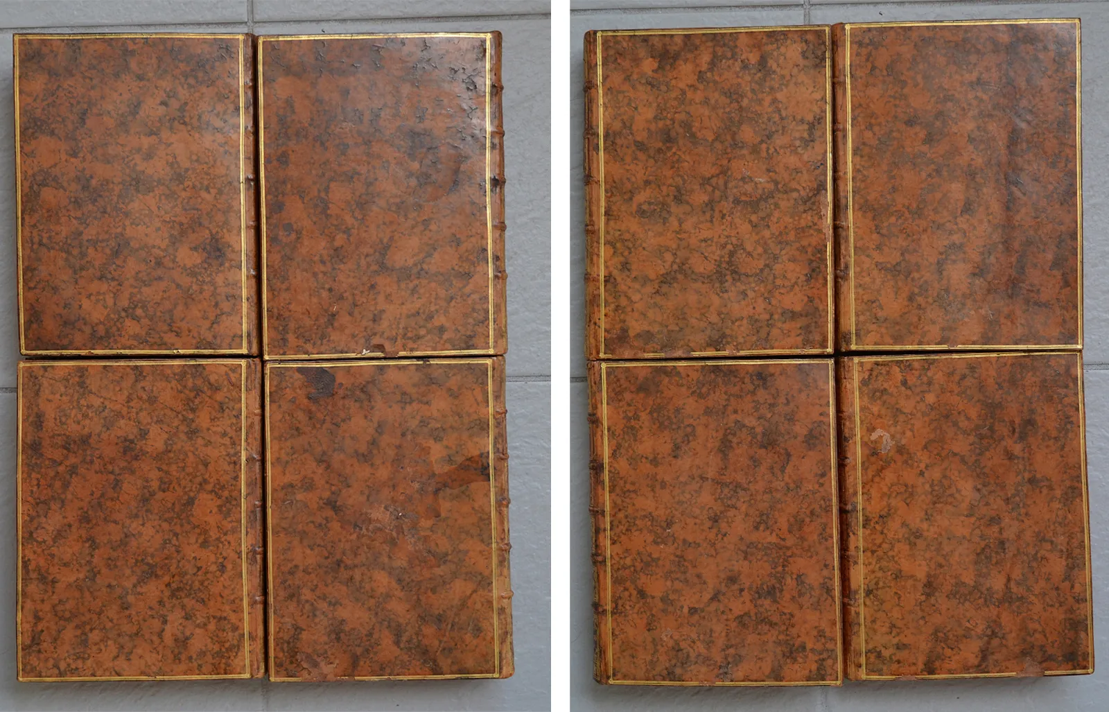 A La Haye, chez Pierre Gosse, & Isaac Beauregard, 1742. Quatre volumes in-4 (19,5 x 25,5 cm.) de : (1f.) – XVIII – 656 pp. + (1f.) – VIII – 755 pp. + (1f.) – 746 pp. + (1f.) – 624 pp. ; veau fauve marbré glacé de l’époque, triple filet d’encadrement doré sur les plats, double filet doré sur les coupes, dos à nerfs orné, pièces de titre & de tomaison en maroquin vieux rouge, tranches rouges (quelques épidermures et décolorations, sans gravité ; rousseur marginale titre du T4).
