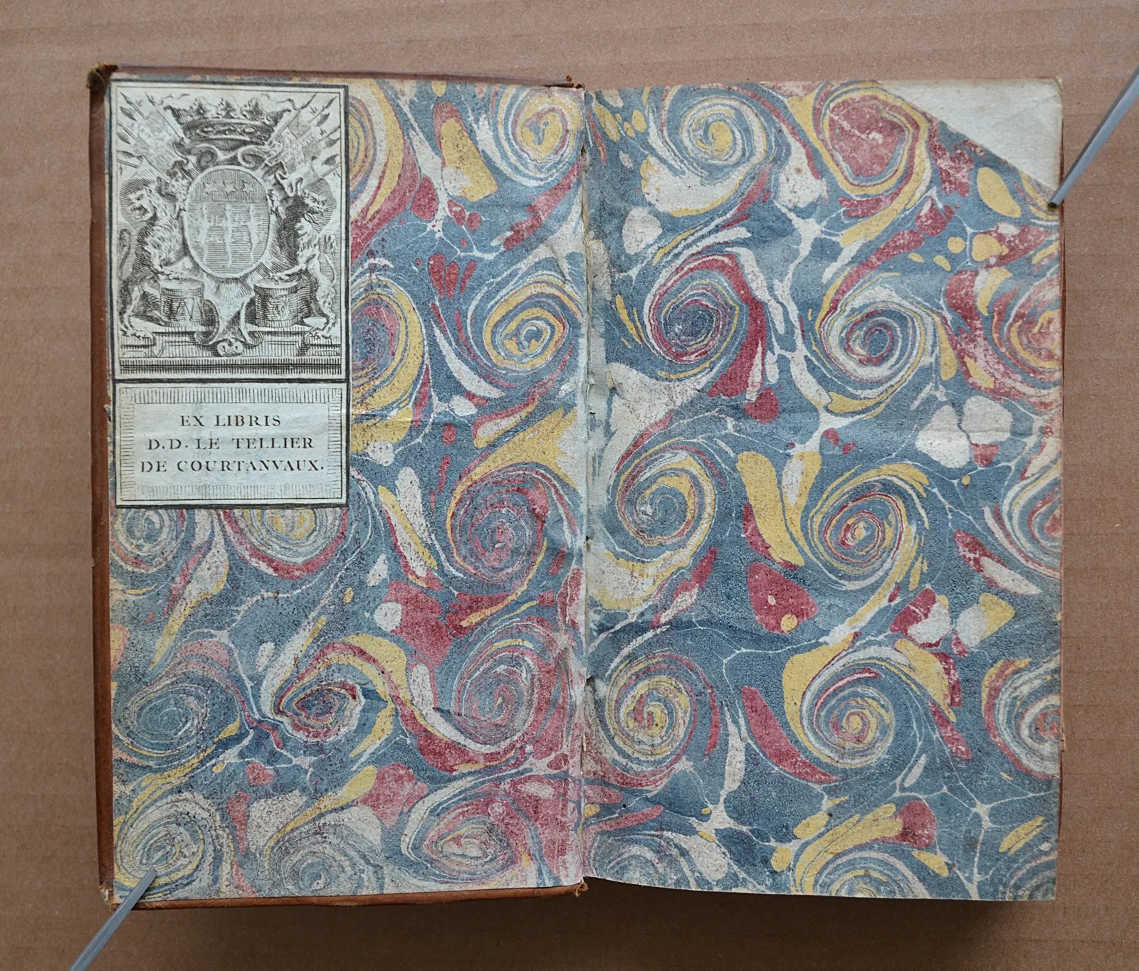 Appartenance : Le Tellier de Courtanvaux (François-César) (ex-libris héraldique collé sur les contregardes & tampon sur les titres).