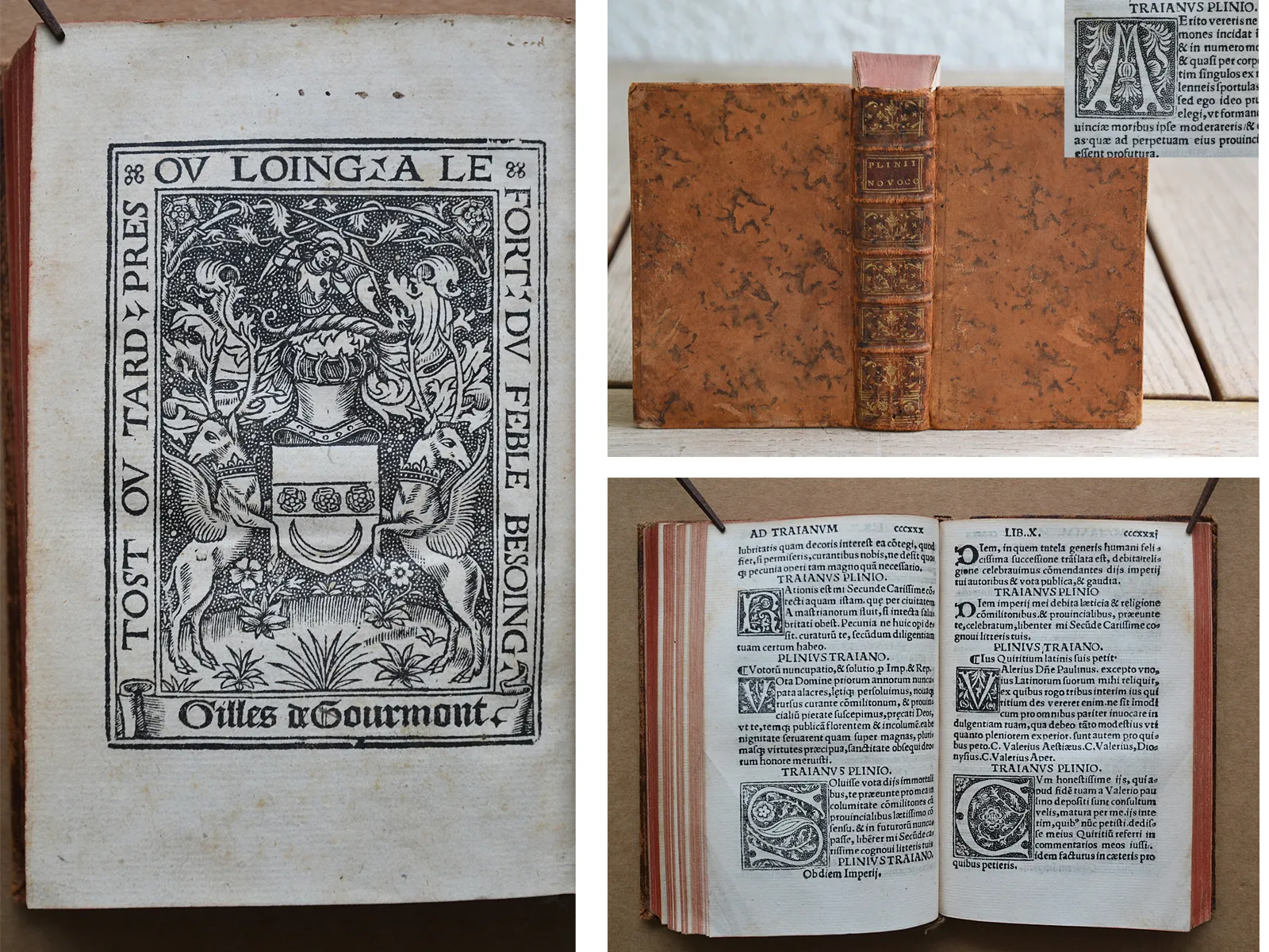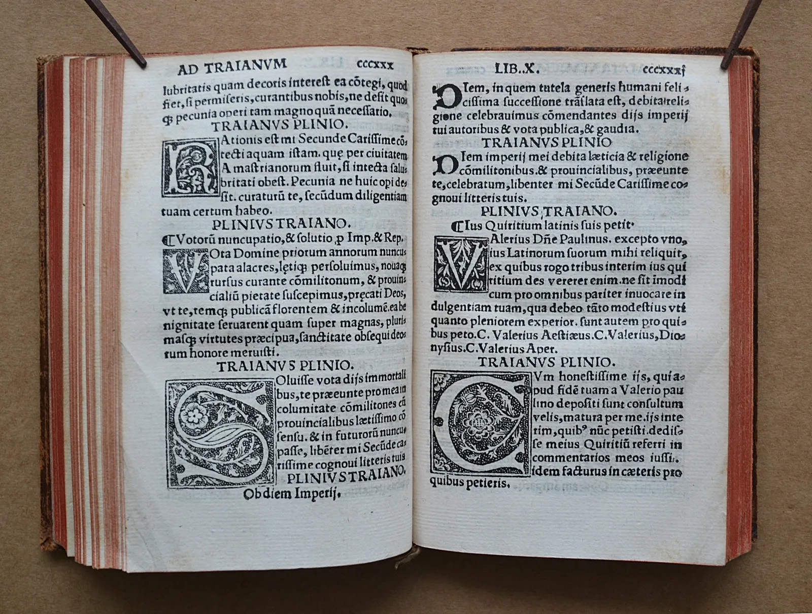 C. Plinii Secundi Novocomensis. Epistolarum libri decemquibus multæ habentur epistolæ non ante impressæ. Tum græca correcta, & suis locis restituta, atque rejectis adulterinis, vera reposita. Item fragmentatæ epistolæ, integræ factæ. In medio etiam epistole libri octavi De Clitumno fonte non solum vertici calx additus, et calci vertex, sed decem quoque epistolæ interpositæ, ac ex nono libro octavus factus, et ex octavo nonus, idque beneficio exemplaris correctissimi, & miræ, ac potius venerandæ vetustatis.