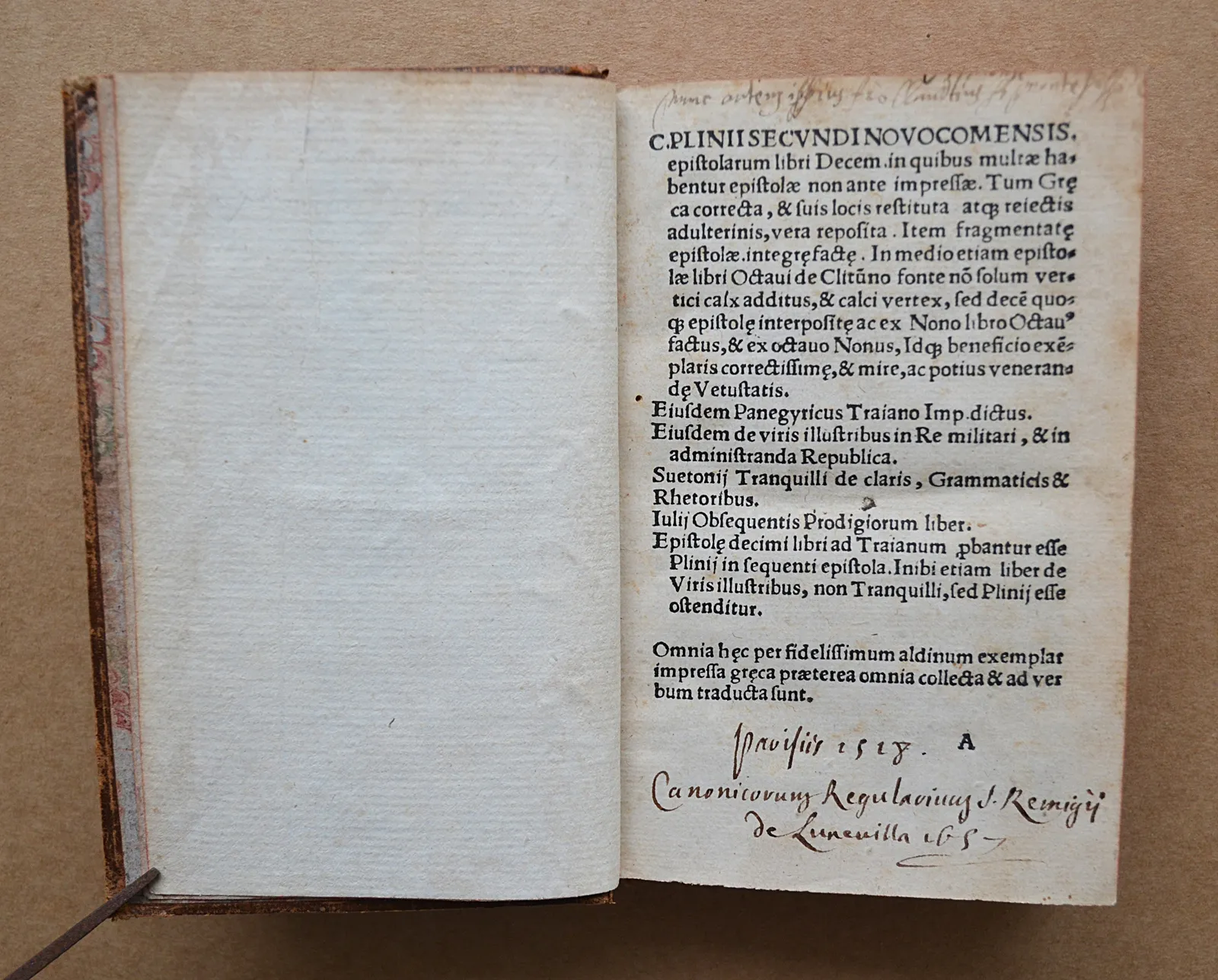 C. Plinii Secundi Novocomensis. Epistolarum libri decemquibus multæ habentur epistolæ non ante impressæ. Tum græca correcta, & suis locis restituta, atque rejectis adulterinis, vera reposita. Item fragmentatæ epistolæ, integræ factæ. In medio etiam epistole libri octavi De Clitumno fonte non solum vertici calx additus, et calci vertex, sed decem quoque epistolæ interpositæ, ac ex nono libro octavus factus, et ex octavo nonus, idque beneficio exemplaris correctissimi, & miræ, ac potius venerandæ vetustatis. Ejusdem Panegyricus Trajano imp. dictus. Ejusdem De viris illustribus in re militari, et in administranda republica. Suetonii Tranquilli De claris, grammaticis et rhetoribus. Julii Obsequentis Prodigiorum liber. Epistolæ decimi libri ad Trajanum probantur esse Plinii in sequenti epistola. Inibi etiam liber de viris illustribus, non Tranquilli, sed Plinii esse onditur. Omnoa haec per fidelissimum aldinum exemplar imressa greca preterea omnia collecta & ad verbum traducta sunt.