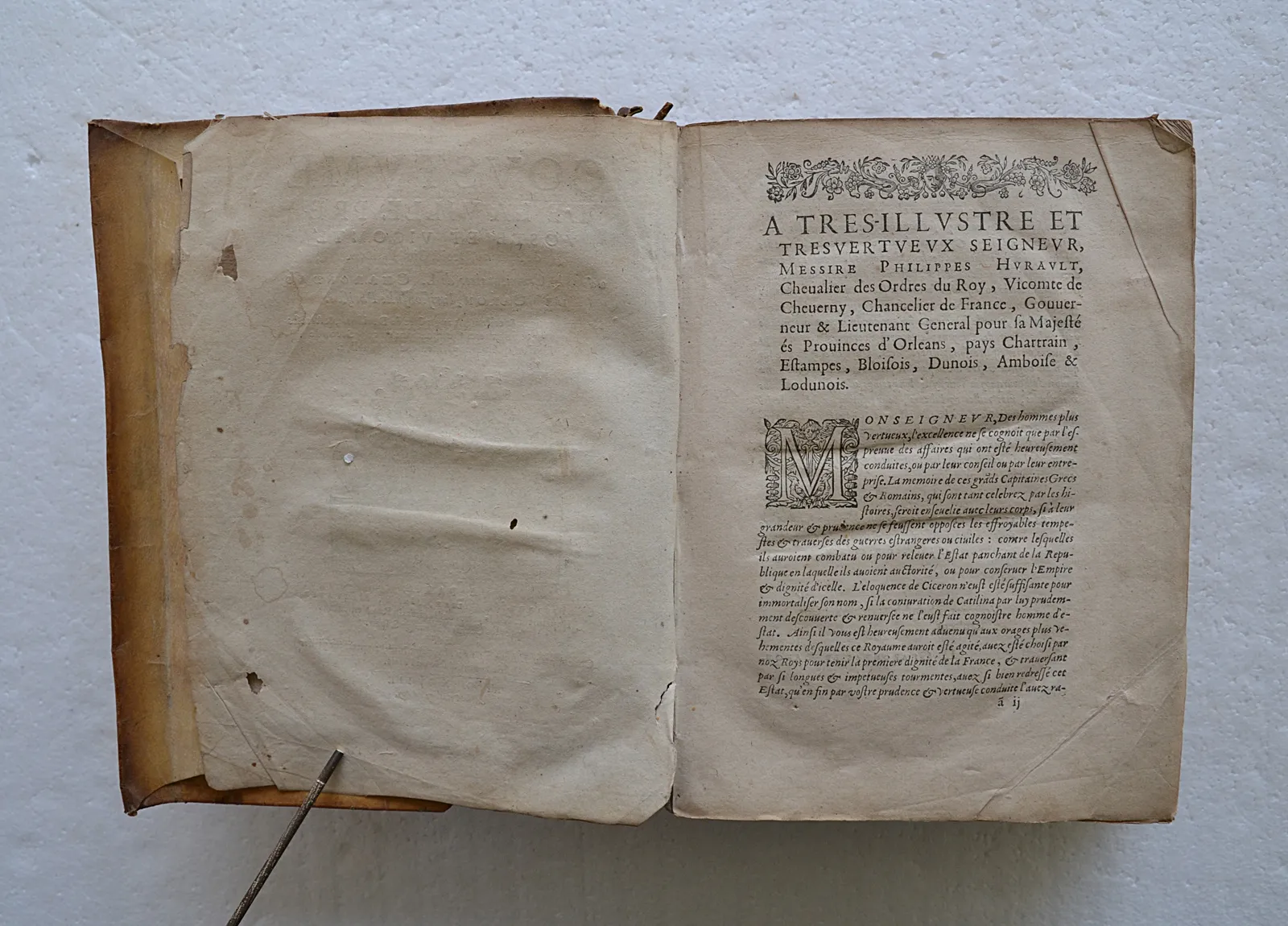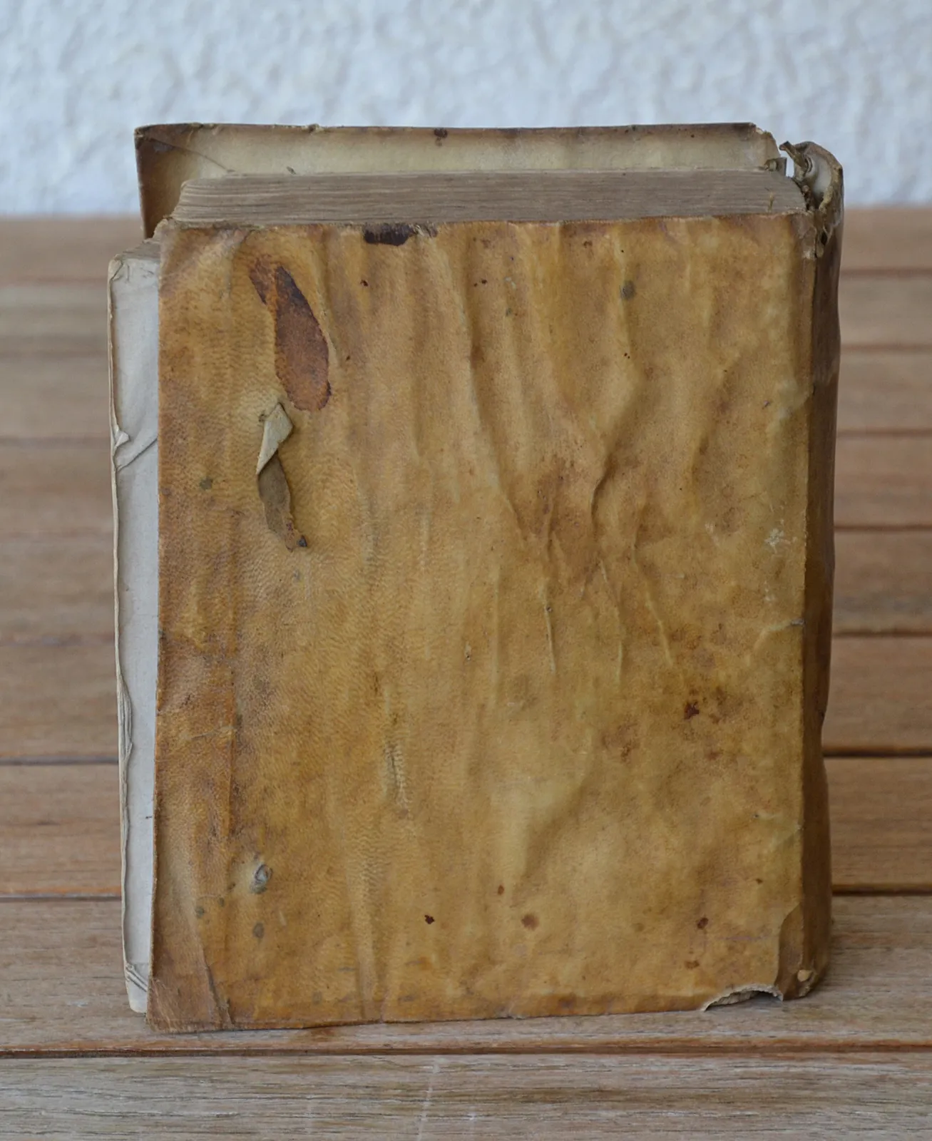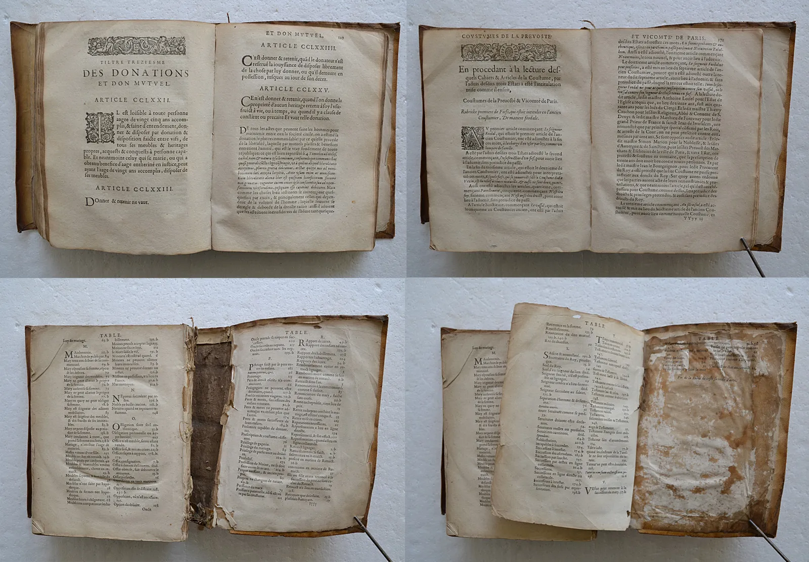 Cassures des coutures des charnières intérieures au niveau des contreplats, cf. photos ; un mors fendu ; le dernier feuillet de Table est collé sur le contreplat ; il manque 2 feuillets dans l’Avant-propos (a4 & e4).