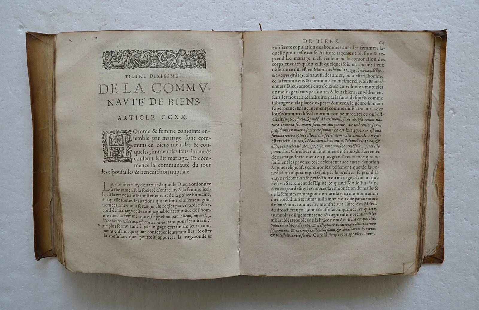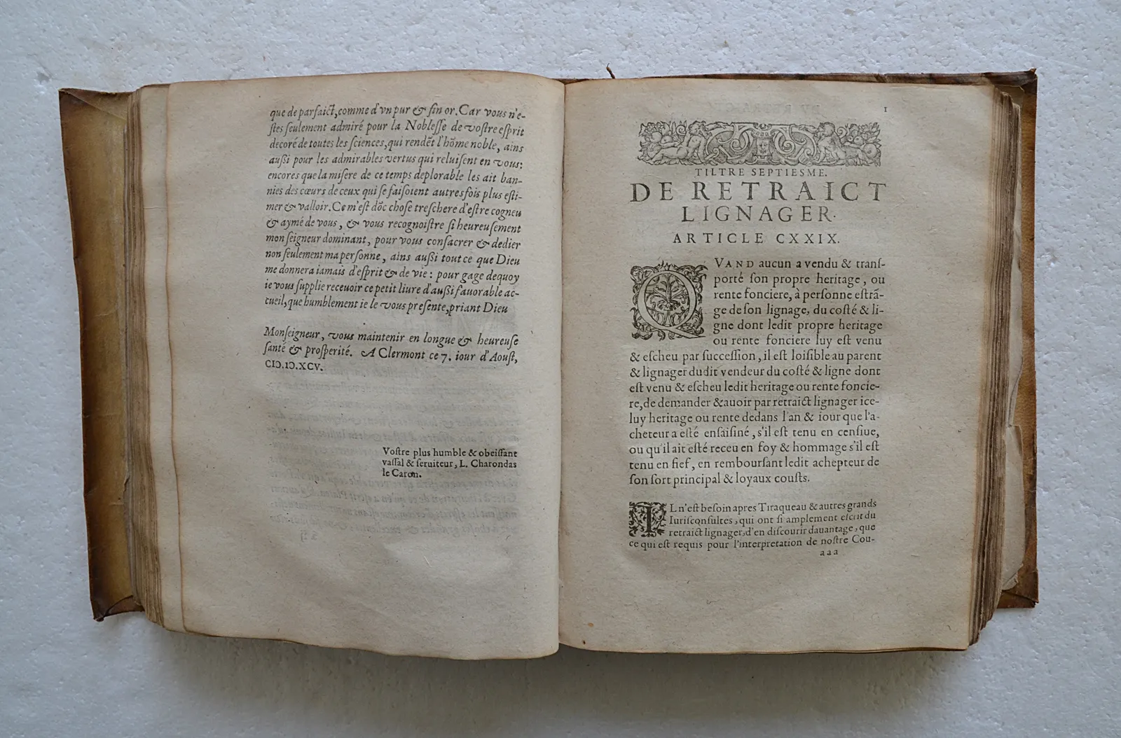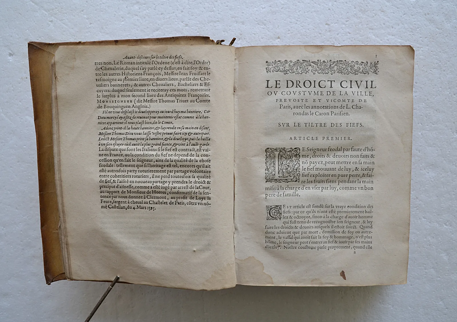 Rare seconde édition de 1598 dans son vélin d'origine, commentaire du droit civil parisien par Charondas Le Caron, juriste du XVIe siècle.