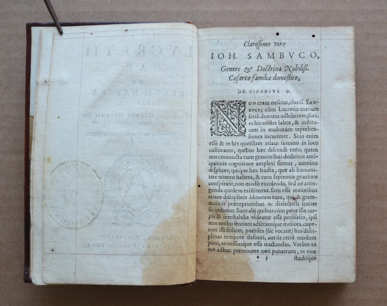 Magnifique exemplaire de cette impression plantinienne réglée du De rerum natura, qui constitue une traduction de la doctrine d’Épicure, dans une rare et spectaculaire reliure aux petits fers dorés de l’époque.