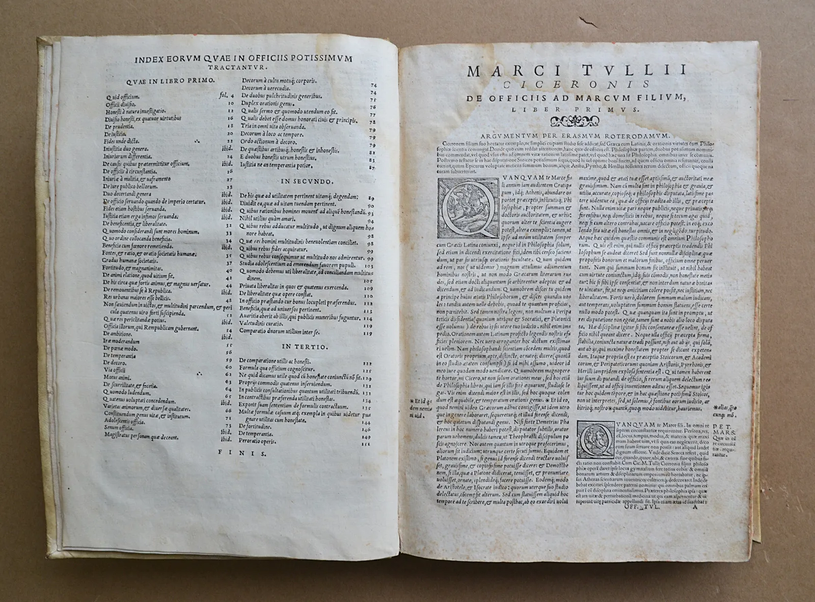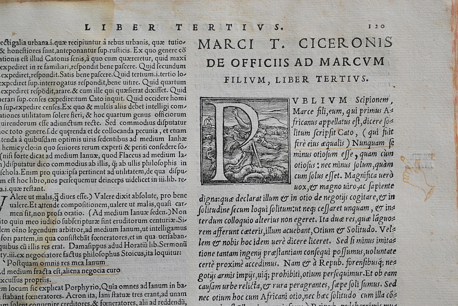 Très bel exemplaire du « Traité des devoirs », ouvrage politique de Cicéron traitant de l’éthique. Paru plusieurs mois après la mort de Jules César, en 44 av. J.-C., il est adressé par Cicéron à son fils Marcus.
