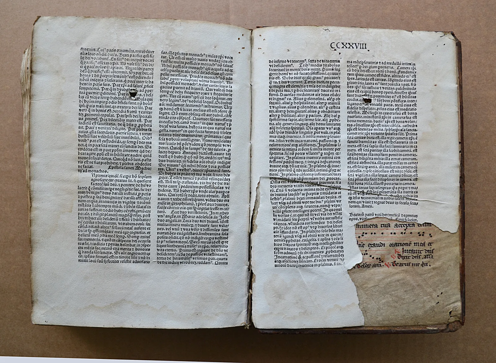 Rarissime incunable lyonnais de 1483 en veau brun sur ais de bois, gardes manuscrites du XVe siècle à lettrines peintes en rouge et bleu.