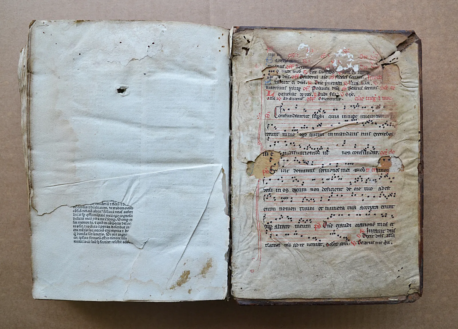 Pertes de cuir sur la reliure, notamment sur les extrémités du dos ; fermoirs absents ; marge angulaire supérieure fragilisée avec des pertes de papier au niveau des quatre premiers feuillets et de quelques feuillets dans le texte ; traces de mouillures ; 3 déchirures, sans perte de texte ; une perforation dans les quatre derniers feuillets.
