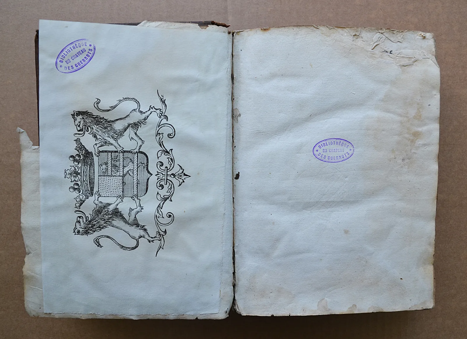 Provenance : Bibliothèque du château des Guerrots (ex-libris héraldique de Stanislas Le Filleul des Guerrots collé sur le premier feuillet blanc et timbre humide sur l’ex-libris et le second feuillet blanc).